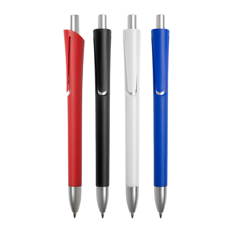 Plástico. Bolígrafo con cuerpo plástico de color, botón pulsador y punta color plata. Tinta azul.