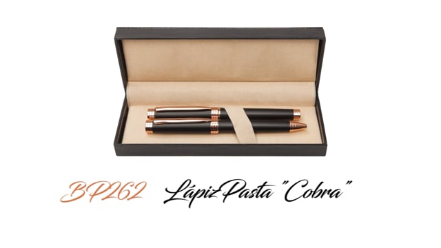 Metal. Set de bolígrafo y Rollerball. Cuerpo negro. Detalles en clip y punta color cobre. Decape electro cobre en la tapa para grabado láser, lo que permite que las letras o logo se vean en color cobre igual a los detalles del producto (grabado exclusivo en nuestro taller). Tinta azul. Presentación en caja de regalo.