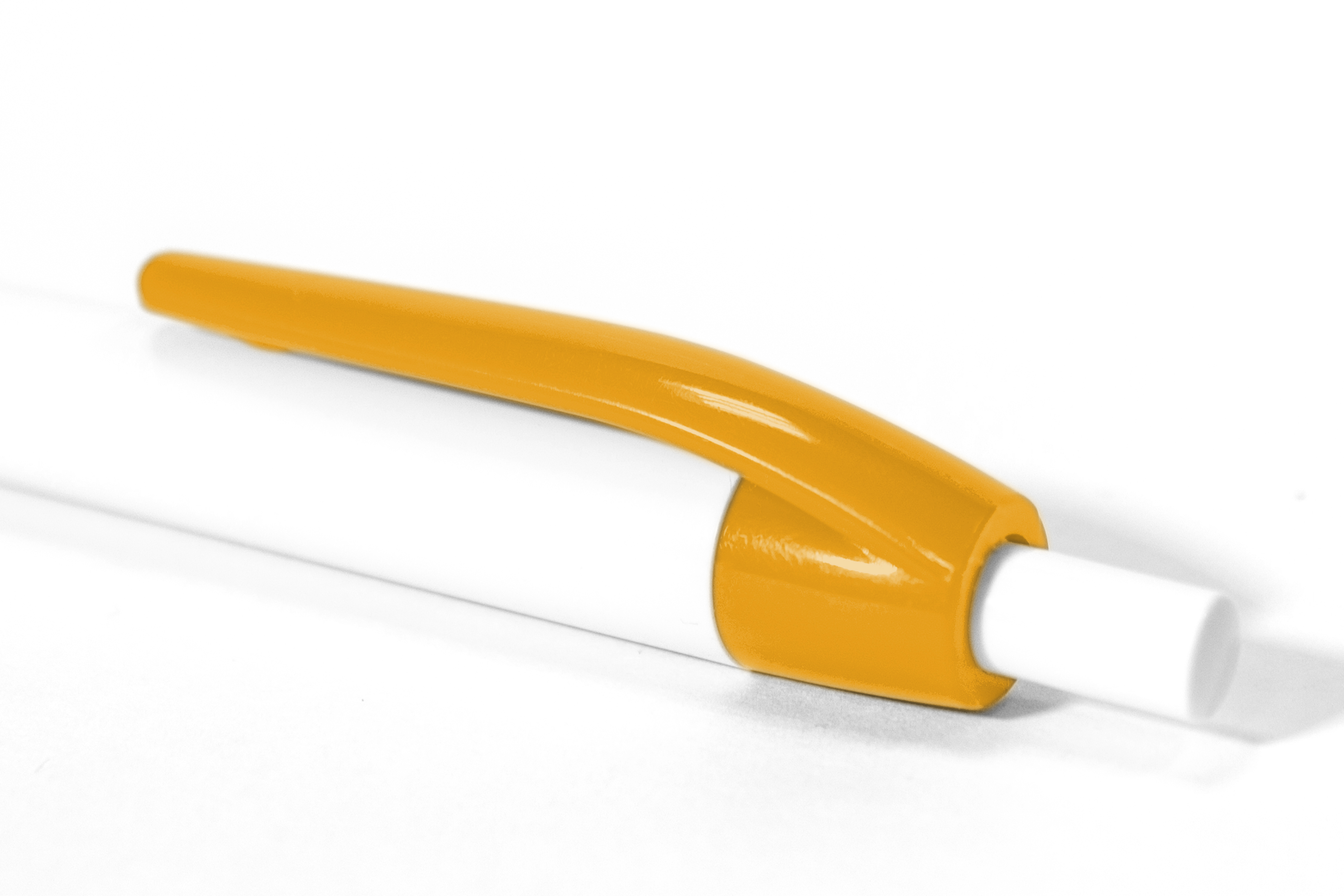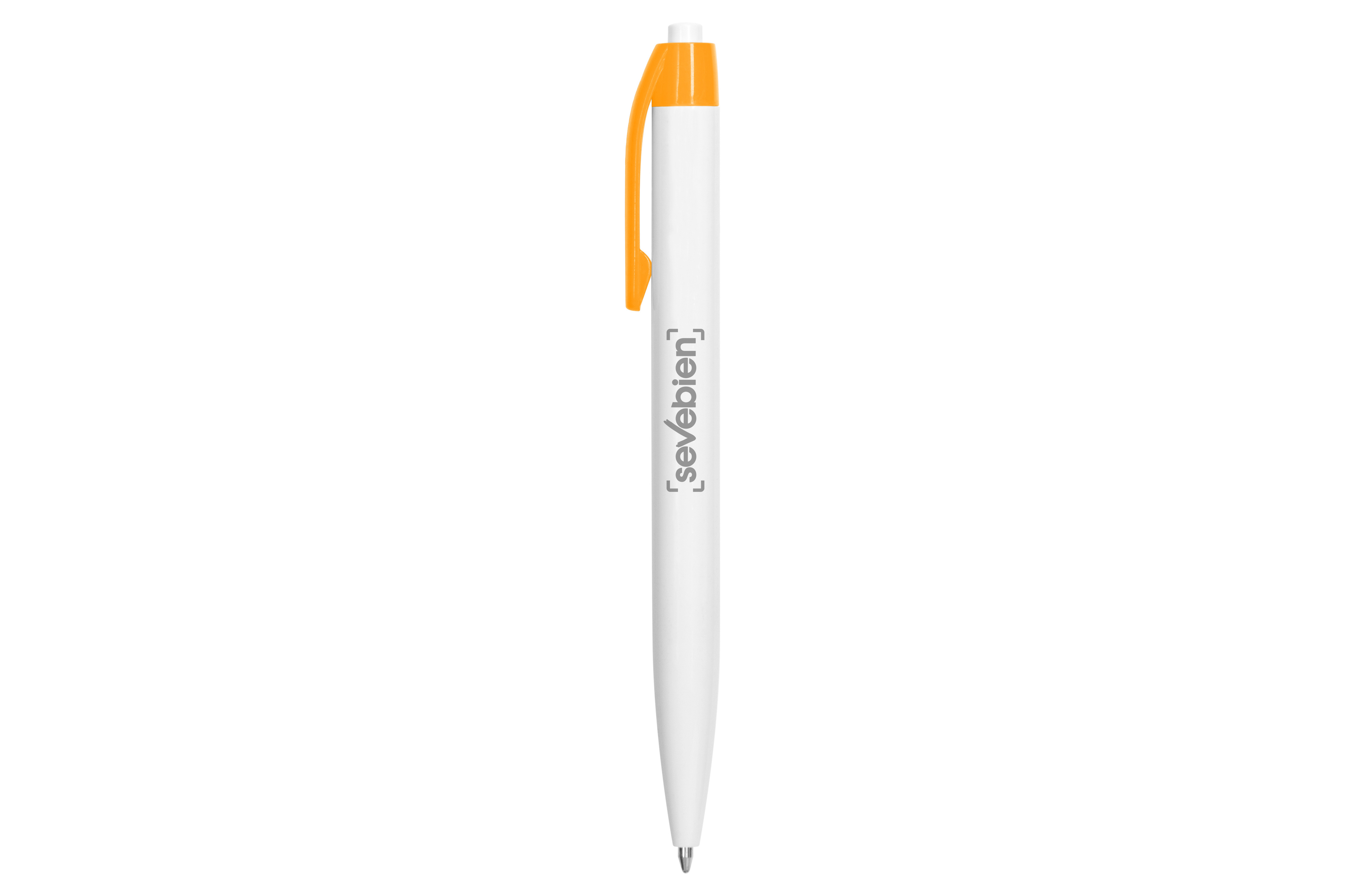 Plástico. Bolígrafo con pulsador. Cuerpo plástico de color blanco y clip de color. Tinta azul