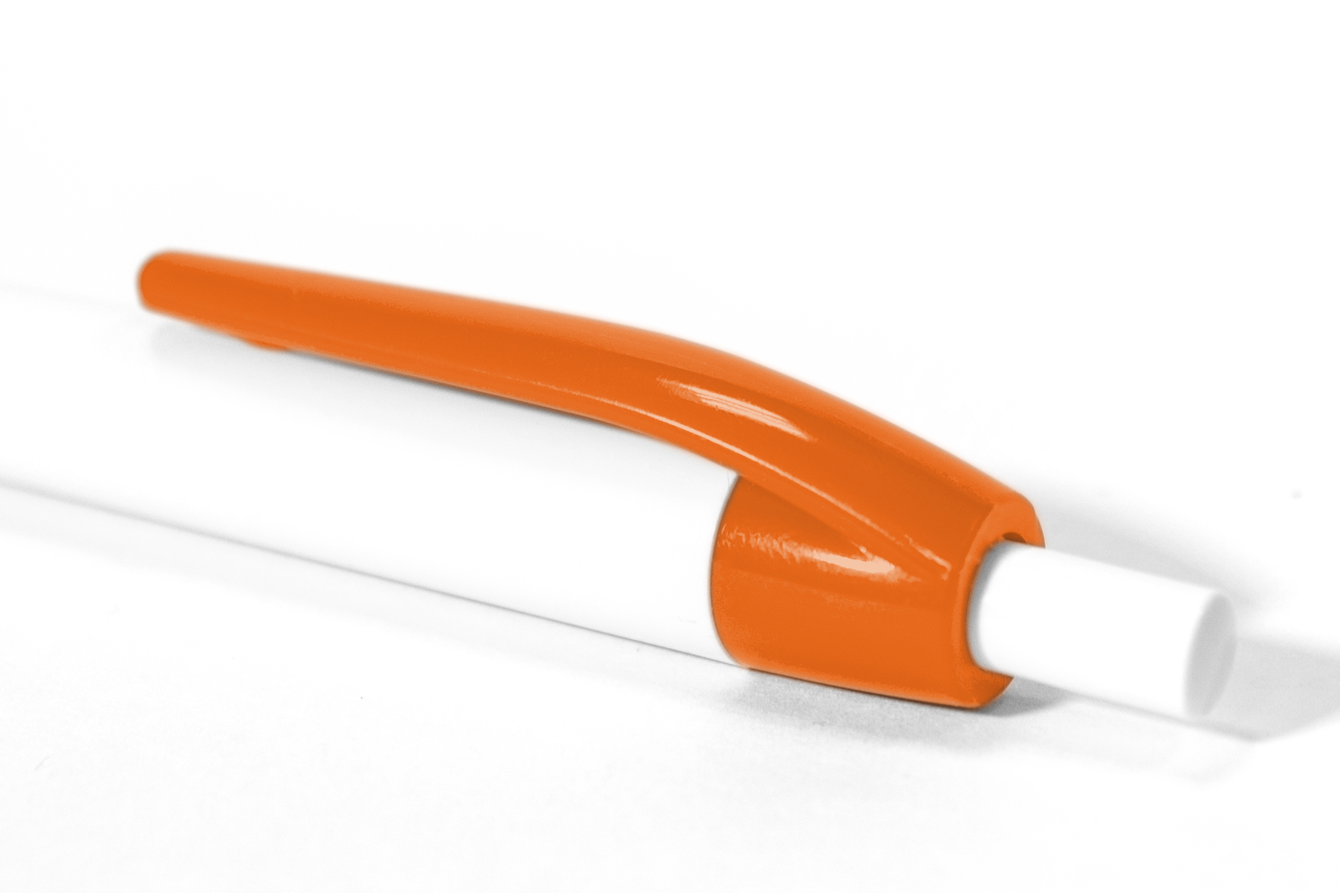 Plástico. Bolígrafo con pulsador. Cuerpo plástico de color blanco y clip de color. Tinta azul