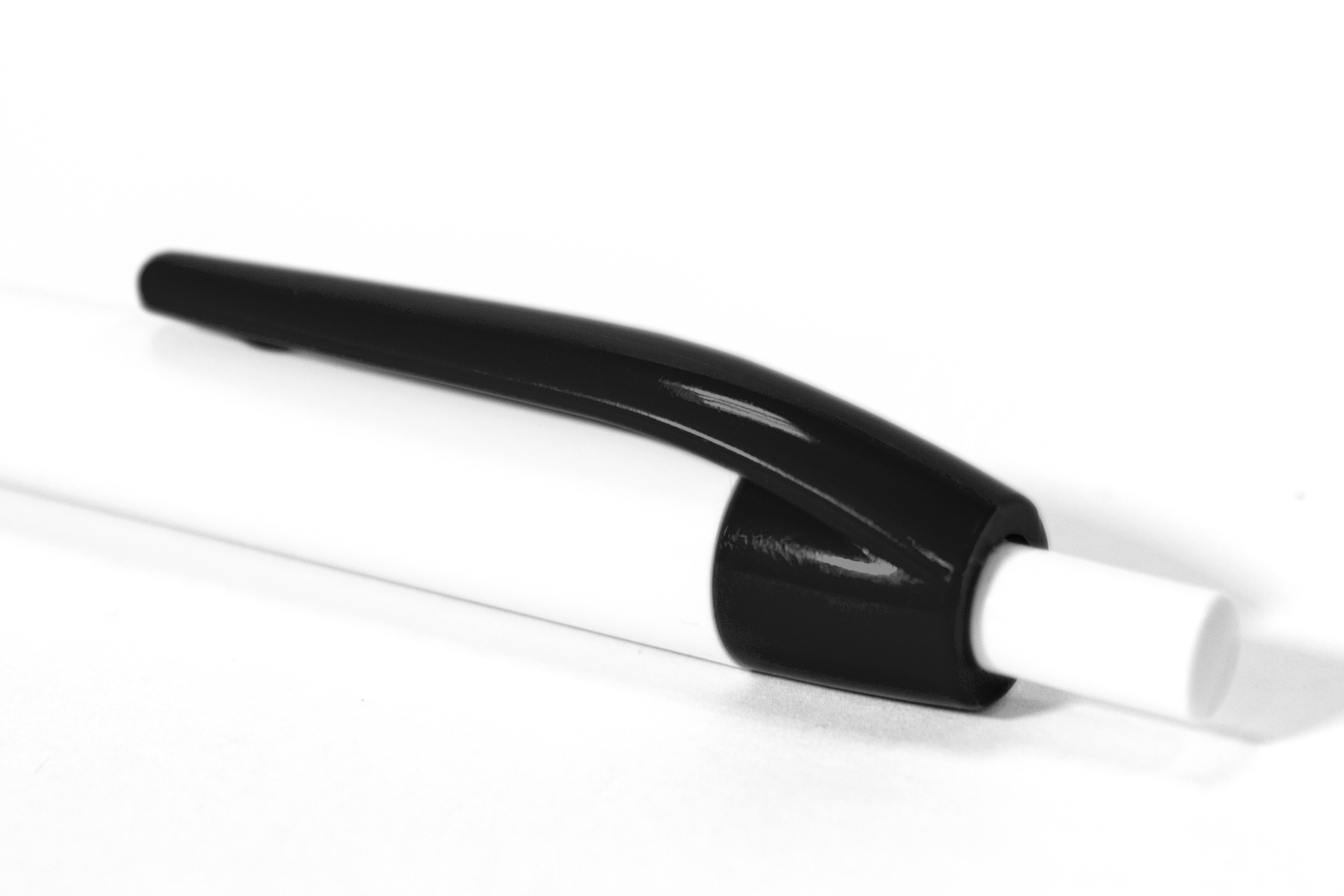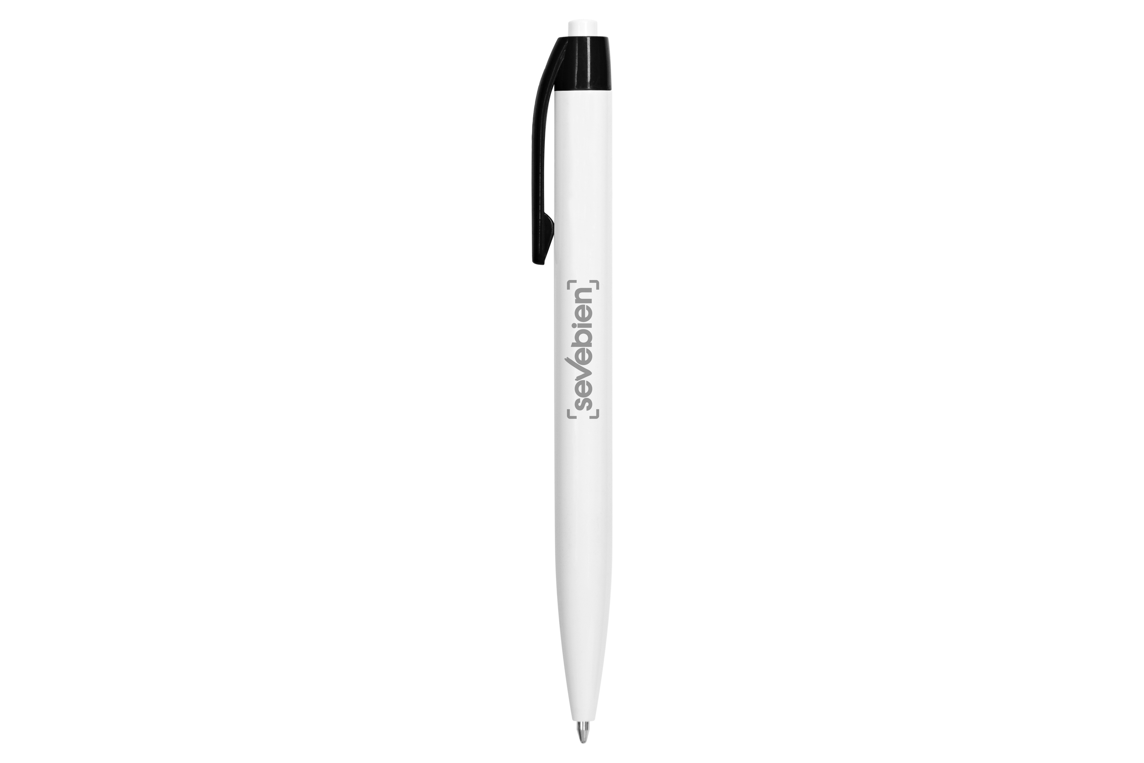 Plástico. Bolígrafo con pulsador. Cuerpo plástico de color blanco y clip de color. Tinta azul
