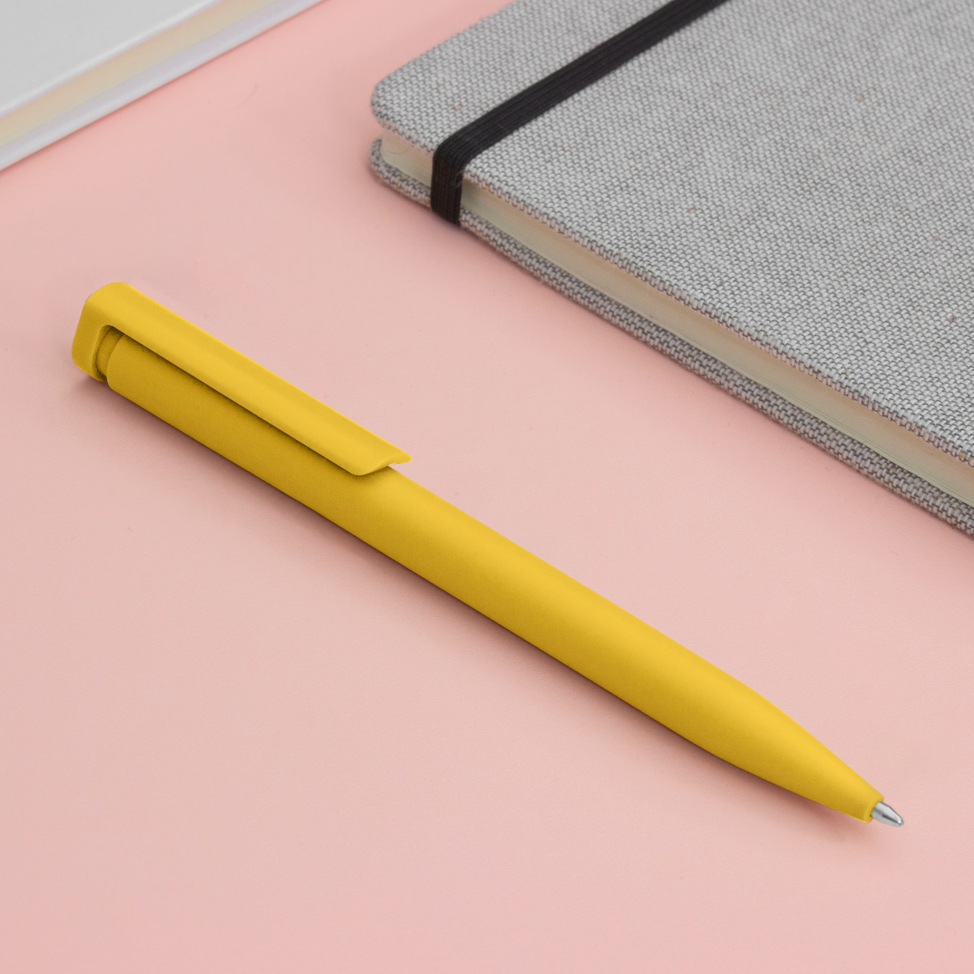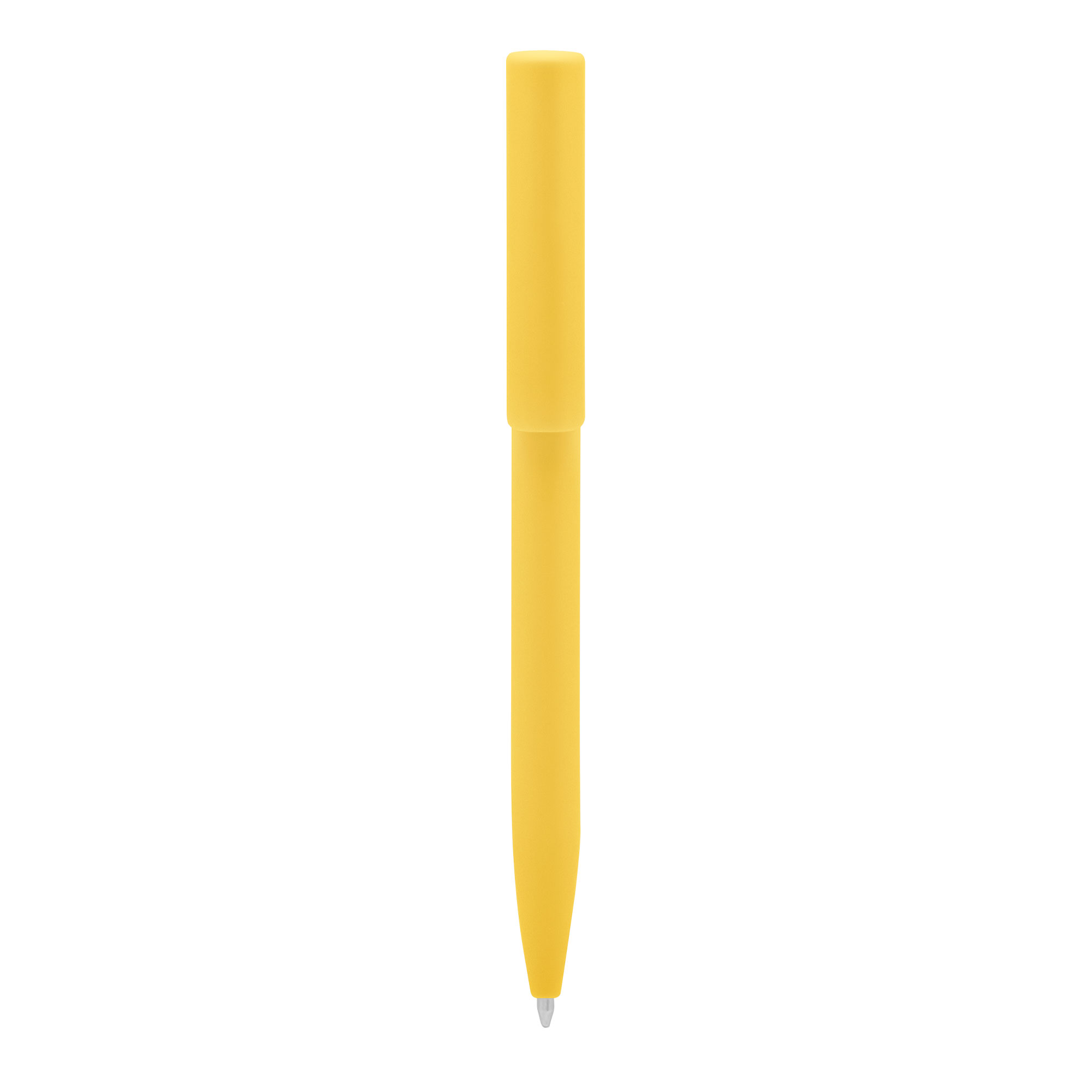 Plástico. Cuerpo de diferentes colores. Bolígrafo retráctil. Clip plástico del mismo color del cuerpo. Tinta negra. Sistema de botón push para destapar. Amplia área de impresión.
