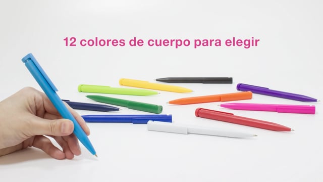 Plástico. Cuerpo de diferentes colores. Bolígrafo retráctil. Clip plástico del mismo color del cuerpo. Tinta negra. Sistema de botón push para destapar. Amplia área de impresión.