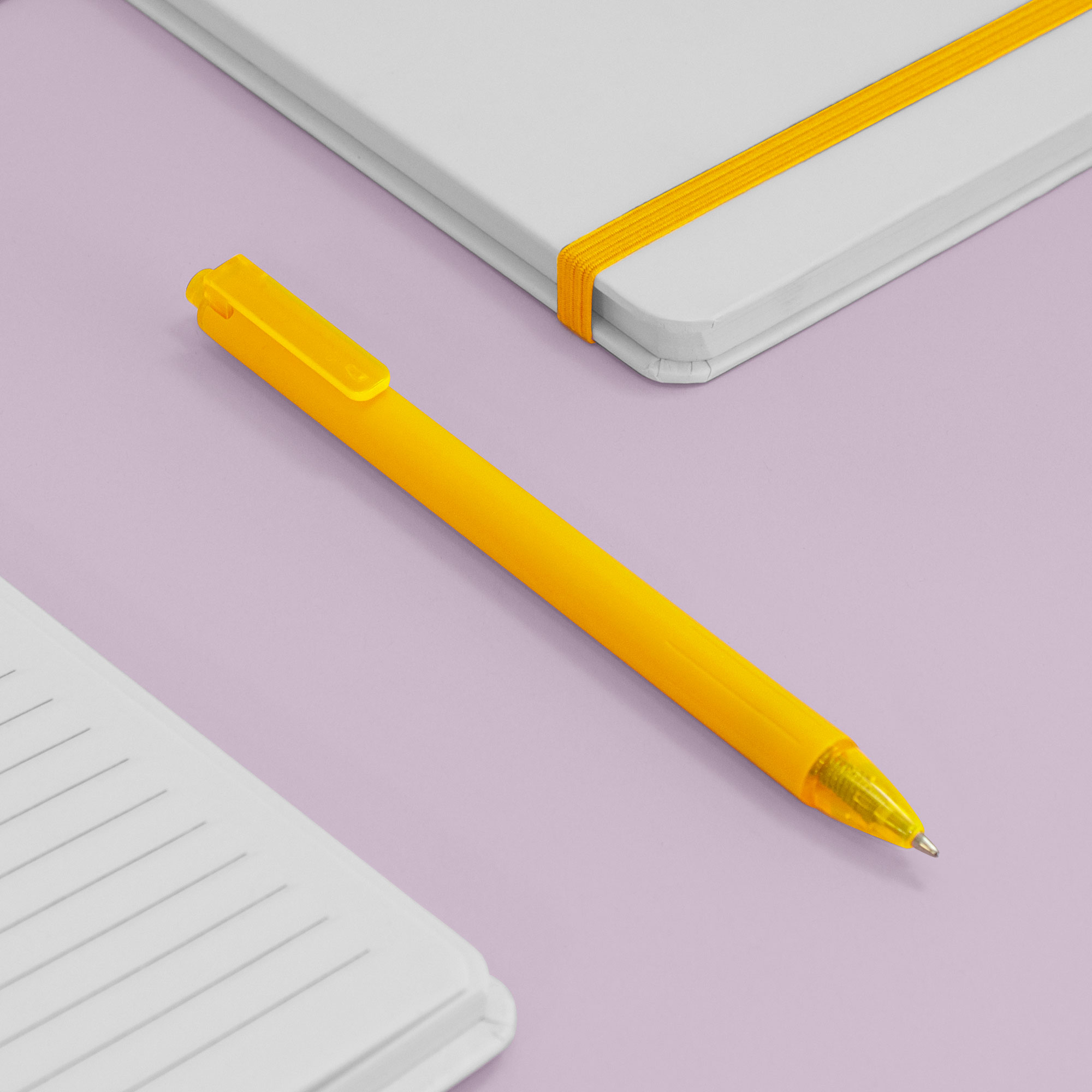 Bolígrafo retráctil. Cuerpo de diferentes colores acabado mate. Pulsador, clip y puntera translucidos del mismo color del cuerpo.