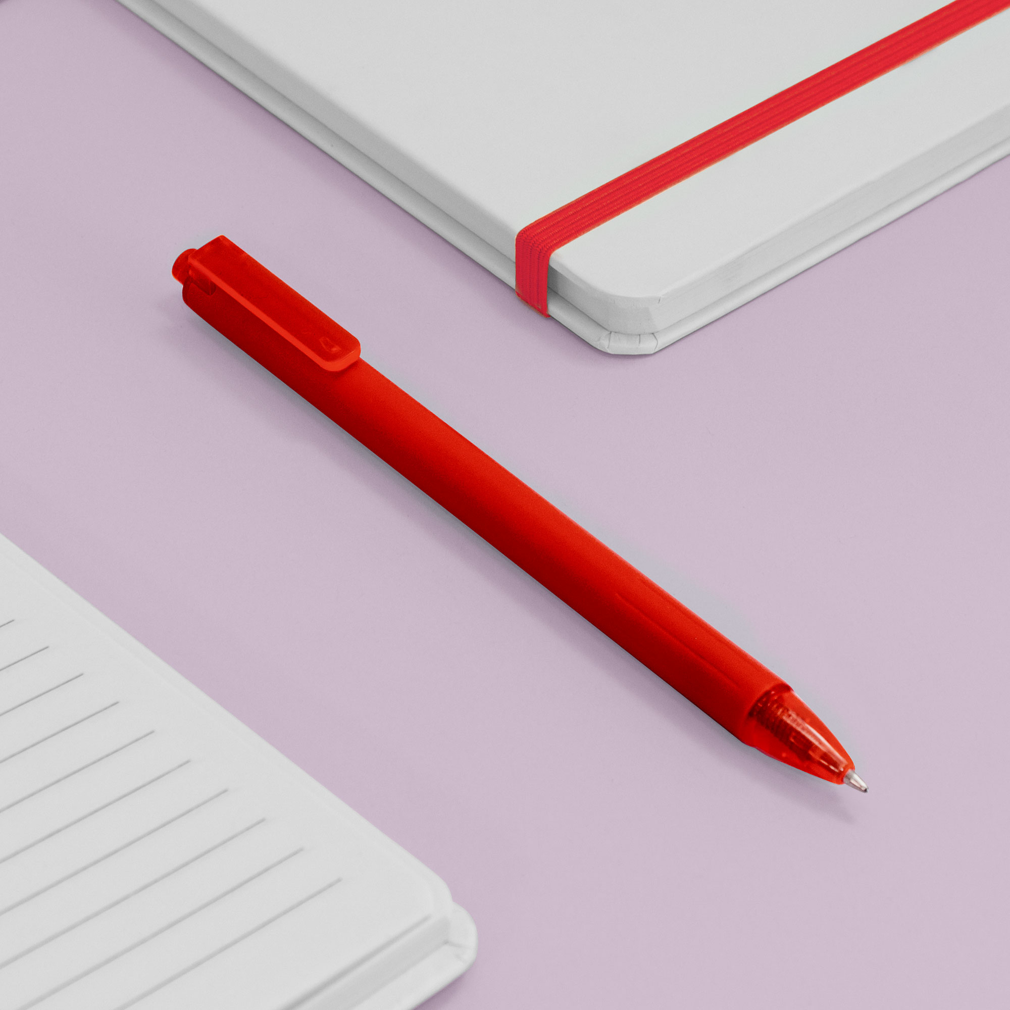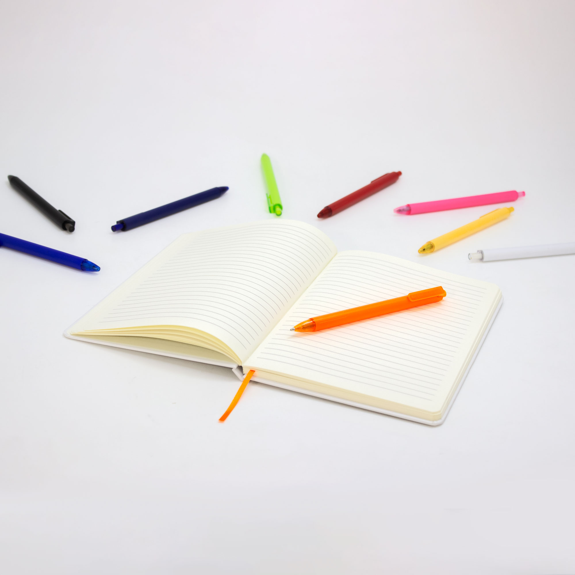 Bolígrafo retráctil. Cuerpo de diferentes colores acabado mate. Pulsador, clip y puntera translucidos del mismo color del cuerpo.