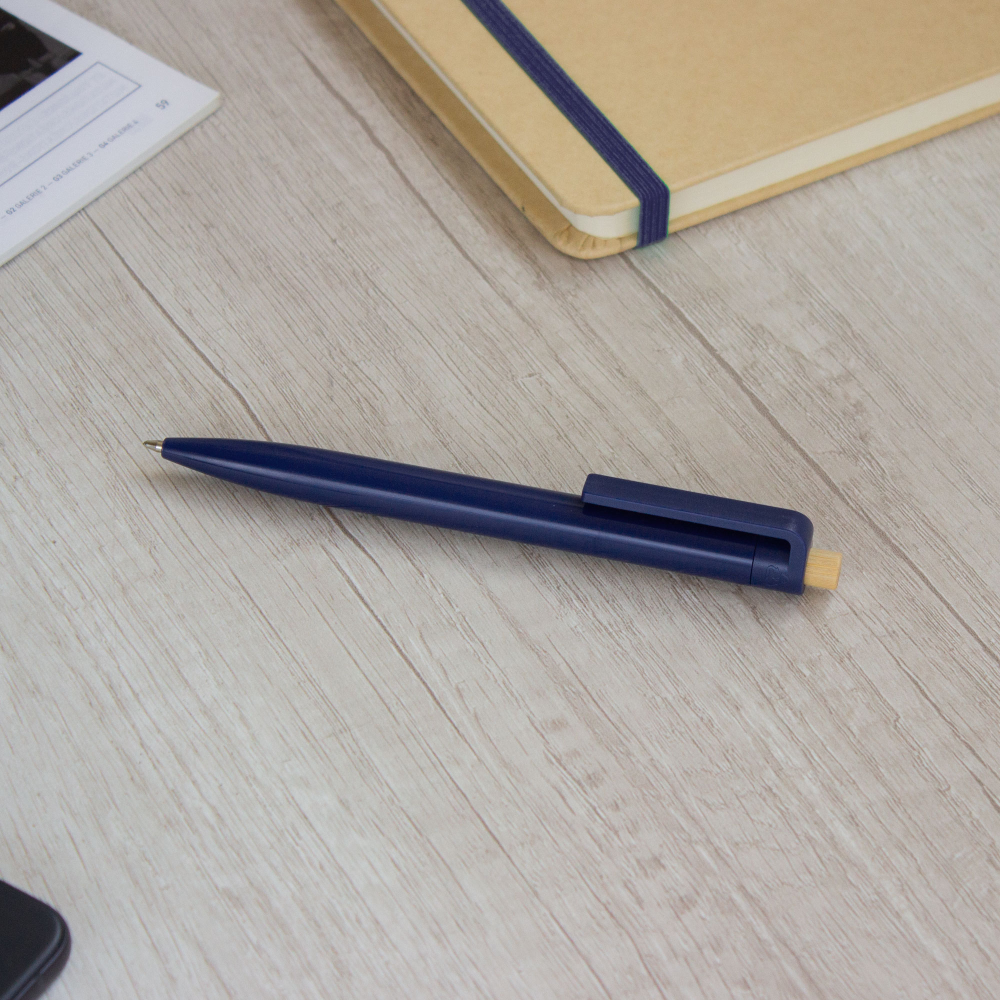 Bolígrafo retráctil. Cuerpo plástico en diferentes colores acabado brillante. Pulsador de bambú.
