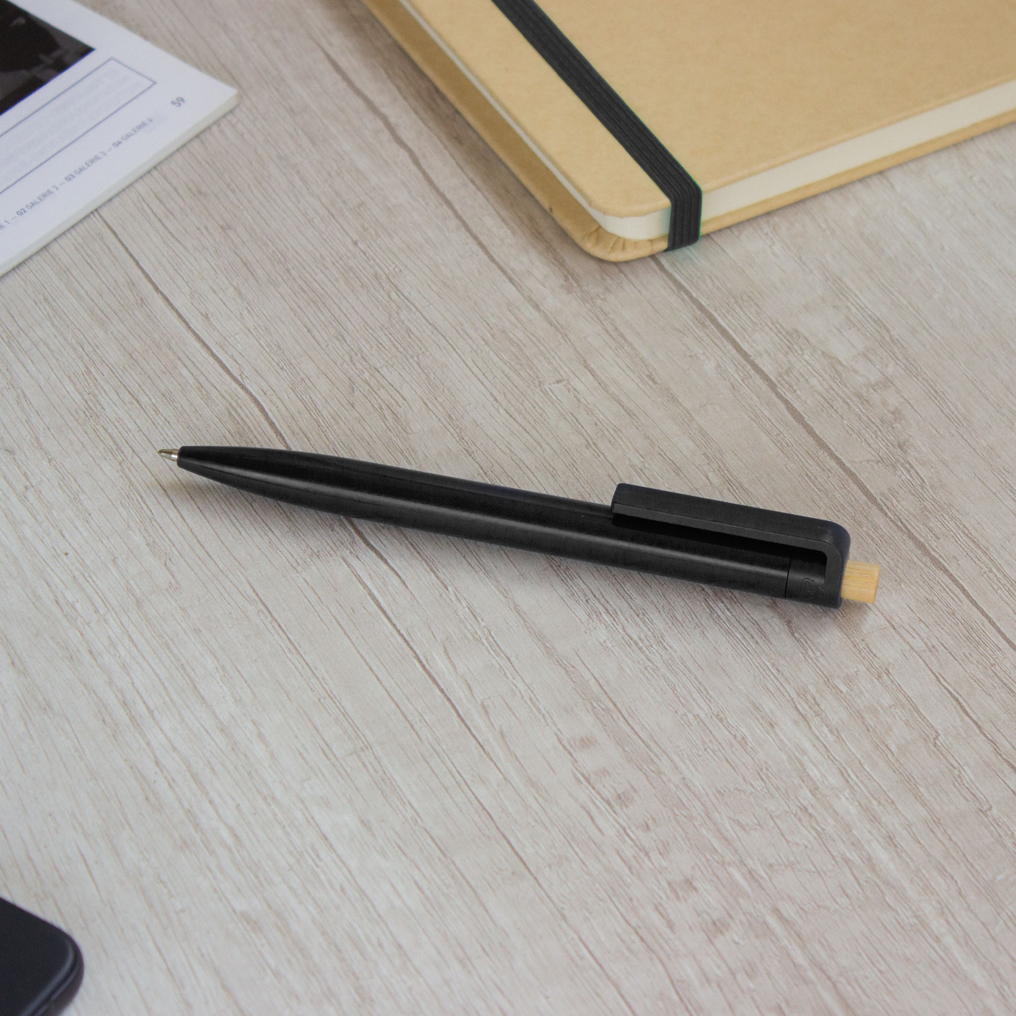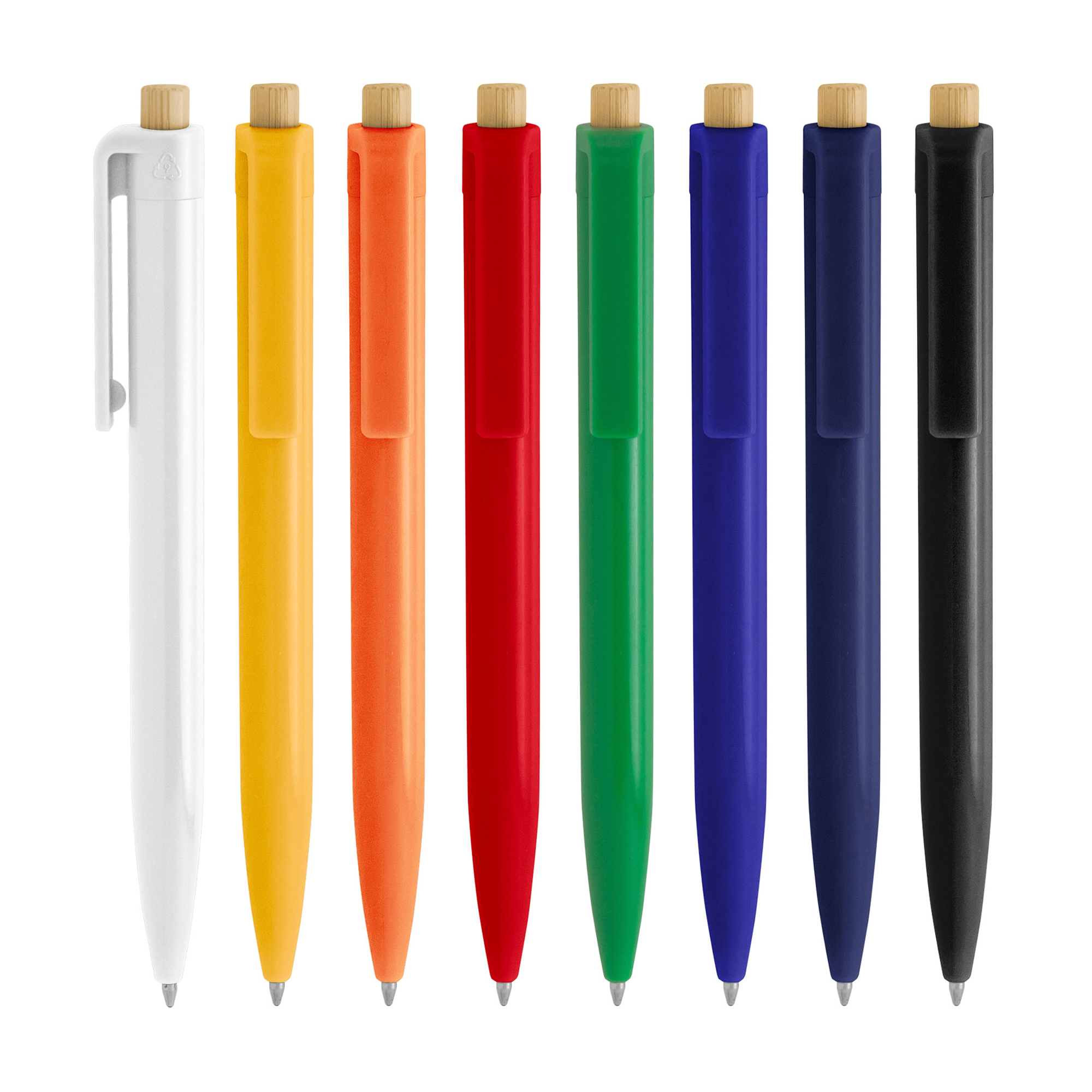 Bolígrafo retráctil. Cuerpo plástico en diferentes colores acabado brillante. Pulsador de bambú.