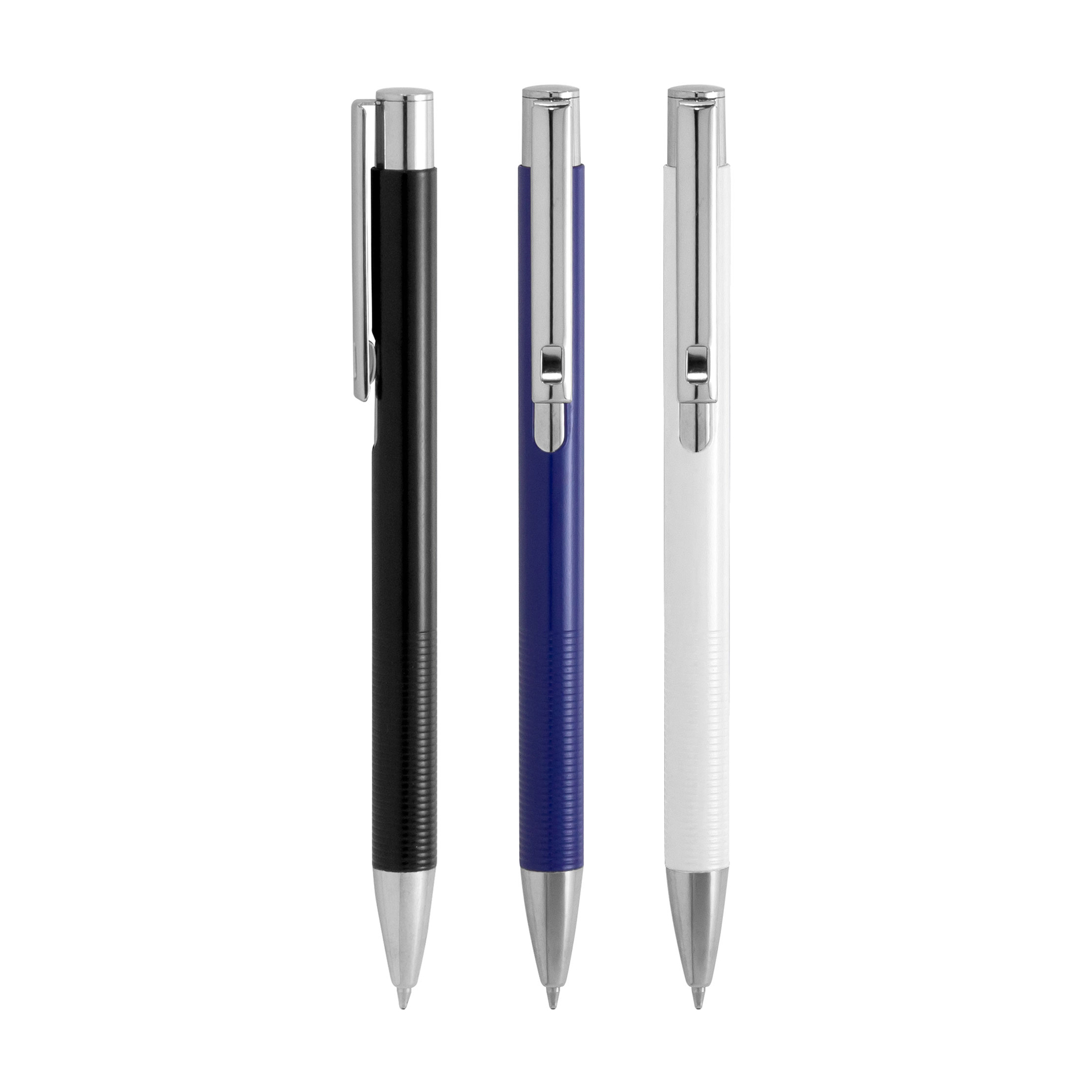 Bolígrafo retráctil. Cuerpo de aluminio en diferentes colores acabado mate. Botón, clip y puntera metálicos cromados.
