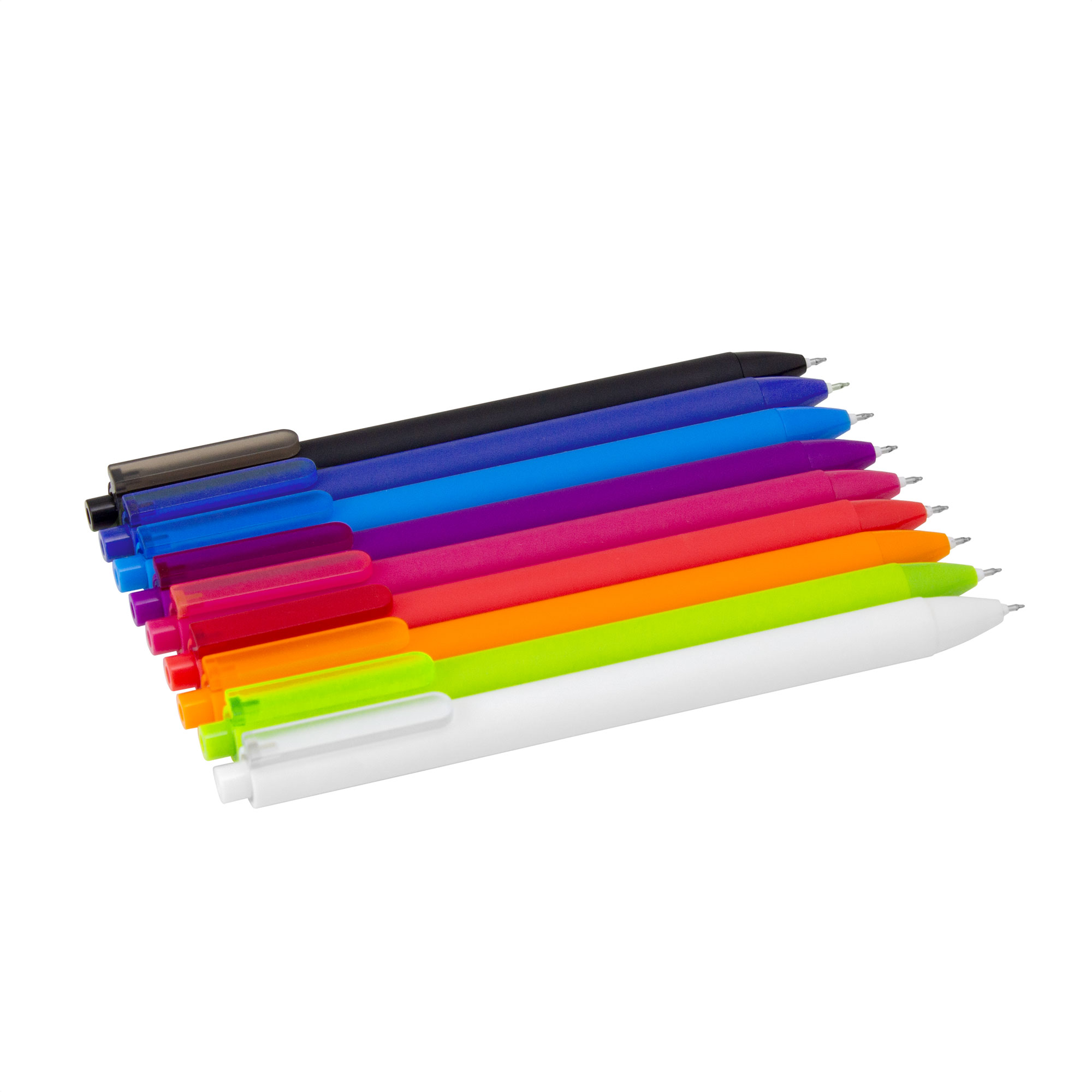 Bolígrafo retráctil con tinta gel. Cuerpo de diferentes colores con acabado mate suave al tacto. Pulsador y puntera del mismo color del cuerpo acabado brillante. Clip translúcido del mismo color del cuerpo.