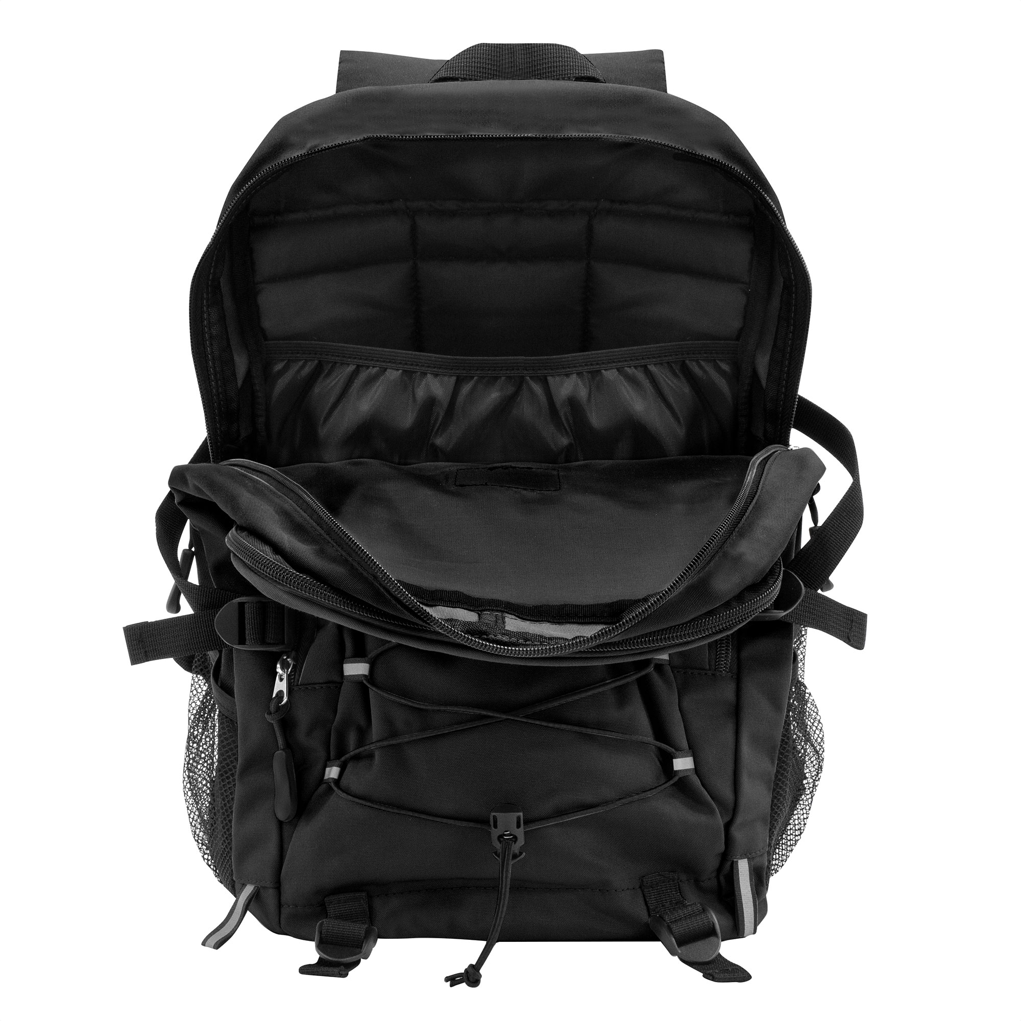 28 x 41 x 17 cm Capacidad 19 litros. Algodón y Poliester. Mochila outdoor. Múltiples espacios para transportar objetos. Compartimento principal con bolsillo elastizado. Bolsillo frontal con cierre, cordón elástico cruzado ajustable y dos bolsillos de red laterales y cintas de amarre. Detalles reflectivos. Cierres metálicos con tiradores de goma. Correas regulables y espalda acolchadas.