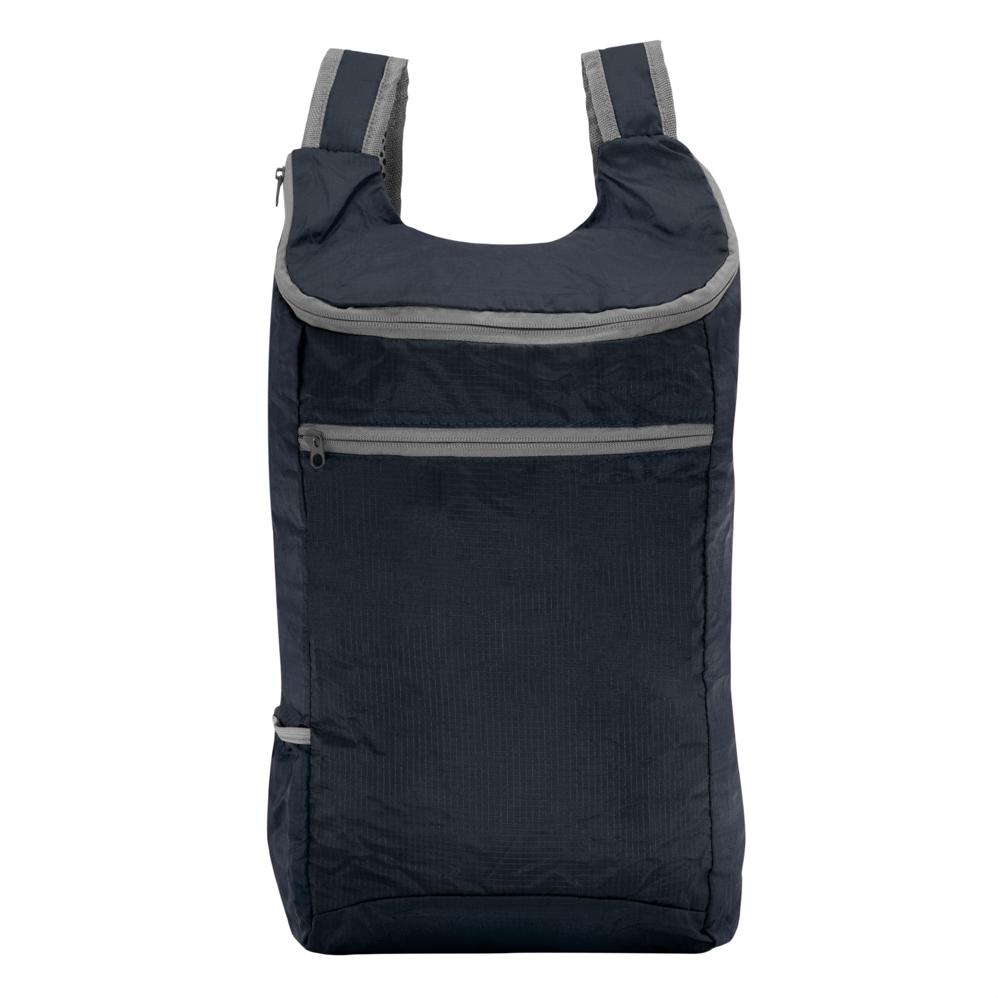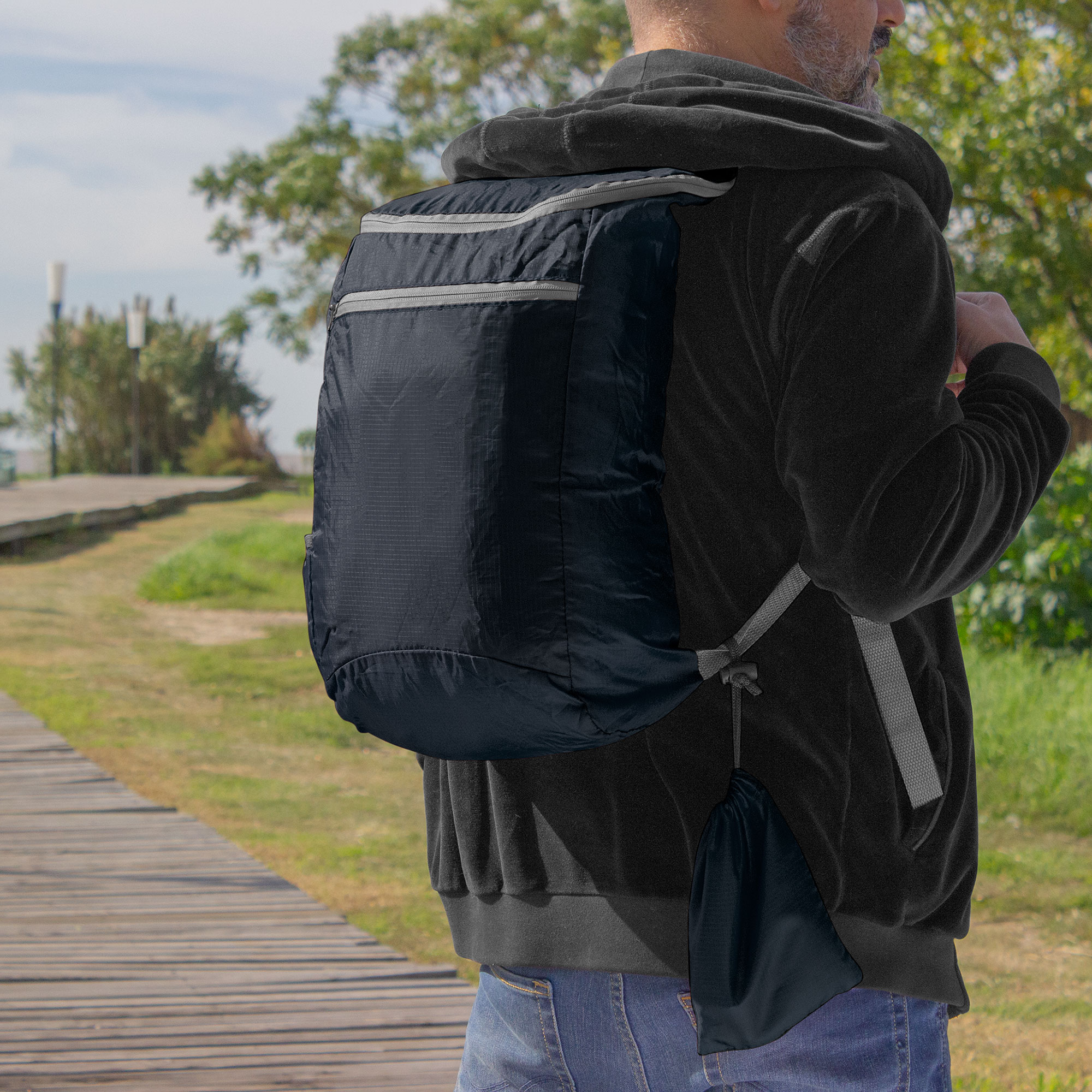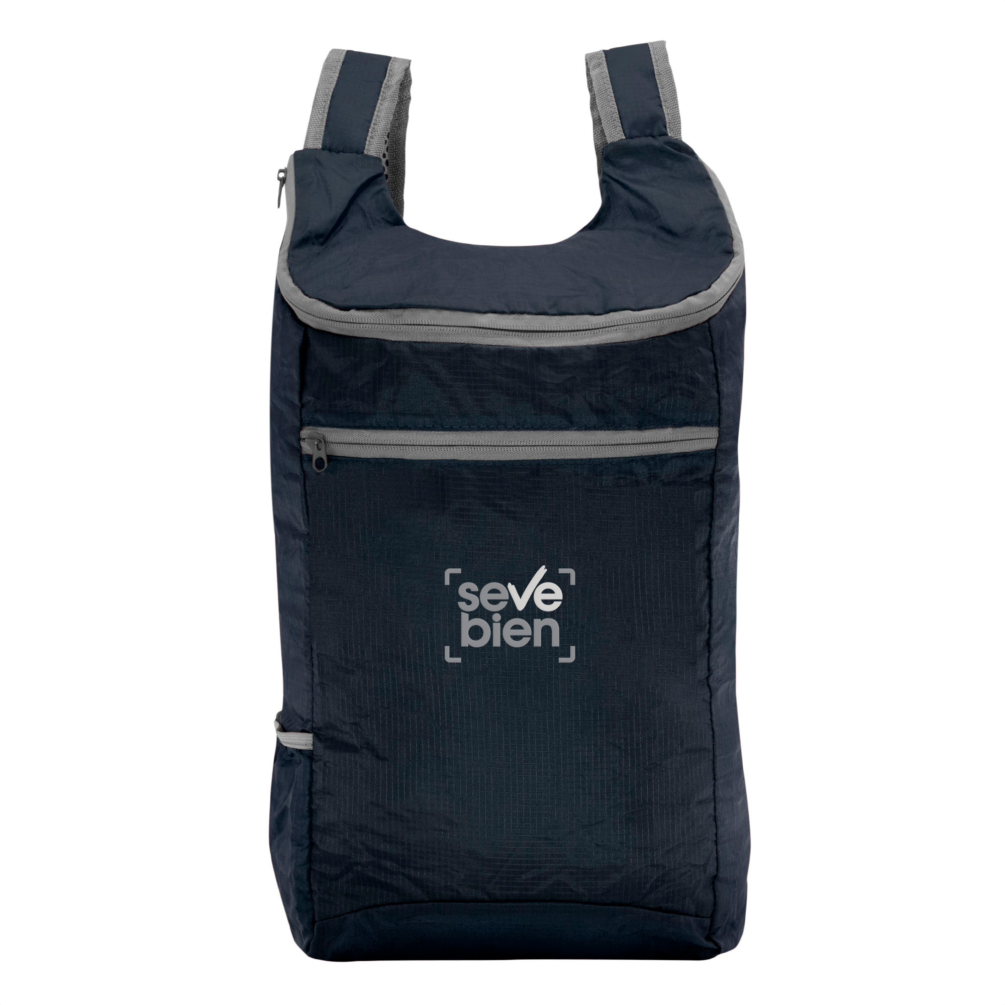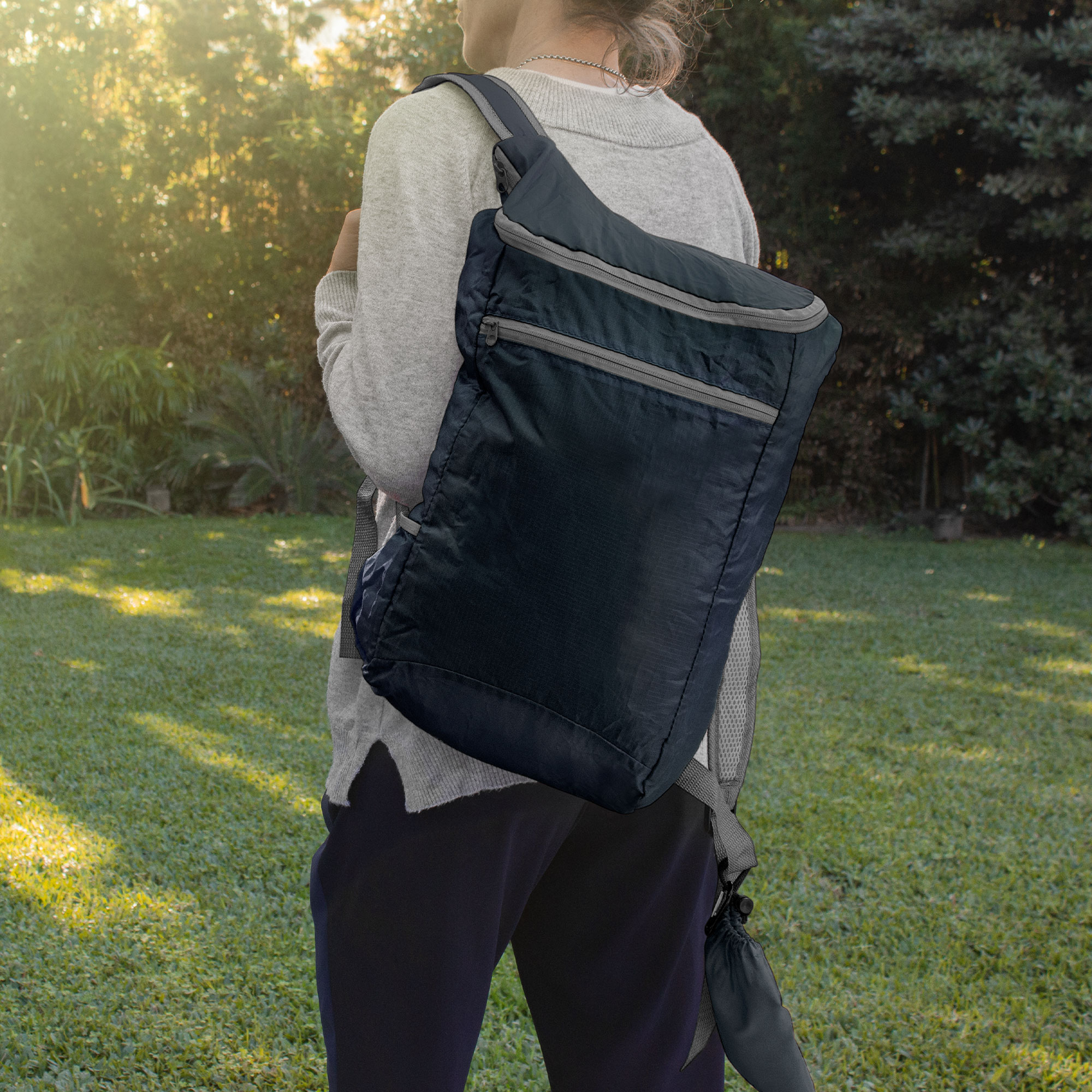 Mochila plegable. Compartimento principal con cierre. Bolsillo lateral elastizado. Bolsillo frontal con cierre horizontal. Cierres metálicos. Correas regulables reforzadas y acolchadas. Se comprime fácilmente en una bolsa pequeña con cierre ajustable.