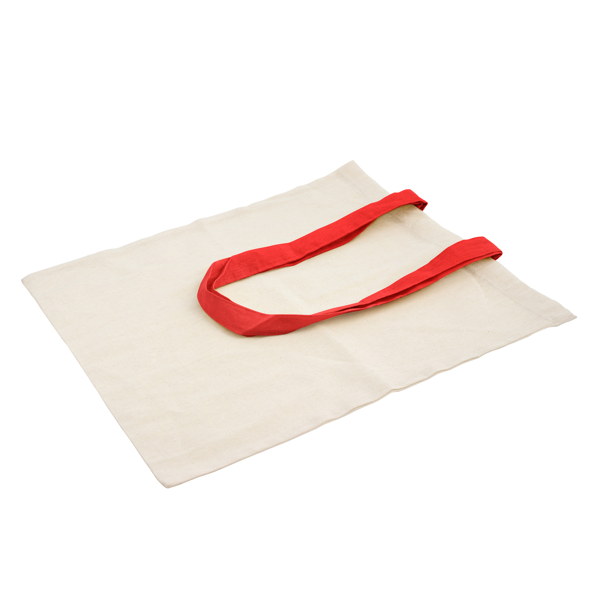 Bolsa reutilizable color natural con manijas de diferentes colores. Manijas cosidas de 70cm x 2,5 cm.