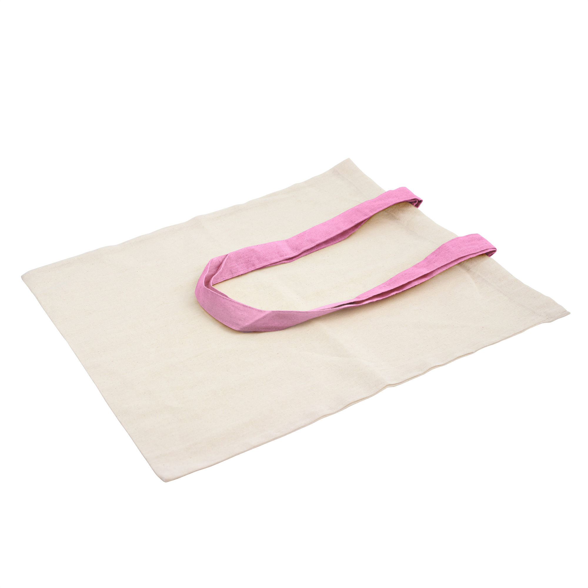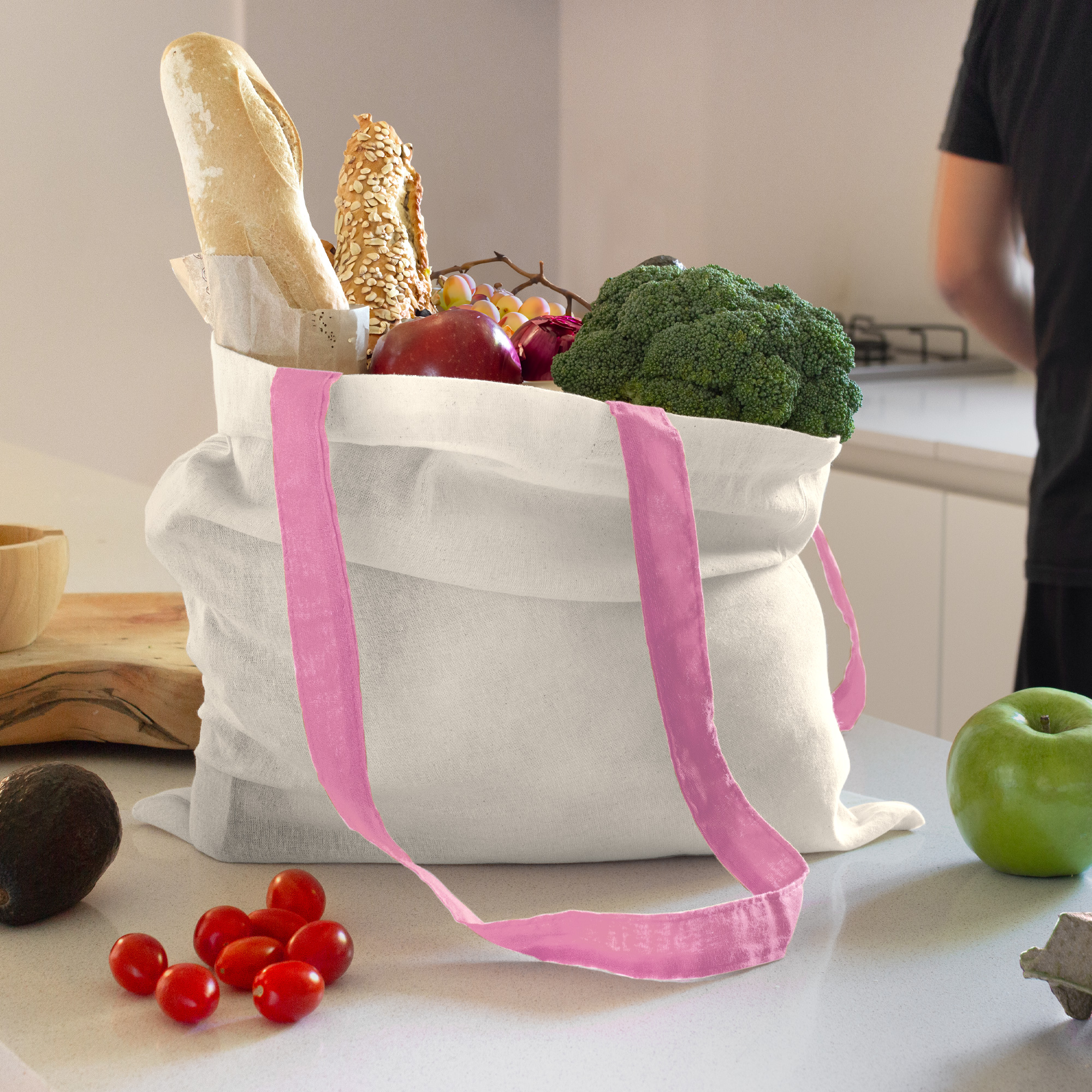 Bolsa reutilizable color natural con manijas de diferentes colores. Manijas cosidas de 70cm x 2,5 cm.