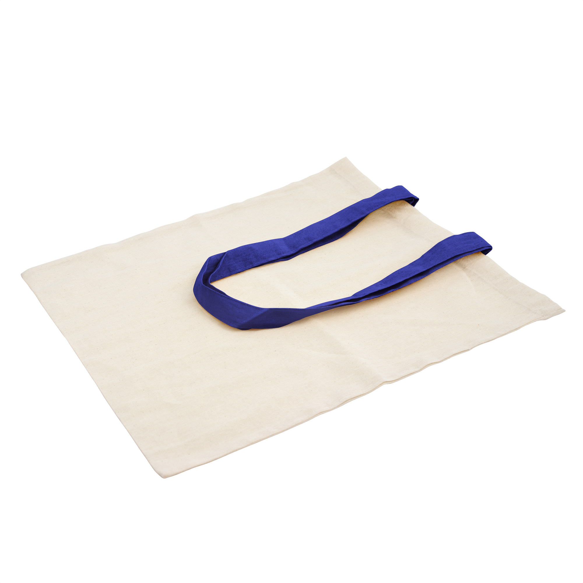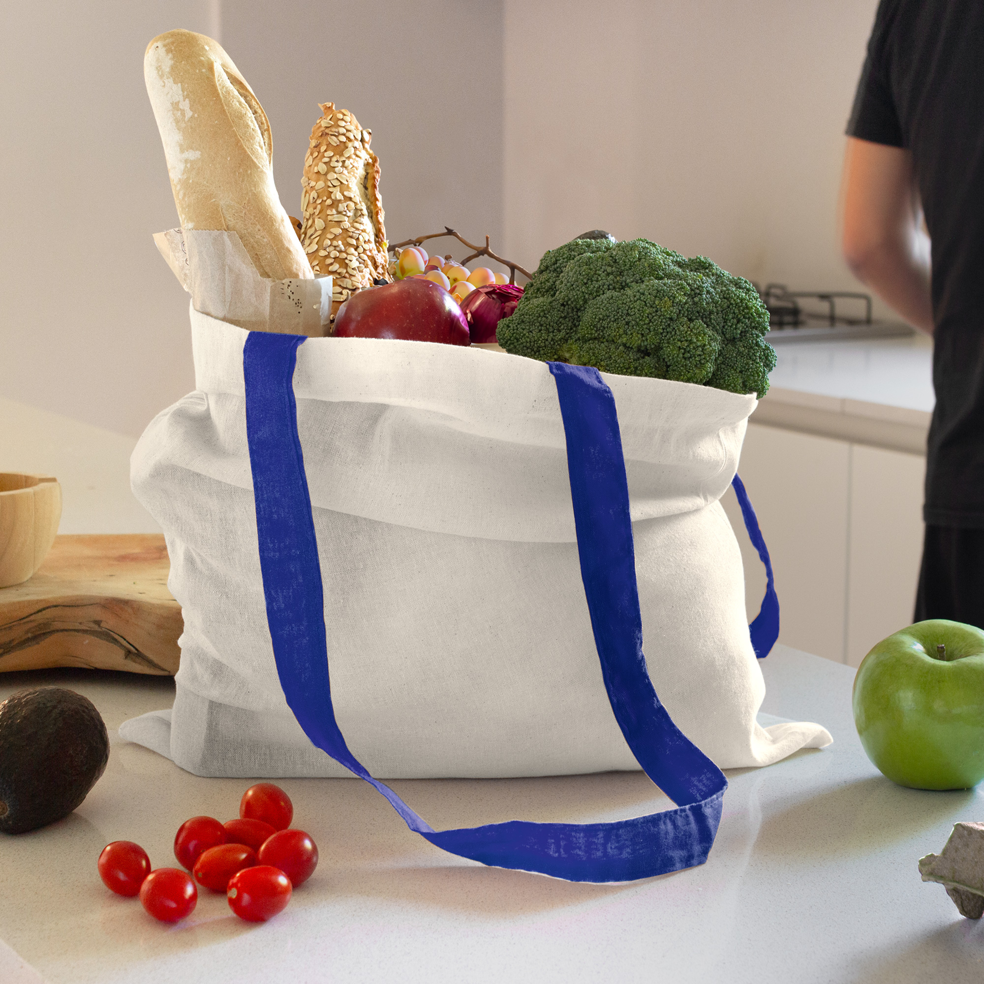 Bolsa reutilizable color natural con manijas de diferentes colores. Manijas cosidas de 70cm x 2,5 cm.