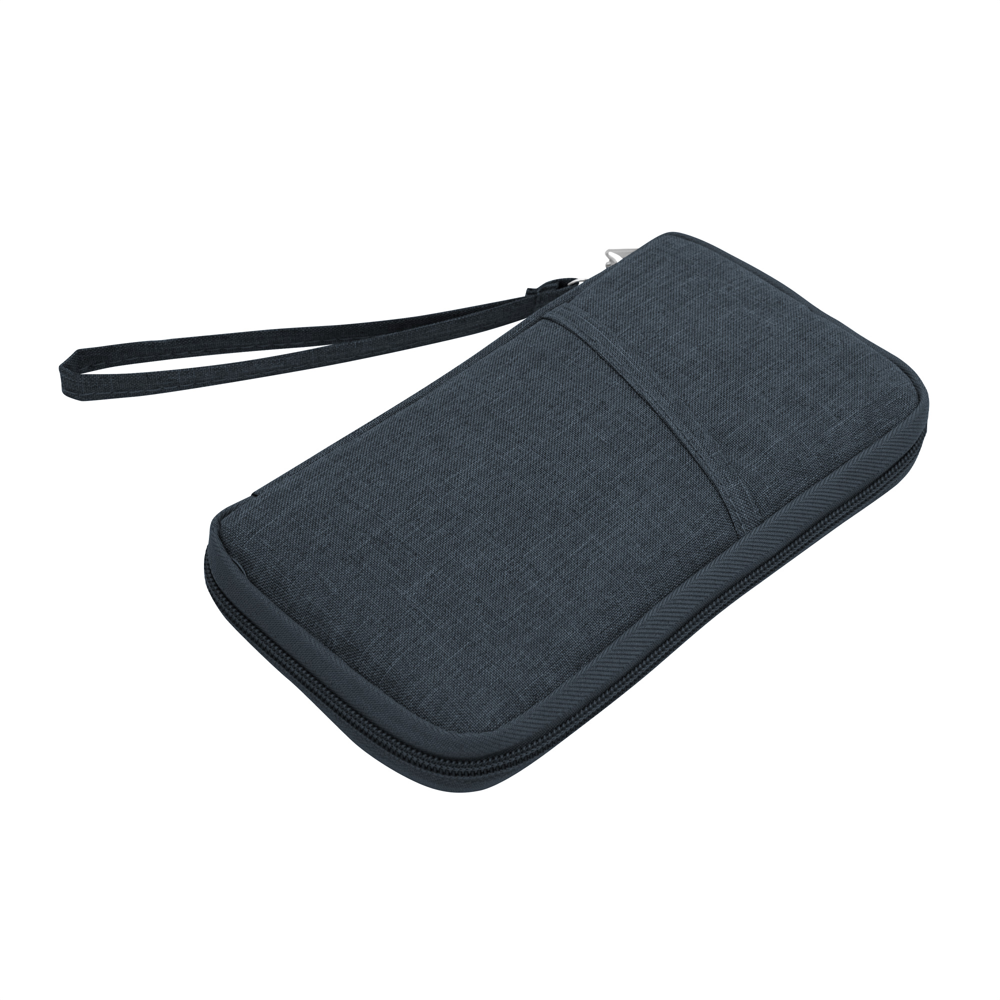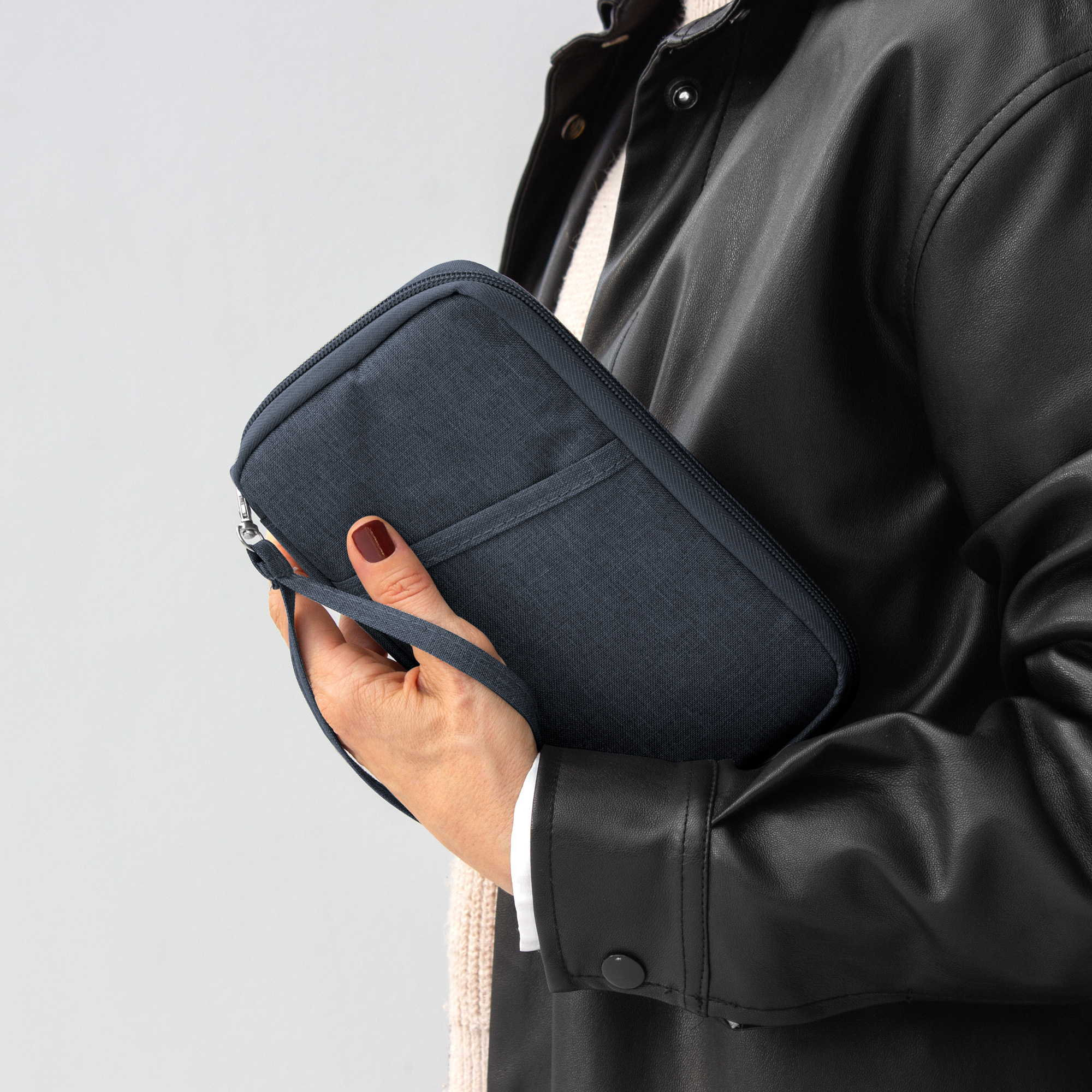 Billetera portadocumentos. Estructura acolchada con cierre perimetral y un bolsillo al frente. Bolsillos internos de red de ambos lados con múltiples espacios organizadores y un bolsillo con cierre. Correa de poliéster desmontable con mosquetón. Tirador de cierre metálico.