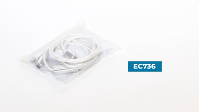 120 cm. Aluminio y Nylon. Cable con entrada USB y diferentes adaptadores: Iphone, Type C y Android. Viene dentro de una bolsa plásticas con cierre ziploc.