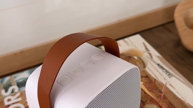 Parlante Bluetooth estéreo con radio FM, tarjeta TF y entrada AUX. Estructura plástica color blanco y asa en poliuretano color marrón. Cable de carga y conexión USB-C en color blanco. Incluye manual de uso.