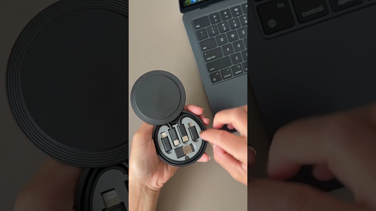 Cable de carga rápida. Estuche circular con mosquetón. Accesorios: 1 cable de carga rápida USB tipo C a USB tipo C de 60 W con transferencia de datos, 1 adaptador USB standard, 1 adaptador Lightning y 1 adaptador micro USB. Cierre magnético. Apertura por deslizamiento.