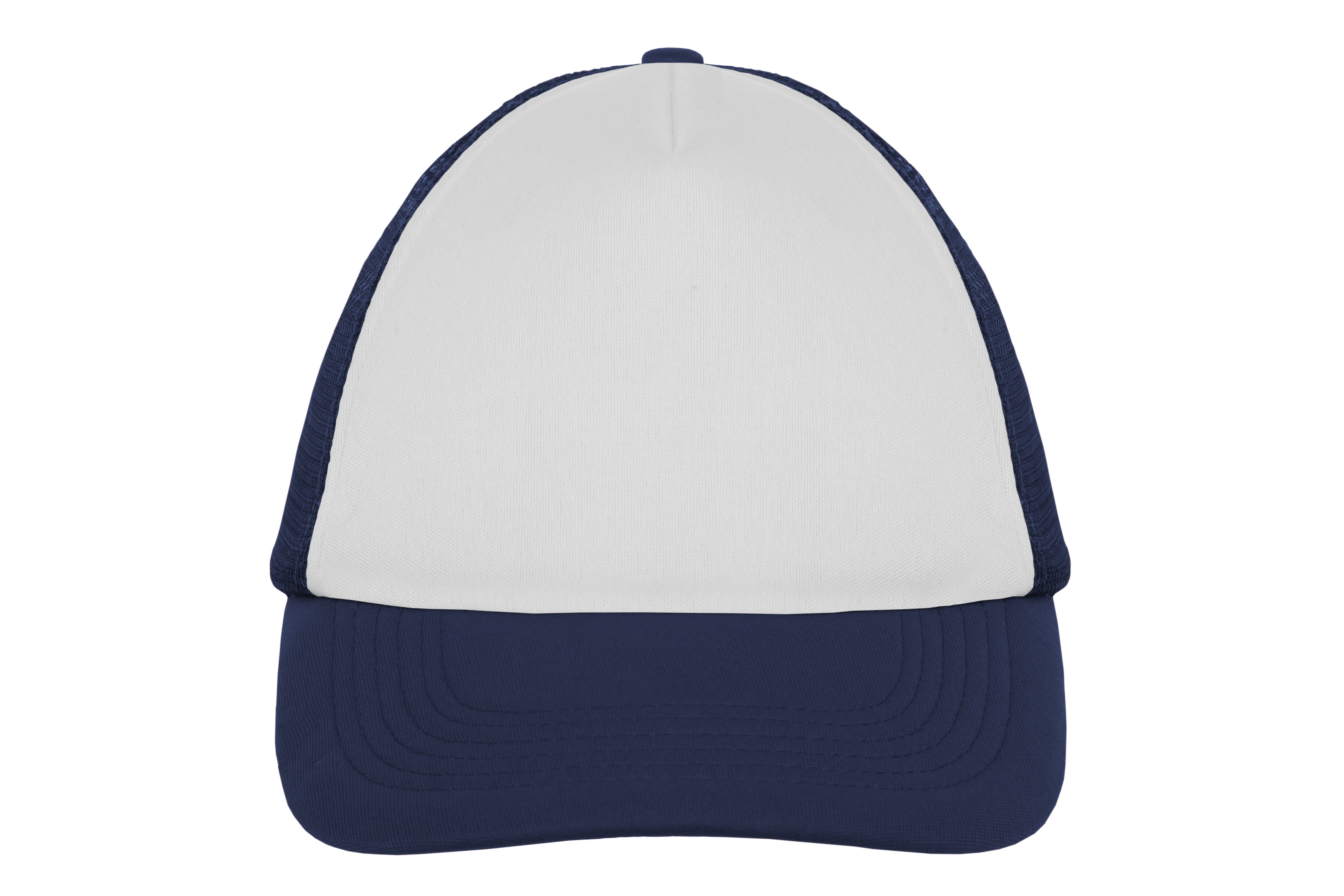 Ancho de base 18 cm. x alto 16 cm. Poliéster. Gorra trucker 5 gajos. Frente de color blanco. Parte trasera con tela red de color. Ajuste con broche plástico. Seis costuras 17,5 x 7,5 cm.