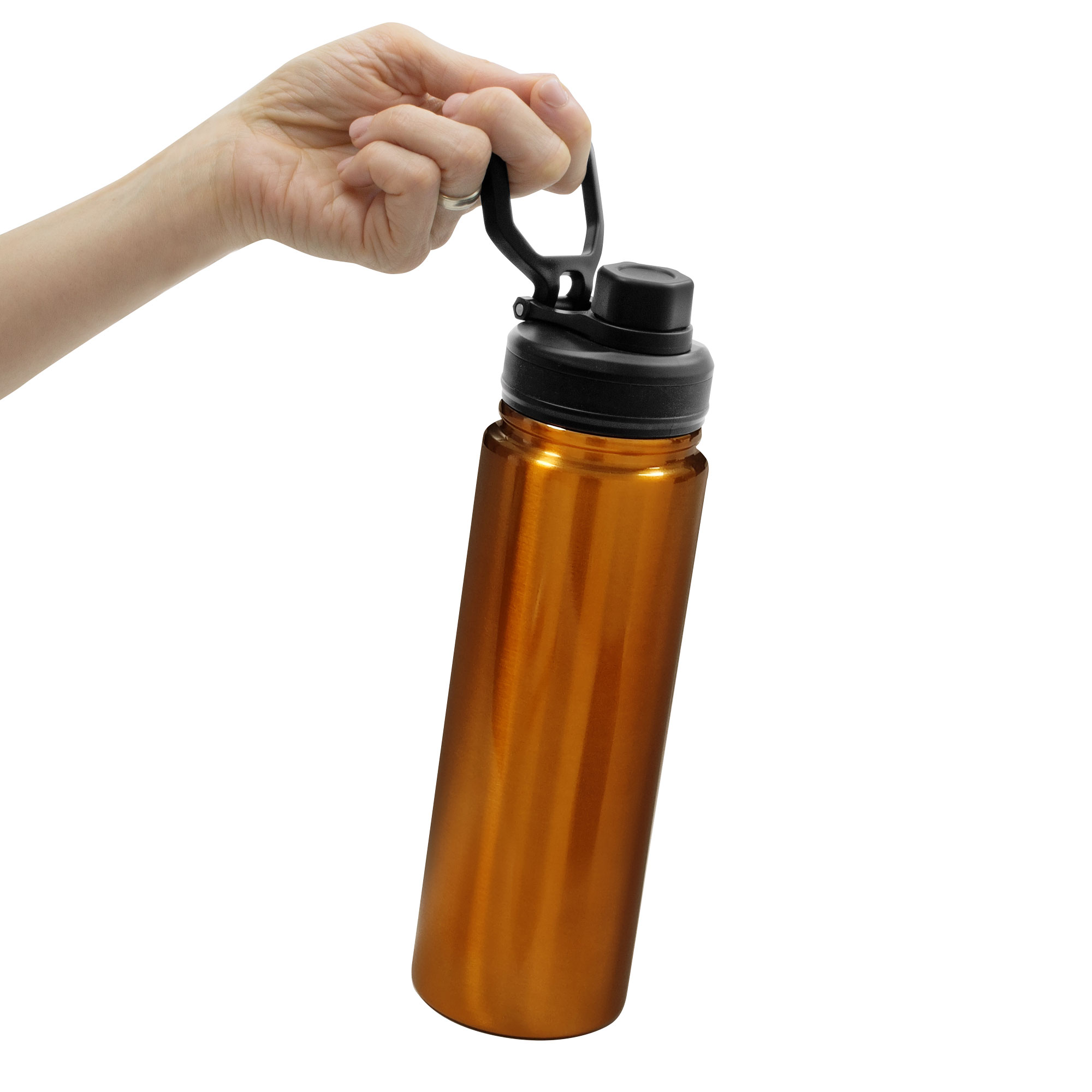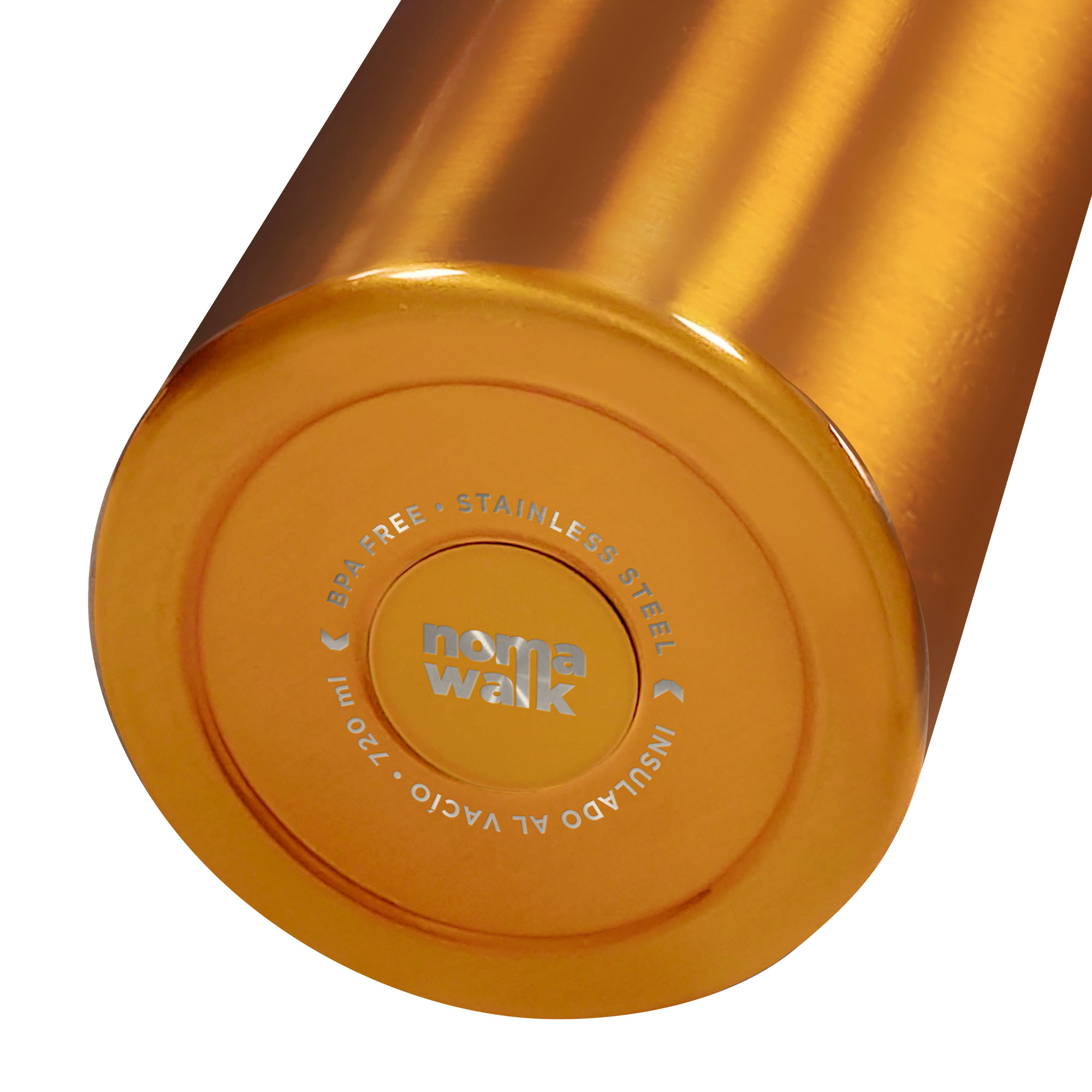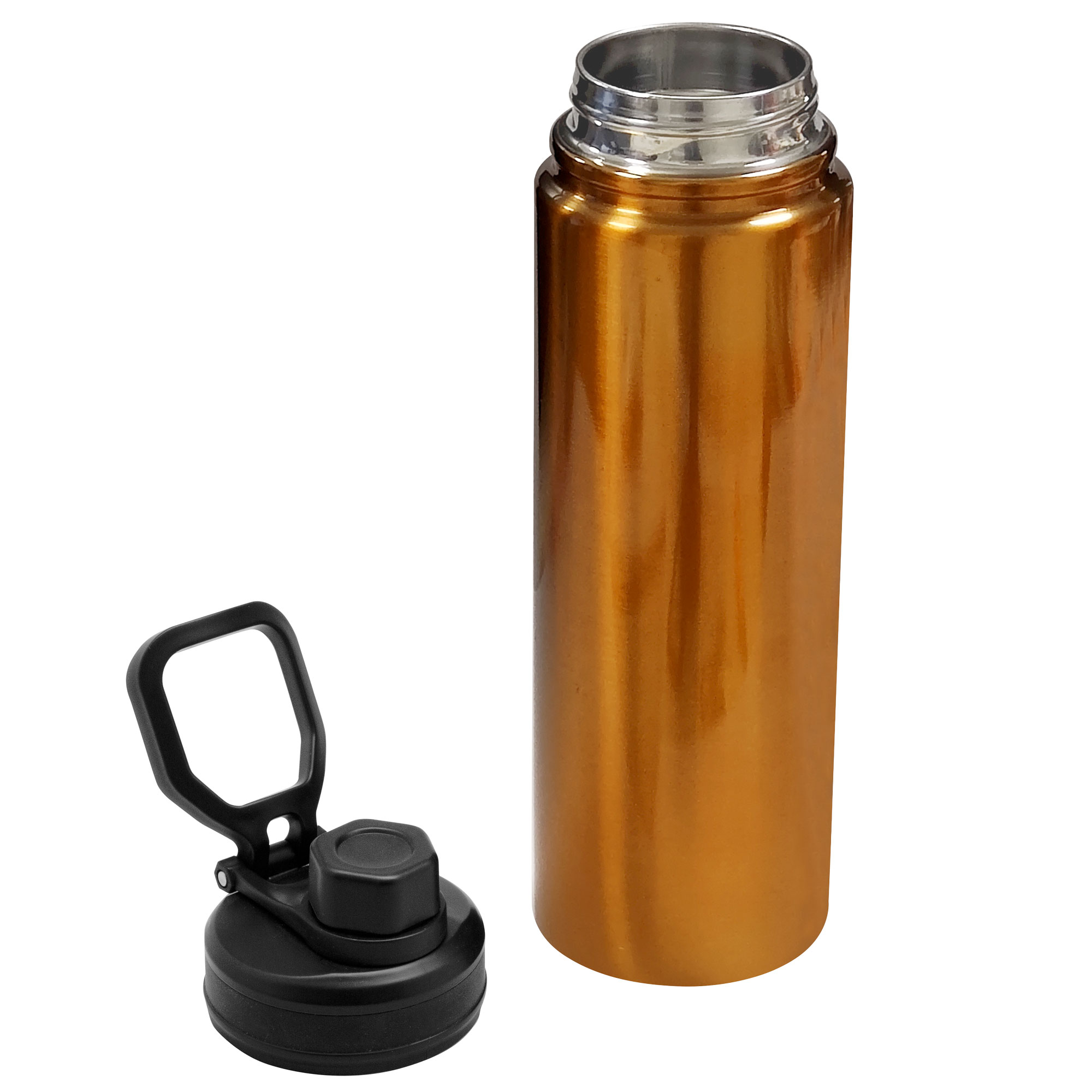 Botella doble pared, sellada al vacío. Interior en acero 304 y exterior en acero 201. Tapa con anillo de silicona, boquilla con cierre a rosca antiderrame y manija plástica para su agarre. Mantiene hasta 12 hs la temperatura de las bebidas calientes y 24 hs de las bebidas frías.