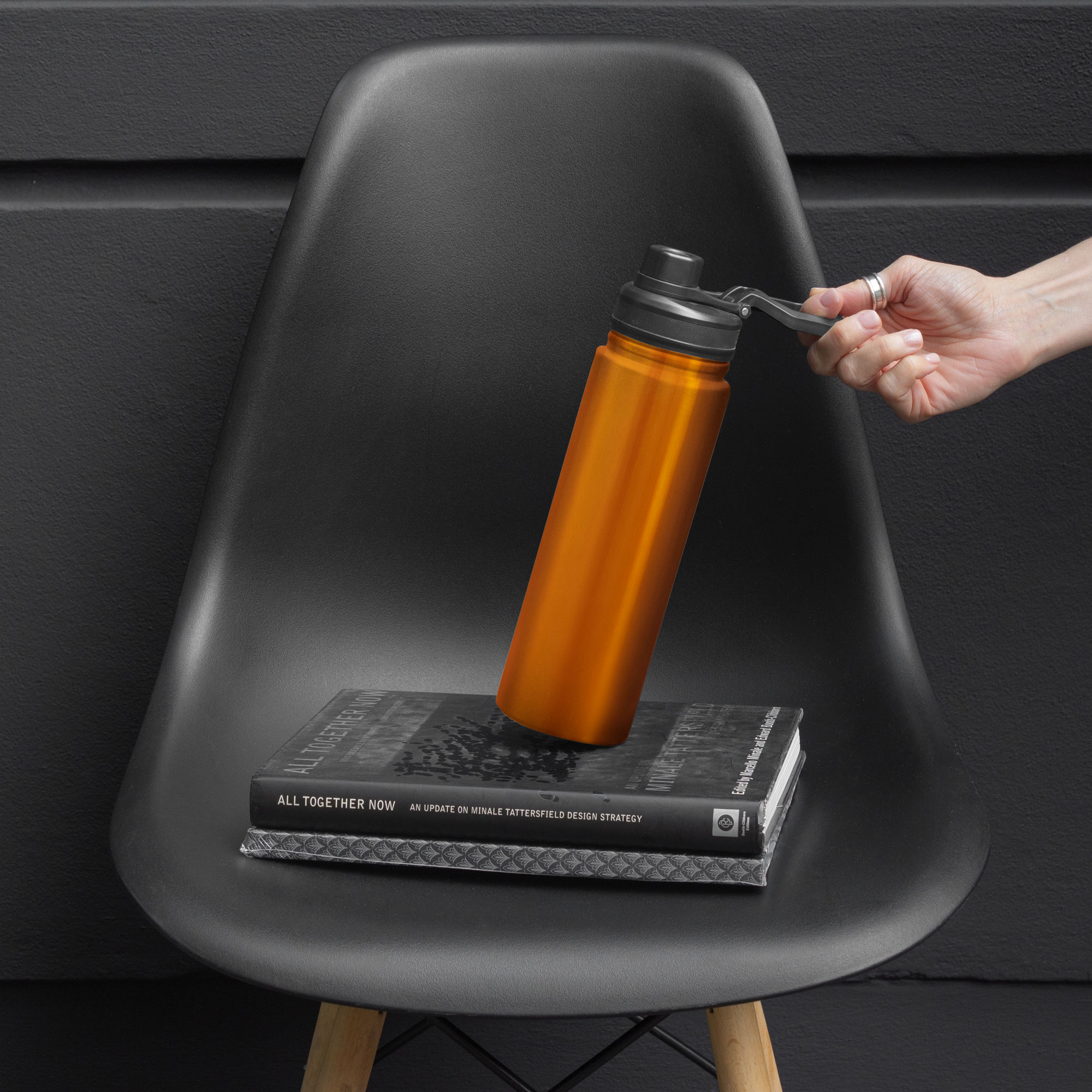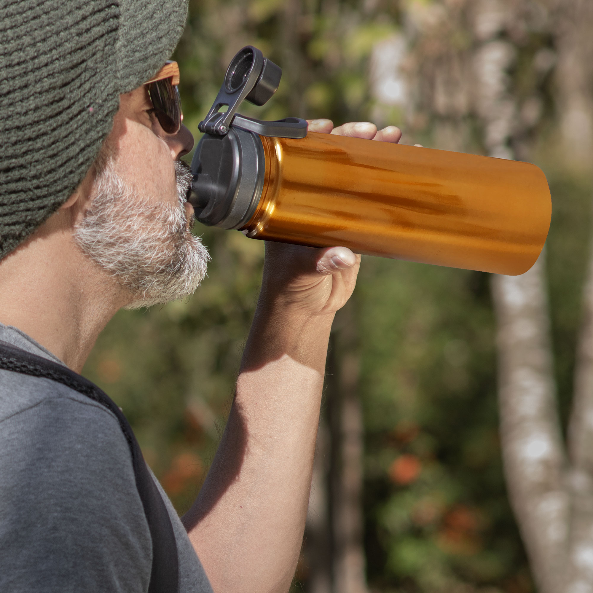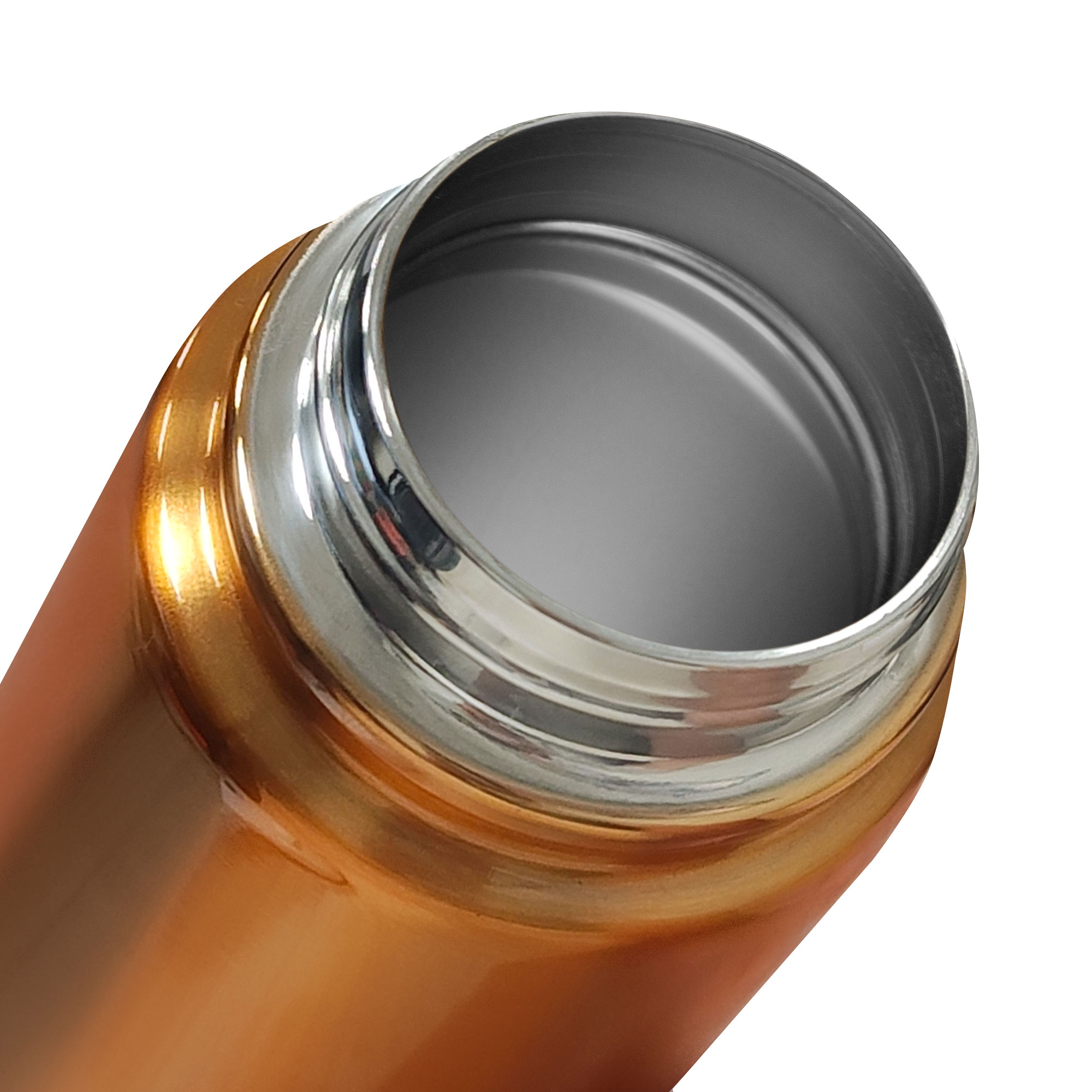 Botella doble pared, sellada al vacío. Interior en acero 304 y exterior en acero 201. Tapa con anillo de silicona, boquilla con cierre a rosca antiderrame y manija plástica para su agarre. Mantiene hasta 12 hs la temperatura de las bebidas calientes y 24 hs de las bebidas frías.