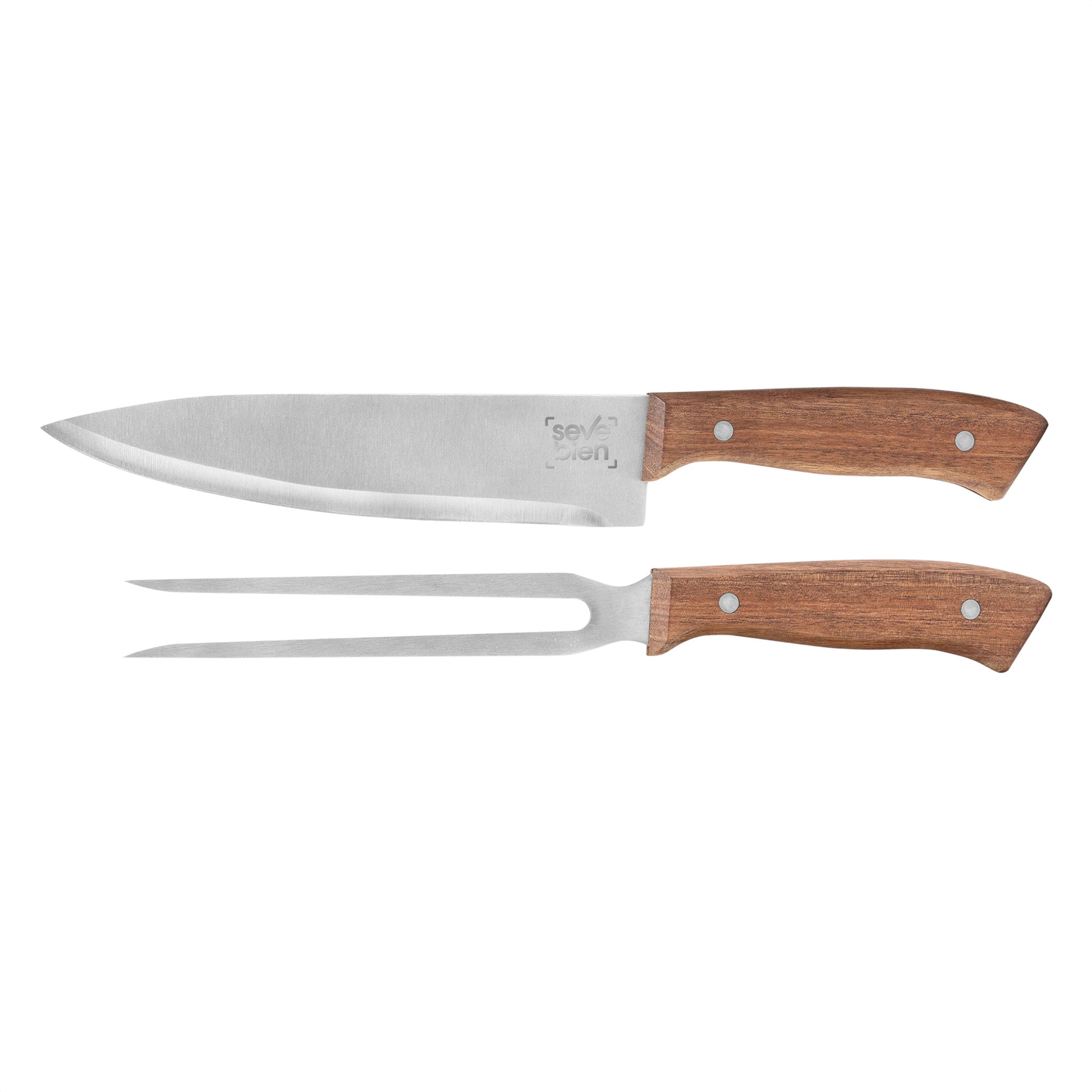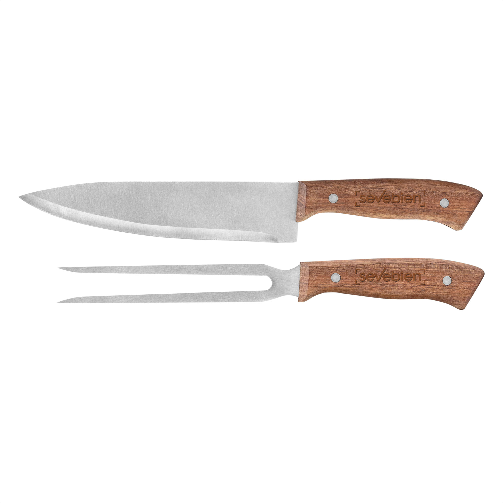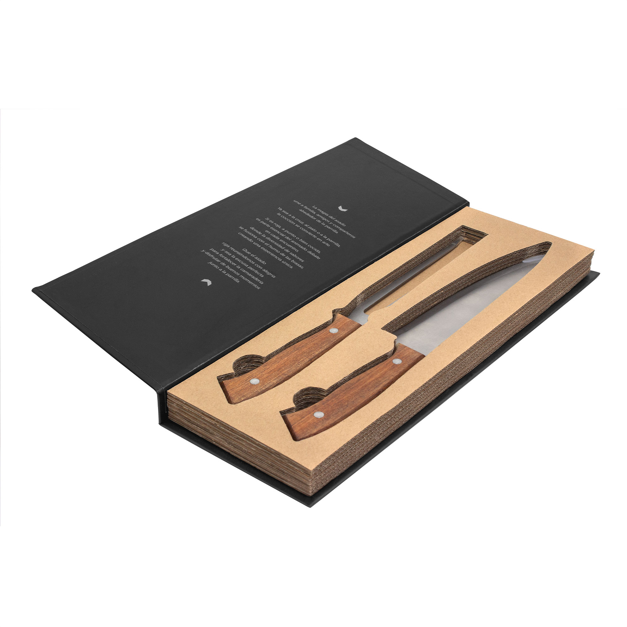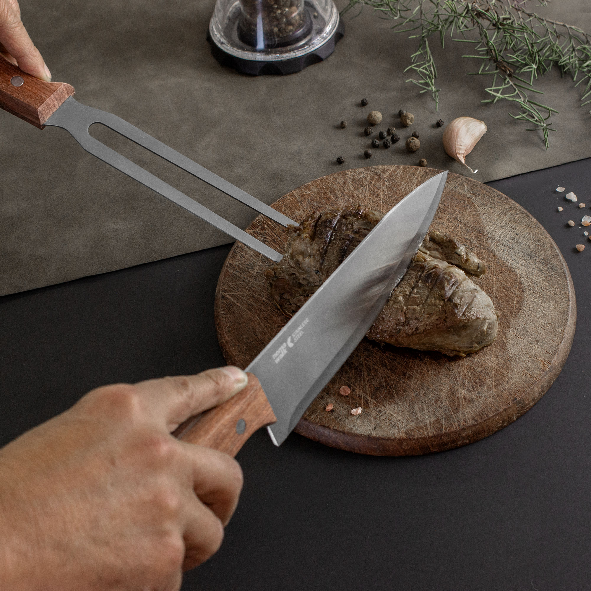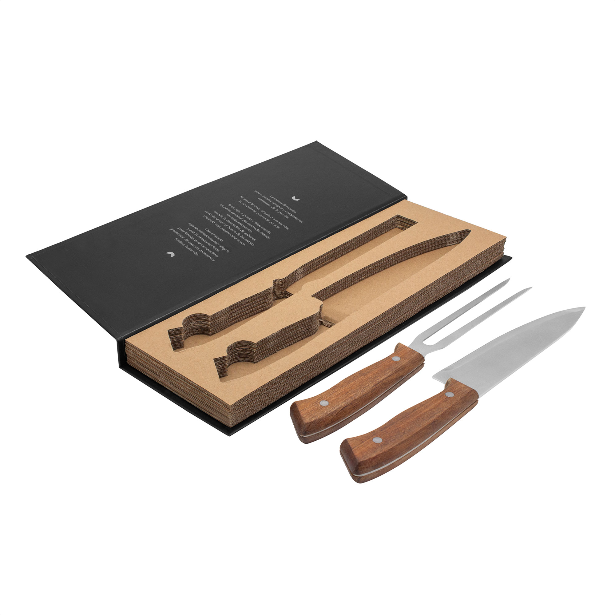 37,8 x 13 x 2,8 cm (caja cerrada). Acero inoxidable 420 y Madera de Acacia. Set de 2 utensilios: Cuchillo chef de 33,5 cm y 175 g. Tenedor de 31,3 cm y 125 g., ambos con mango de madera. Presentación en caja de regalo estilo libro.