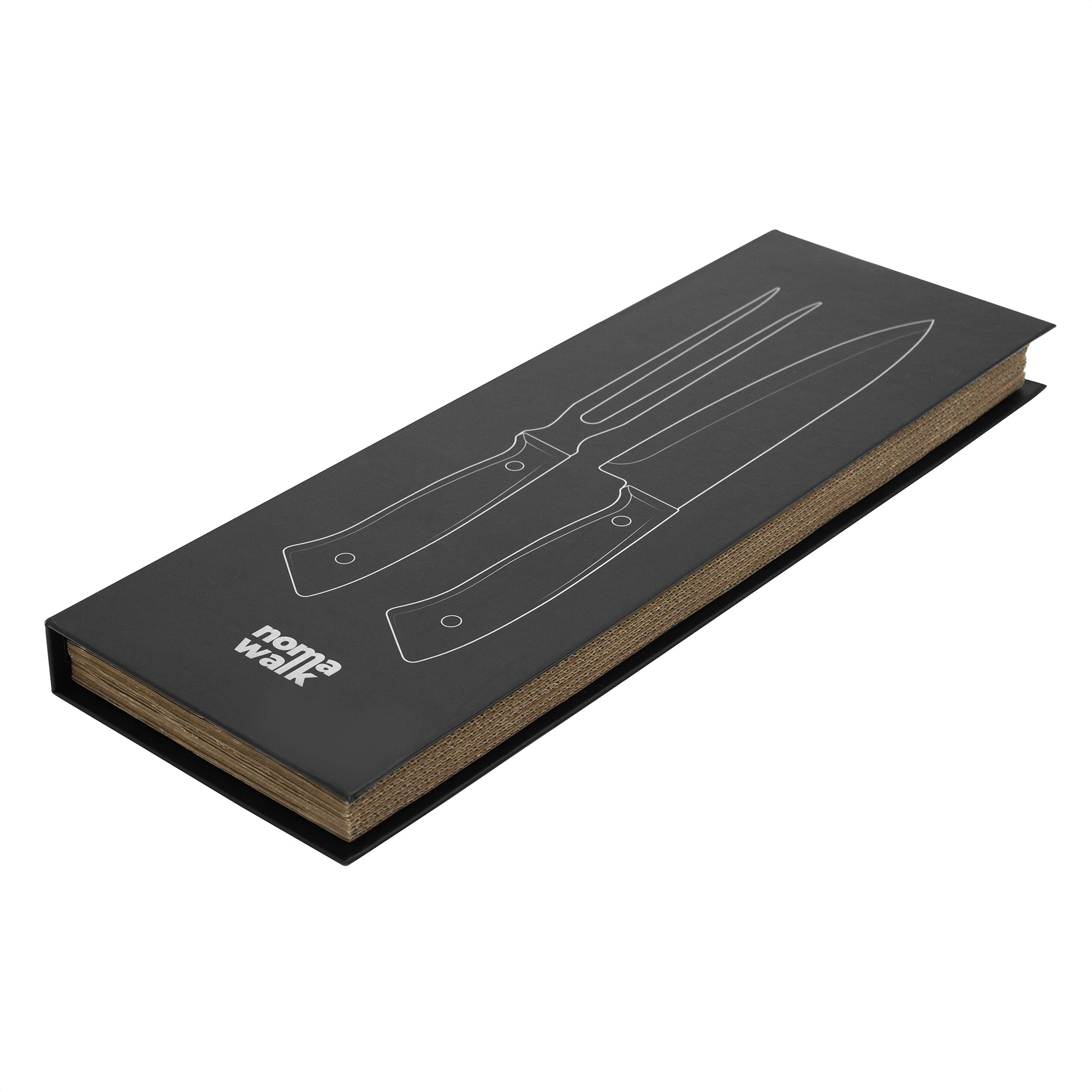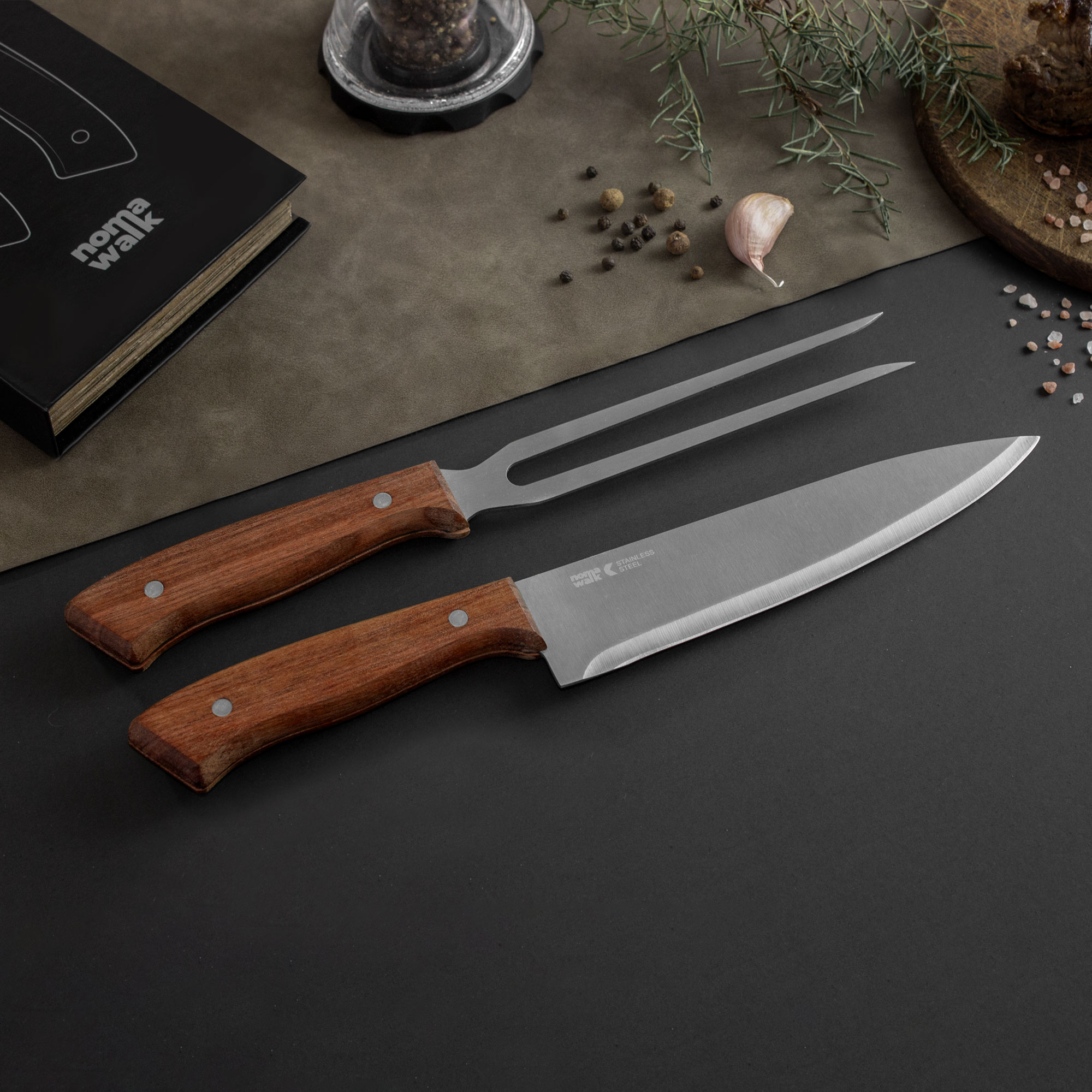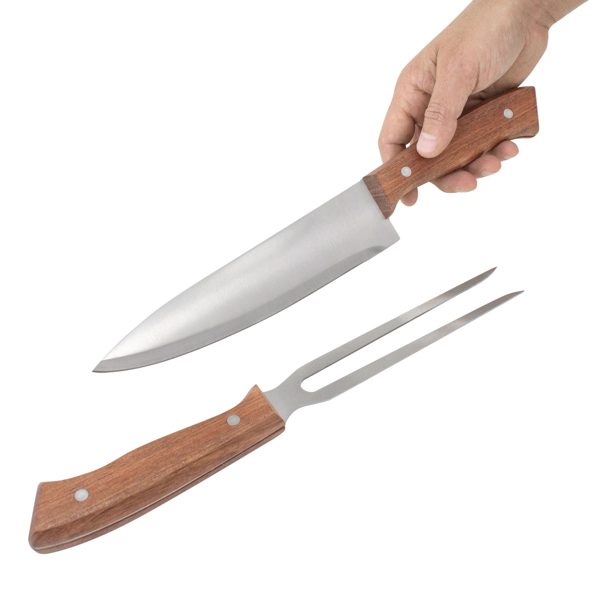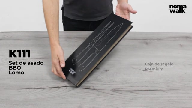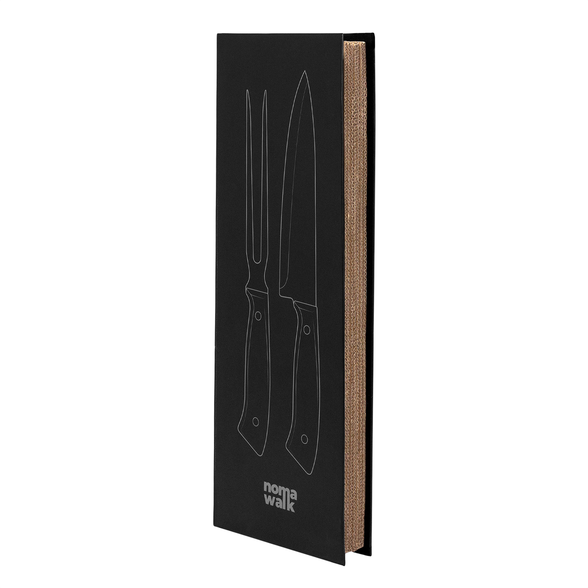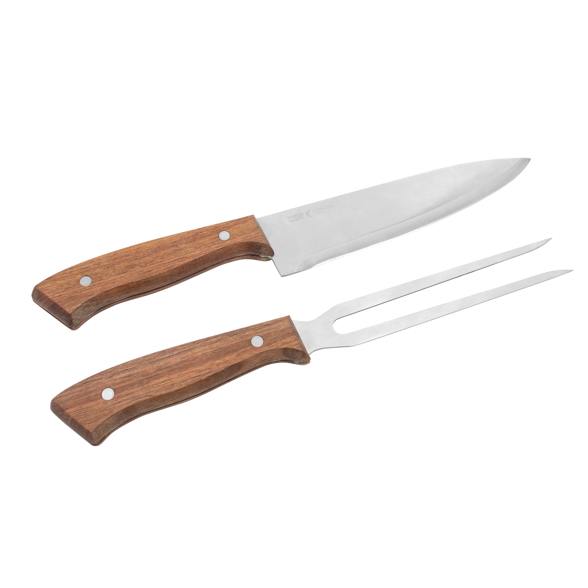 37,8 x 13 x 2,8 cm (caja cerrada). Acero inoxidable 420 y Madera de Acacia. Set de 2 utensilios: Cuchillo chef de 33,5 cm y 175 g. Tenedor de 31,3 cm y 125 g., ambos con mango de madera. Presentación en caja de regalo estilo libro.