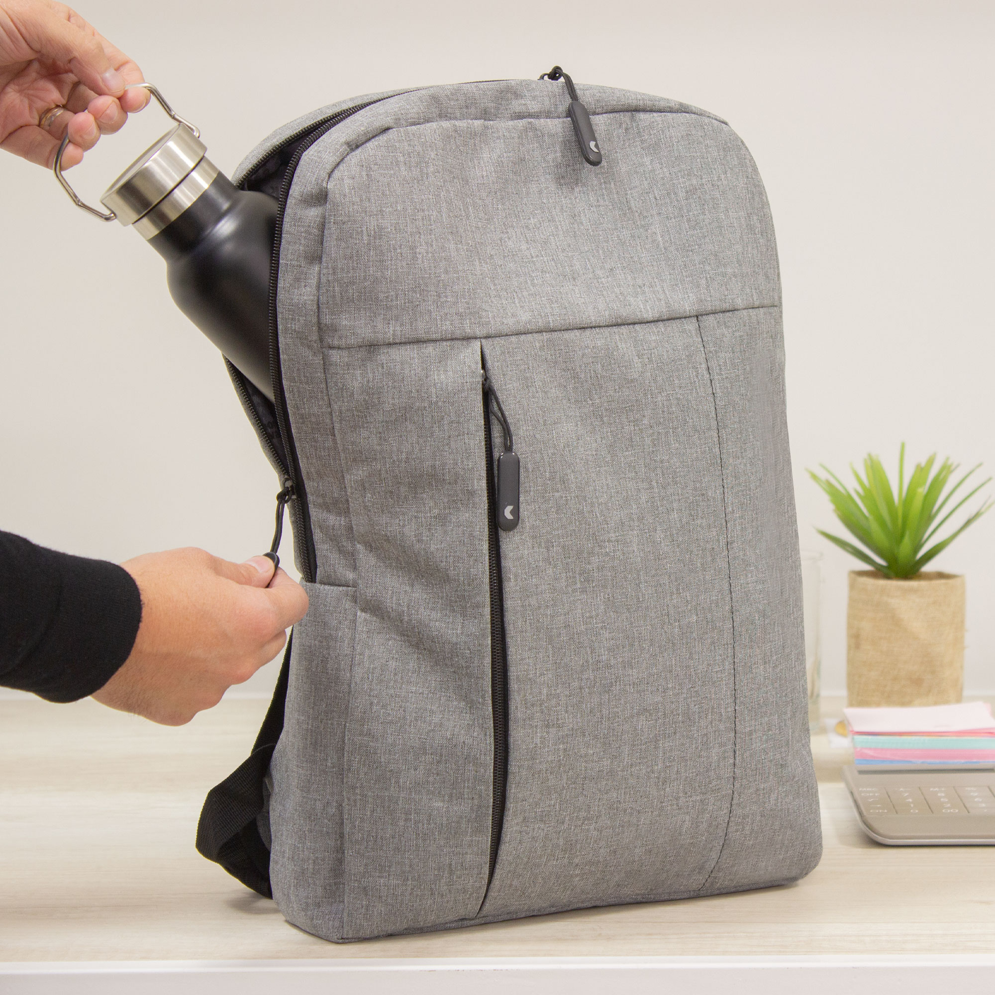30 x 44 x 8 cm. Capacidad 11 litros. Poliéster 300D . Mochila Portanotebook hasta 16'. Compartimento principal con cierre y bolsillo frontal con cierre lateral y detalle de costura vertical. En el interior posee un compartimento acolchado para notebook y un bolsillo adicional para tablet. Tiradores de cierre engomados. Presencia de marca en su interior y en una de sus correas.