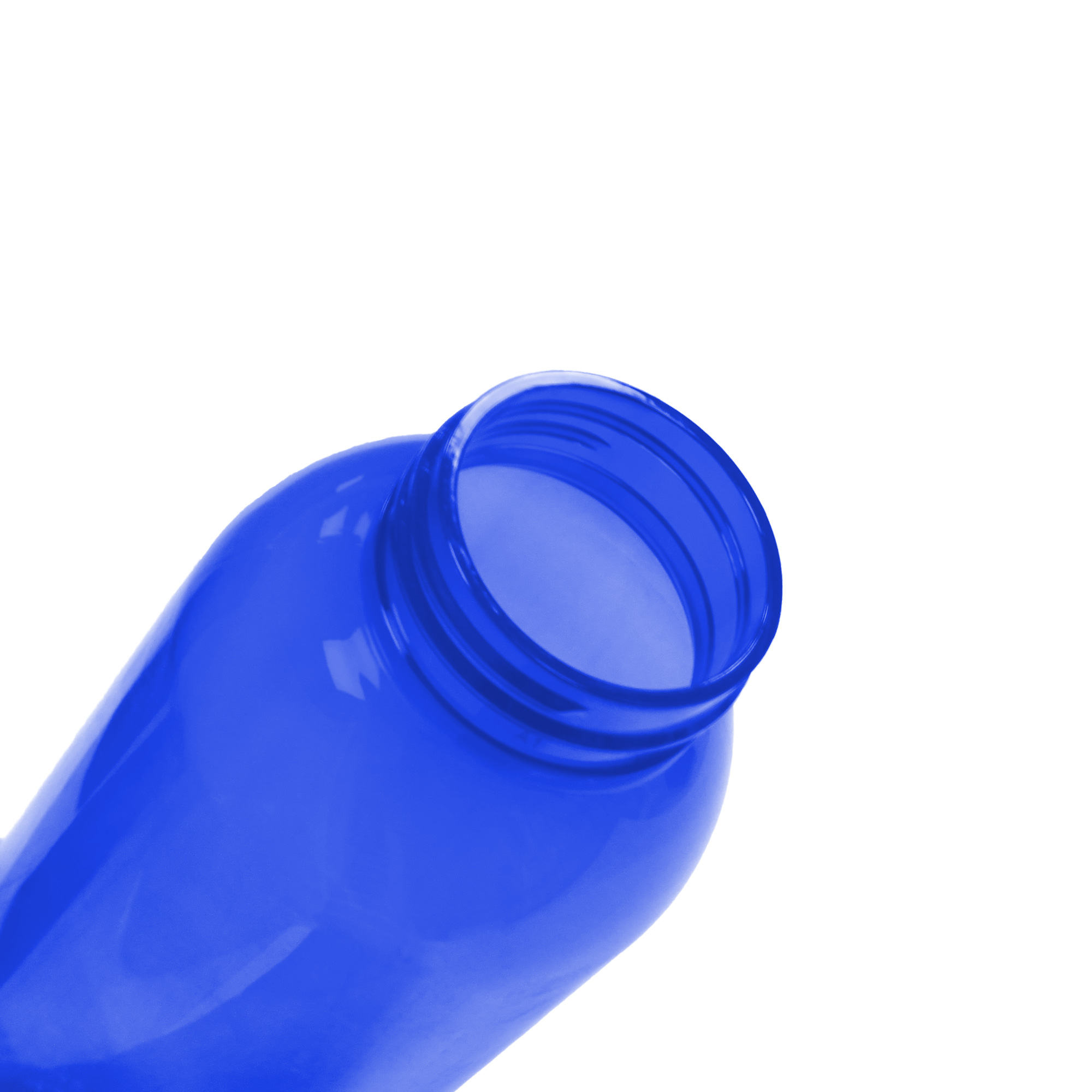 Botella de color translúcido con tapa a rosca plástica de color blanco con correa de silicona del mismo color de la botella.