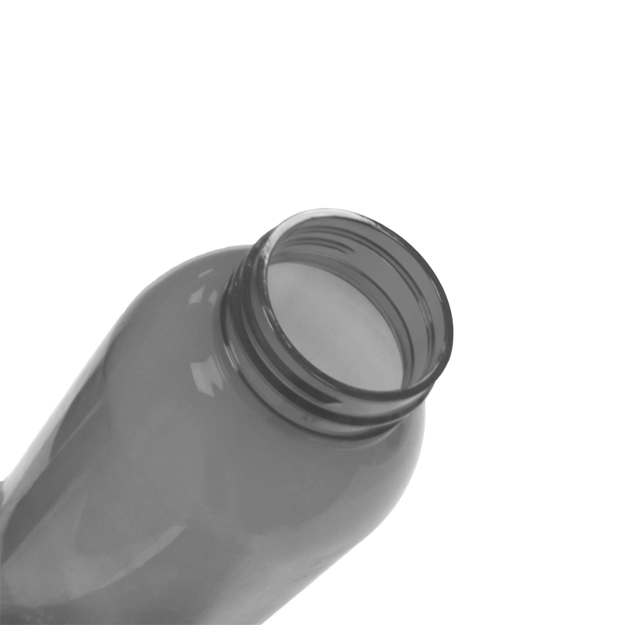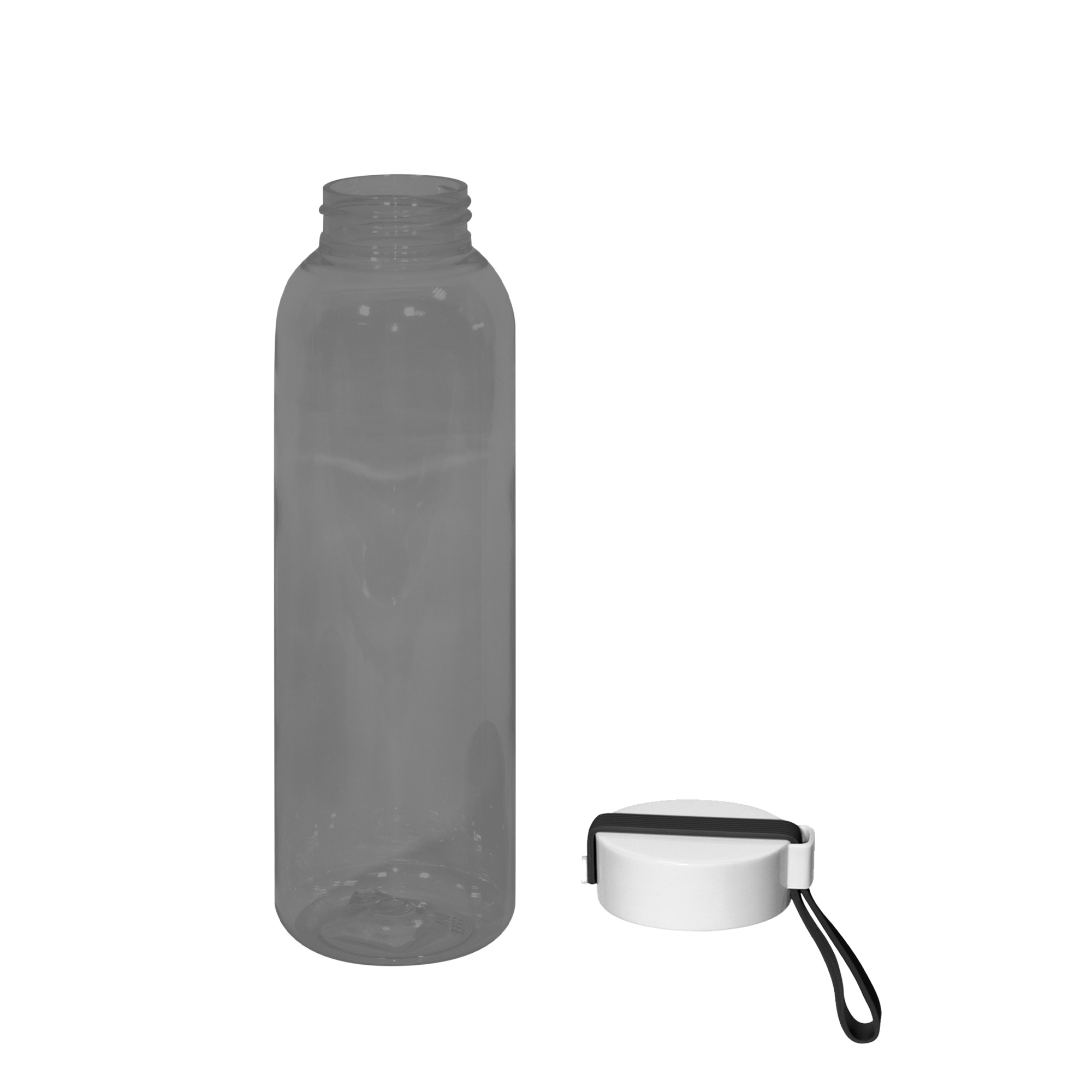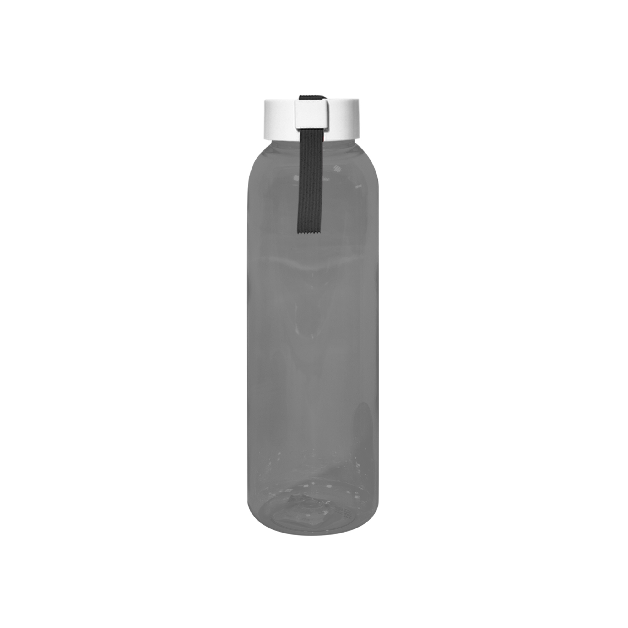 Botella de color translúcido con tapa a rosca plástica de color blanco con correa de silicona del mismo color de la botella.