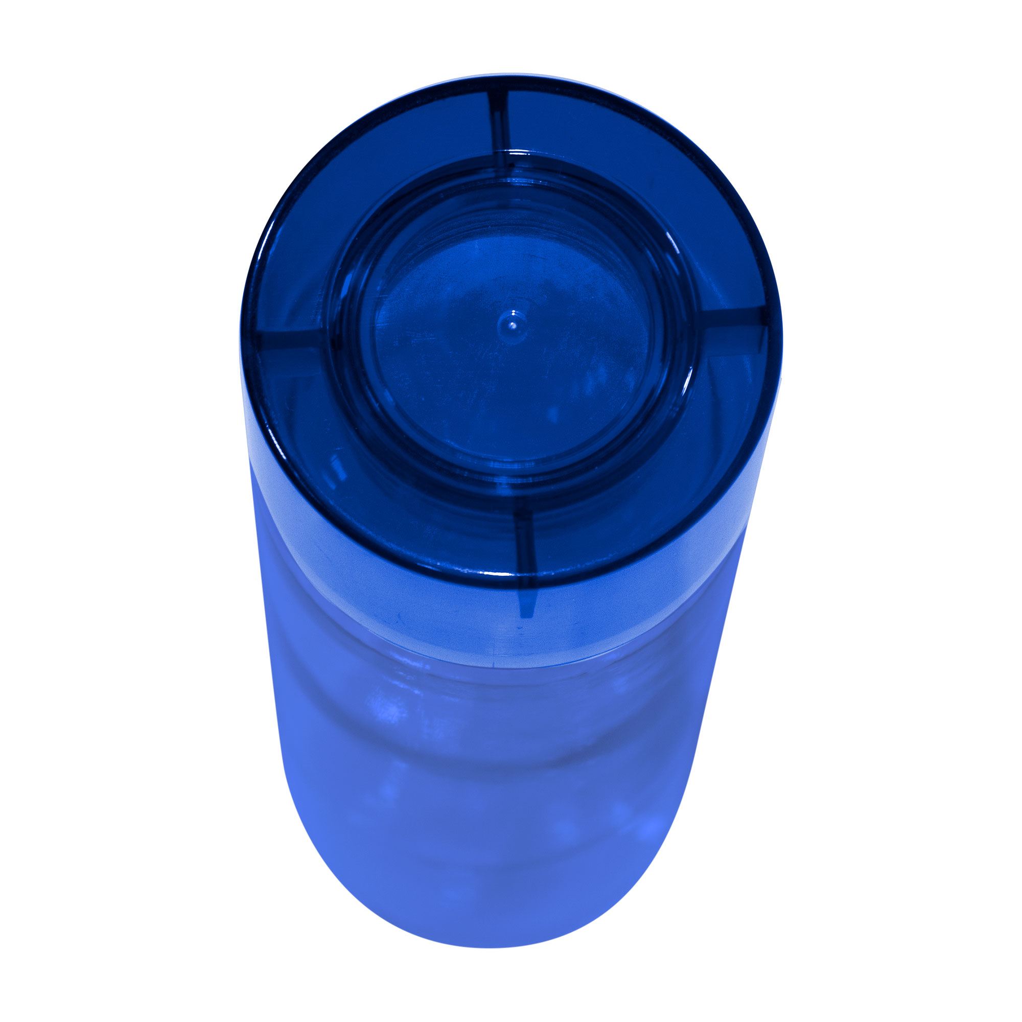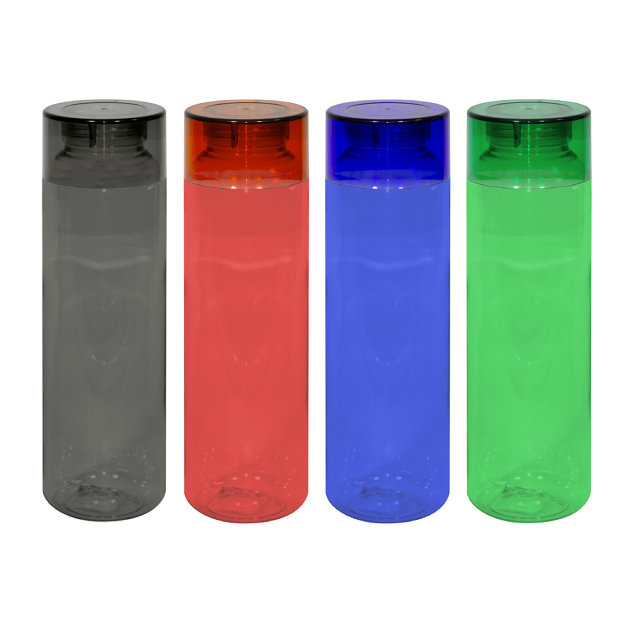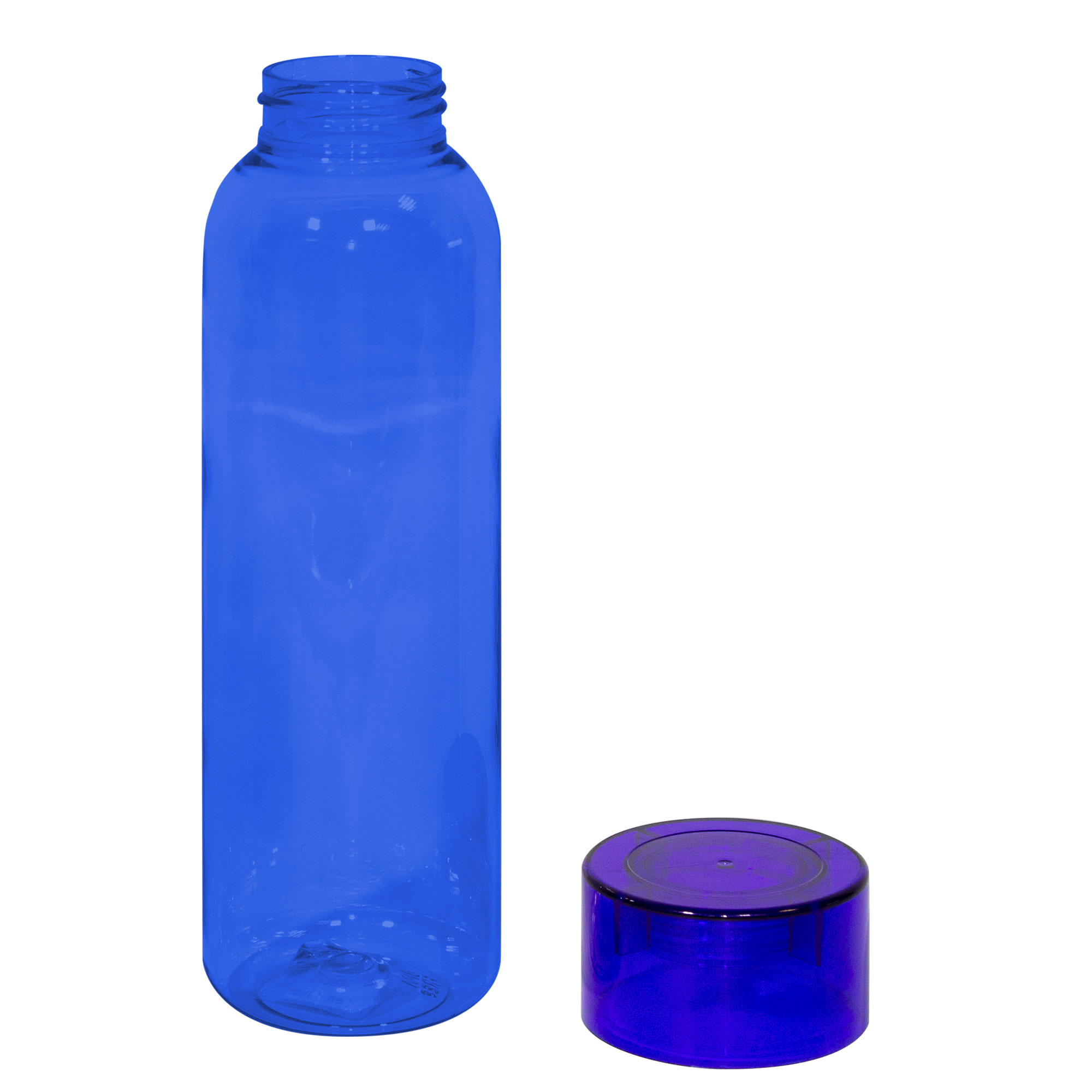 Botella de plástico de colores translúcidos con tapa a rosca plástica.