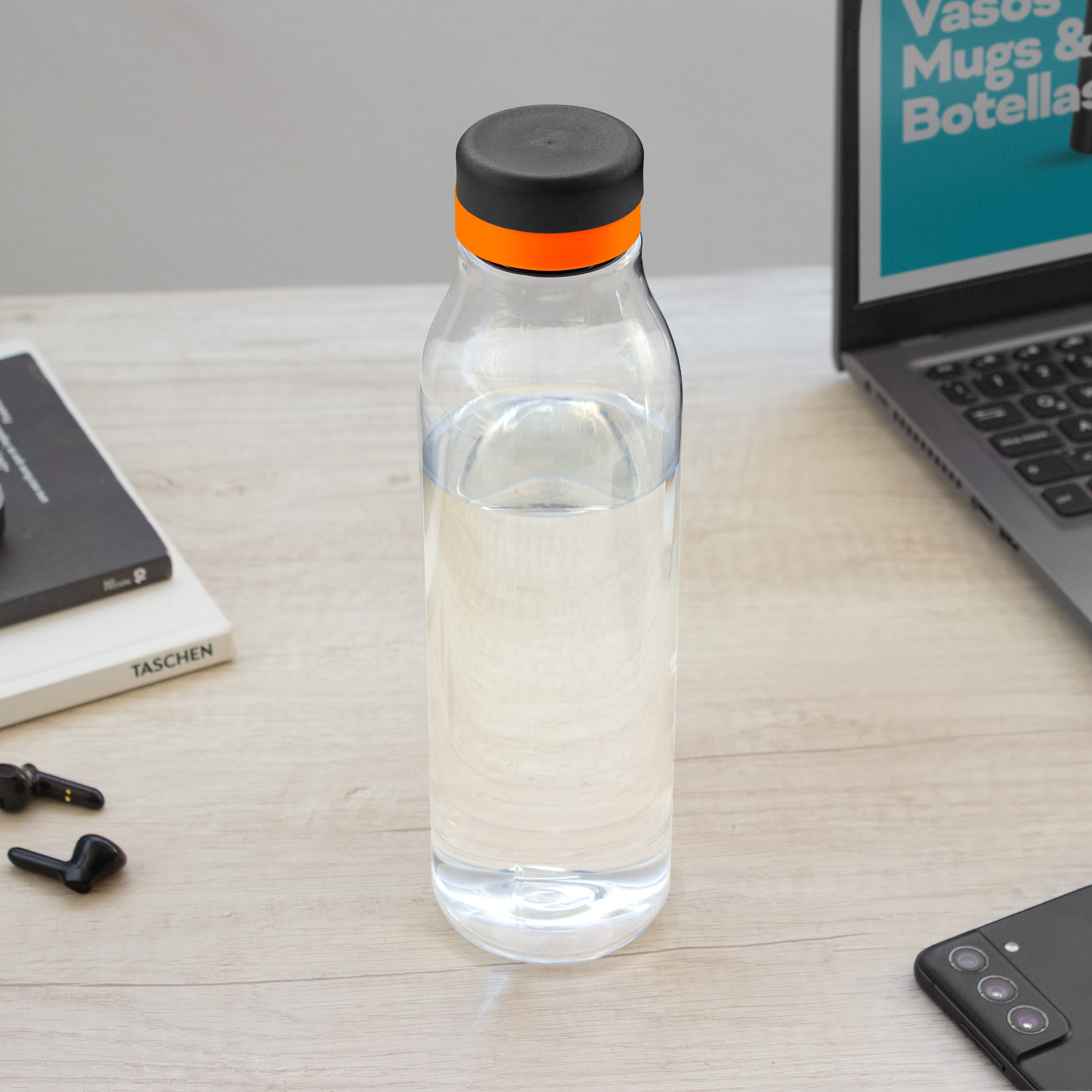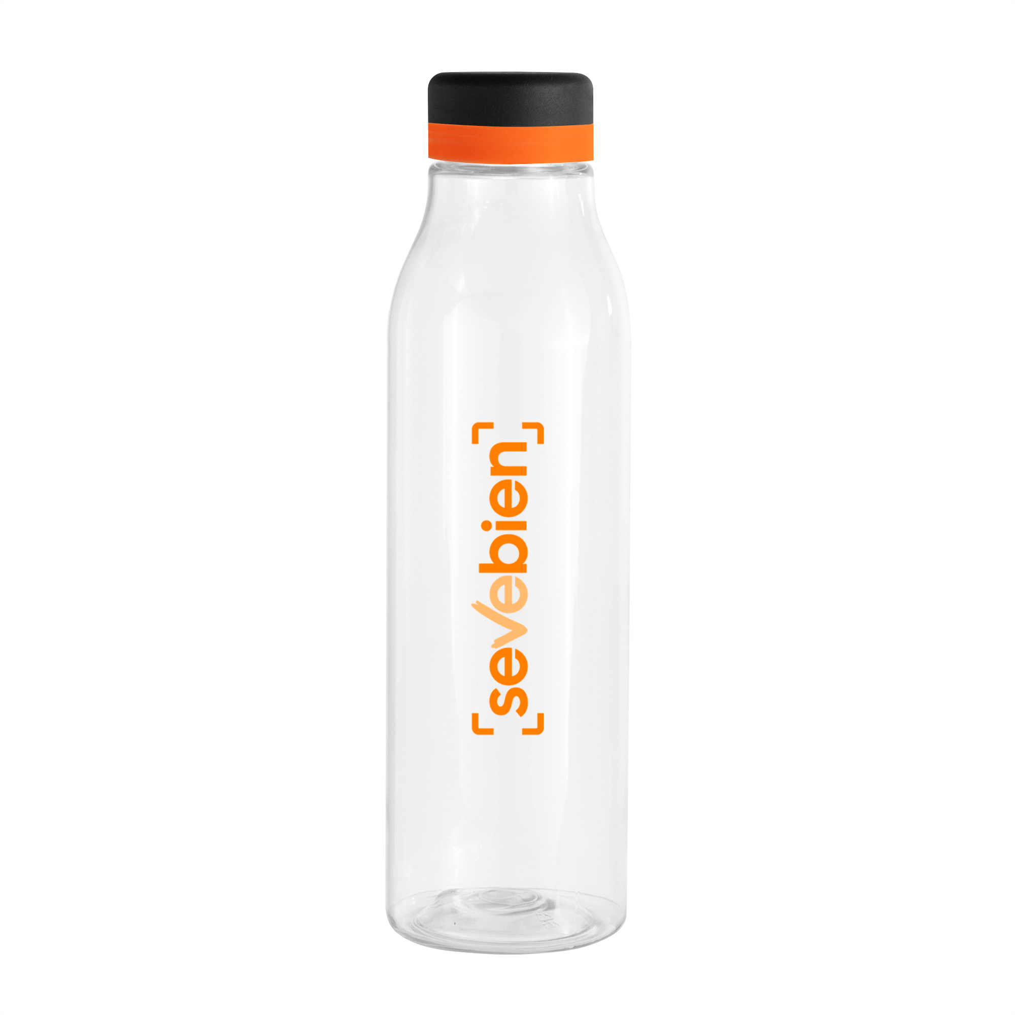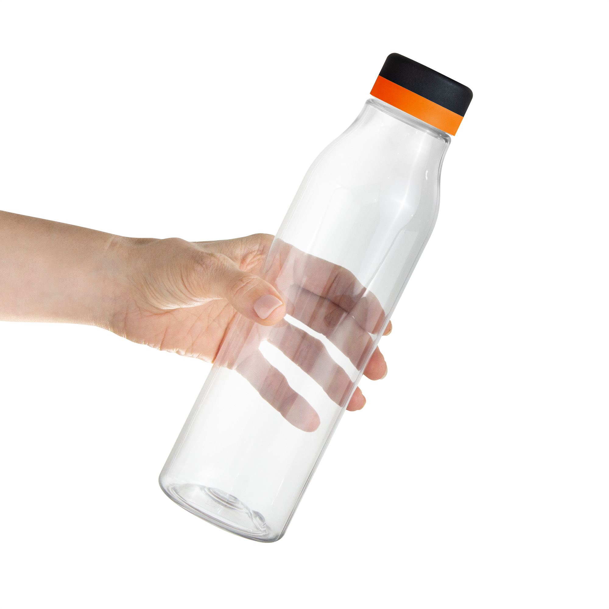 Botella de plástico transparente con tapa a rosca color negro mate con anillo de silicona de diferentes colores.