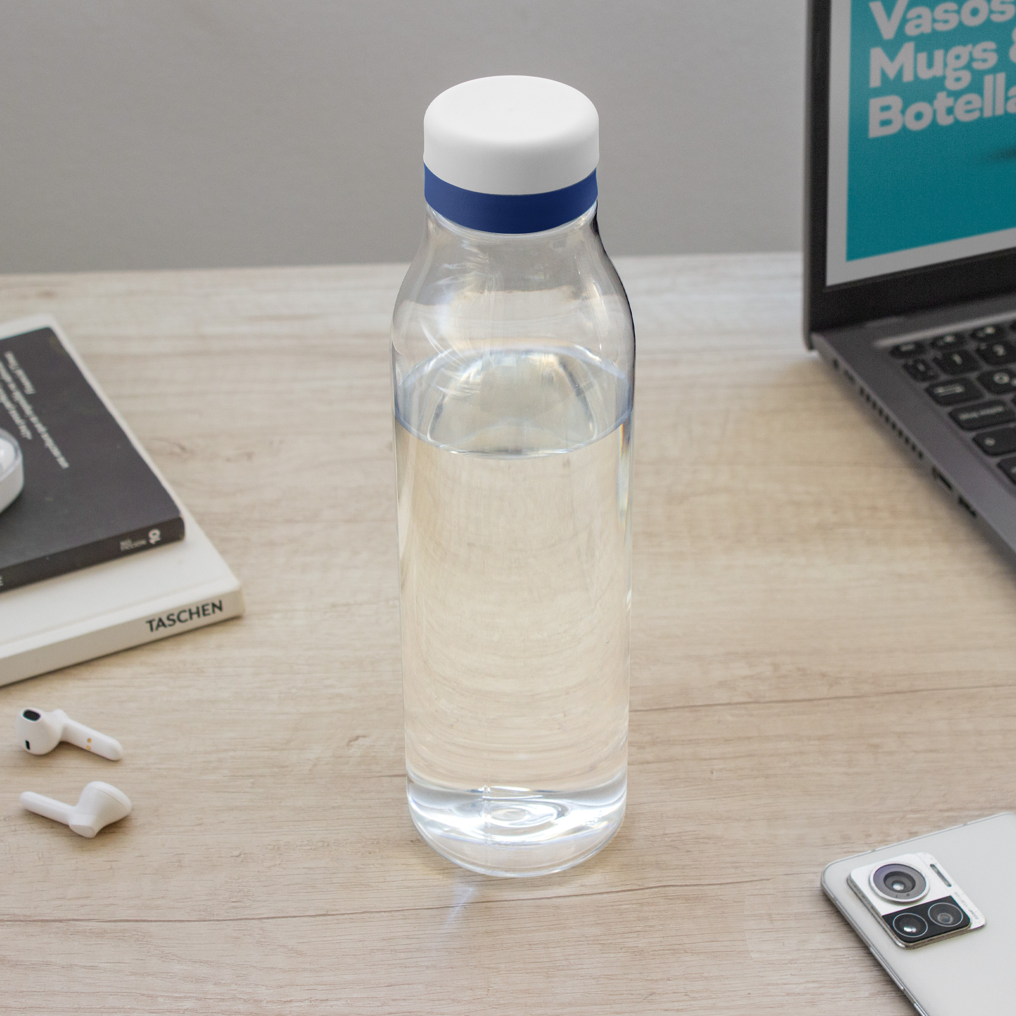 Botella de plástico transparente con tapa a rosca color blanco mate con anillo de silicona de diferentes colores.