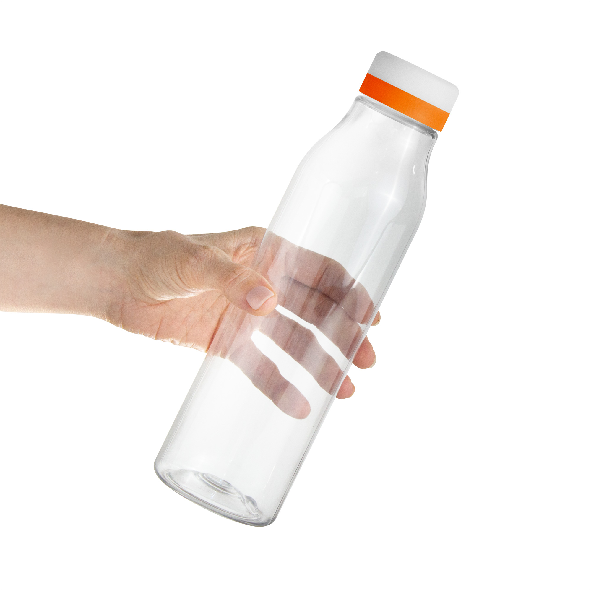 Botella de plástico transparente con tapa a rosca color blanco mate con anillo de silicona de diferentes colores.