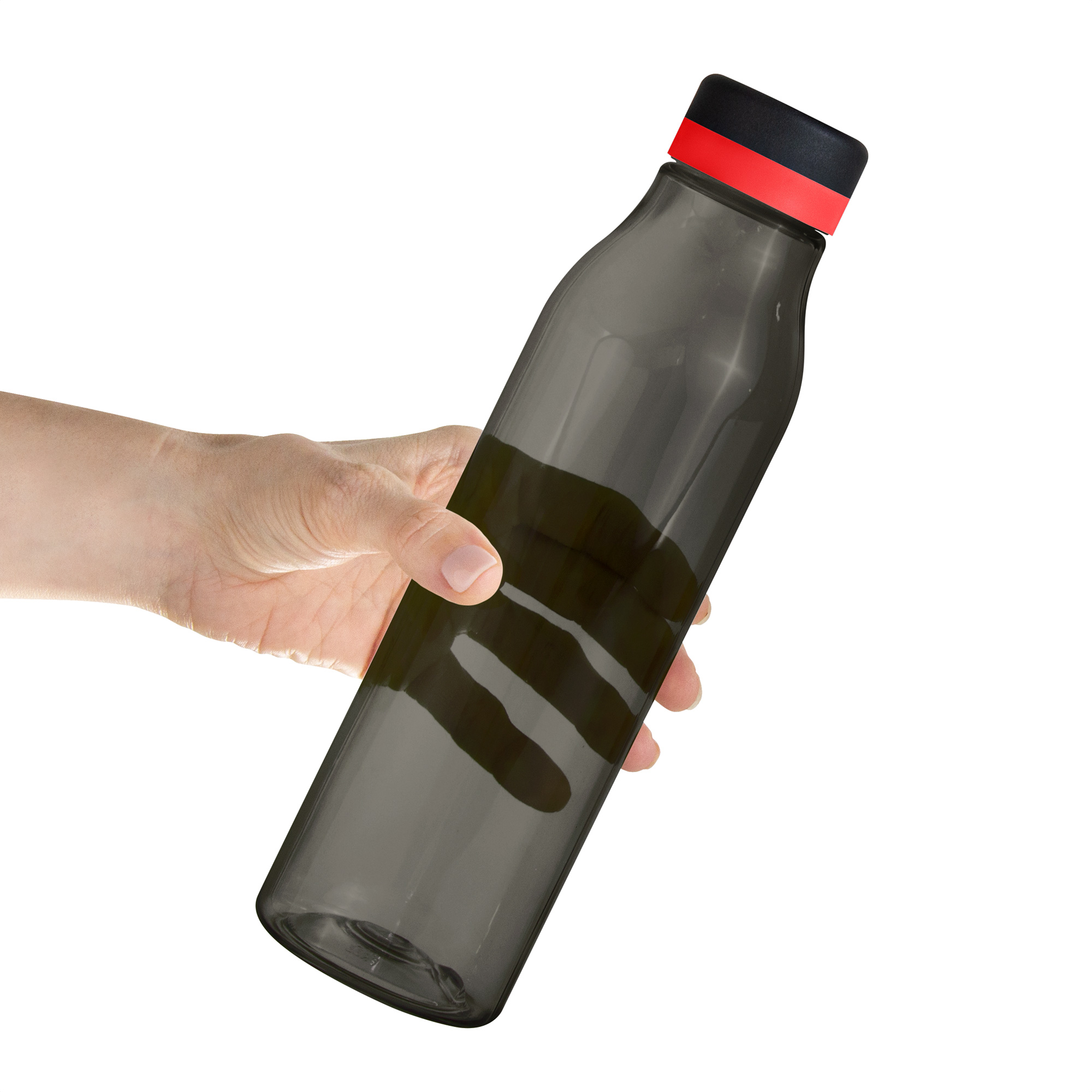 Botella de plástico color negro con tapa a rosca color negro mate con anillo de silicona de diferentes colores.