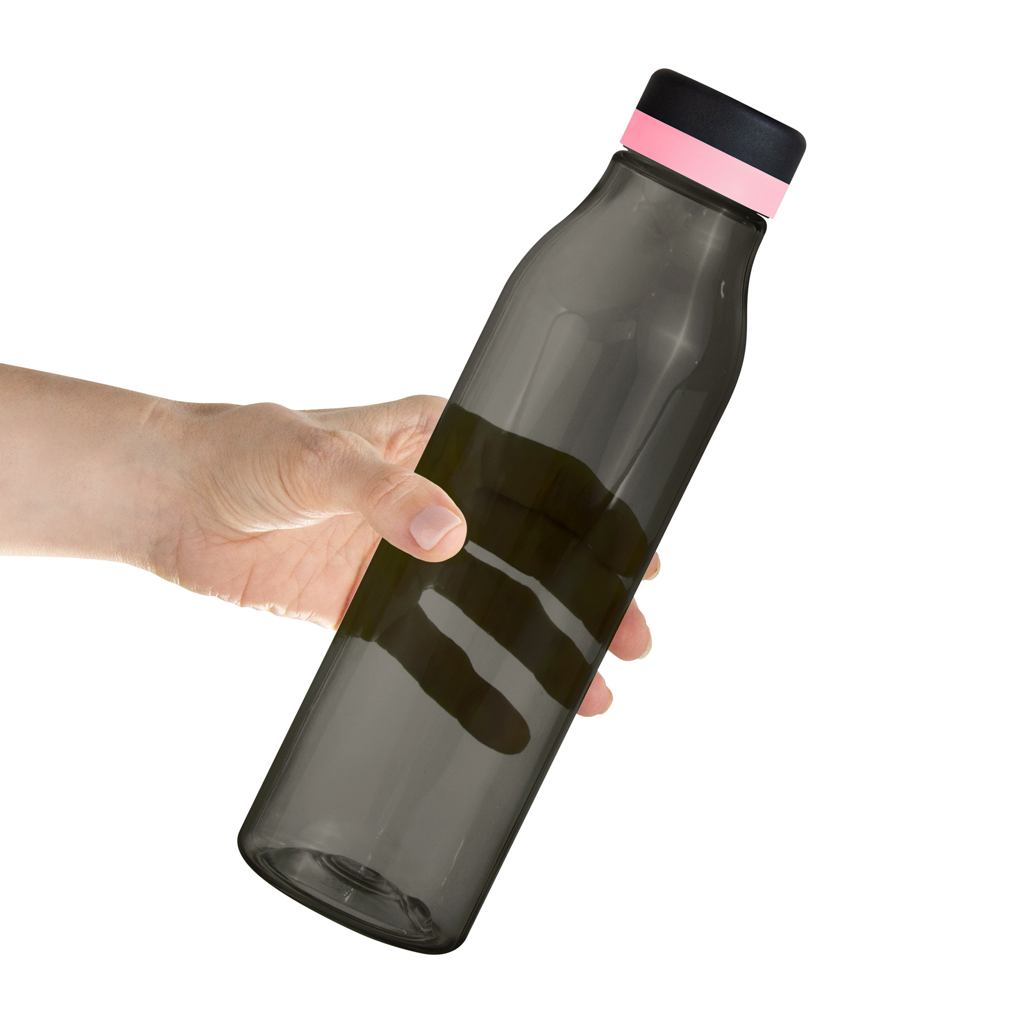 Botella de plástico color negro con tapa a rosca color negro mate con anillo de silicona de diferentes colores.