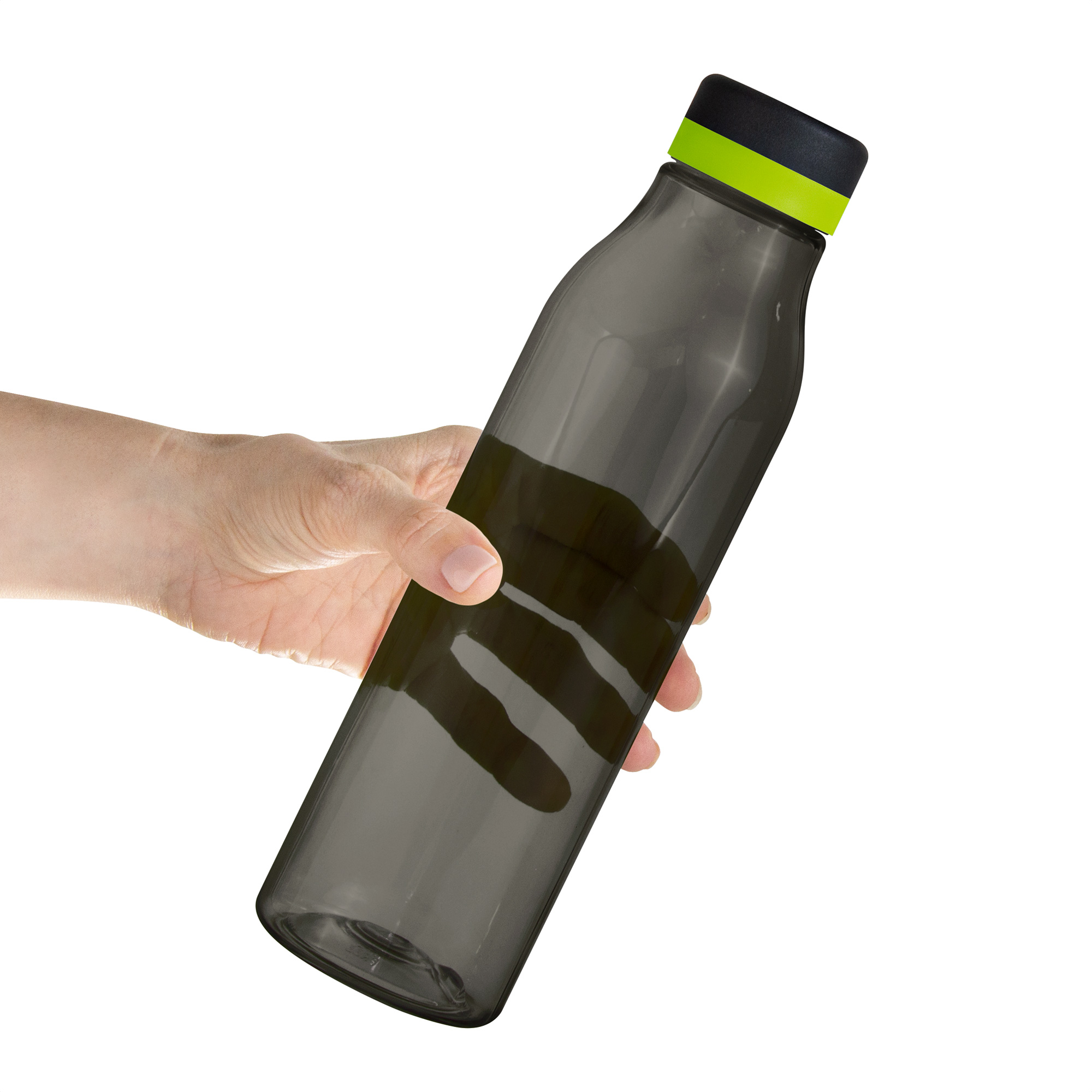 Botella de plástico color negro con tapa a rosca color negro mate con anillo de silicona de diferentes colores.