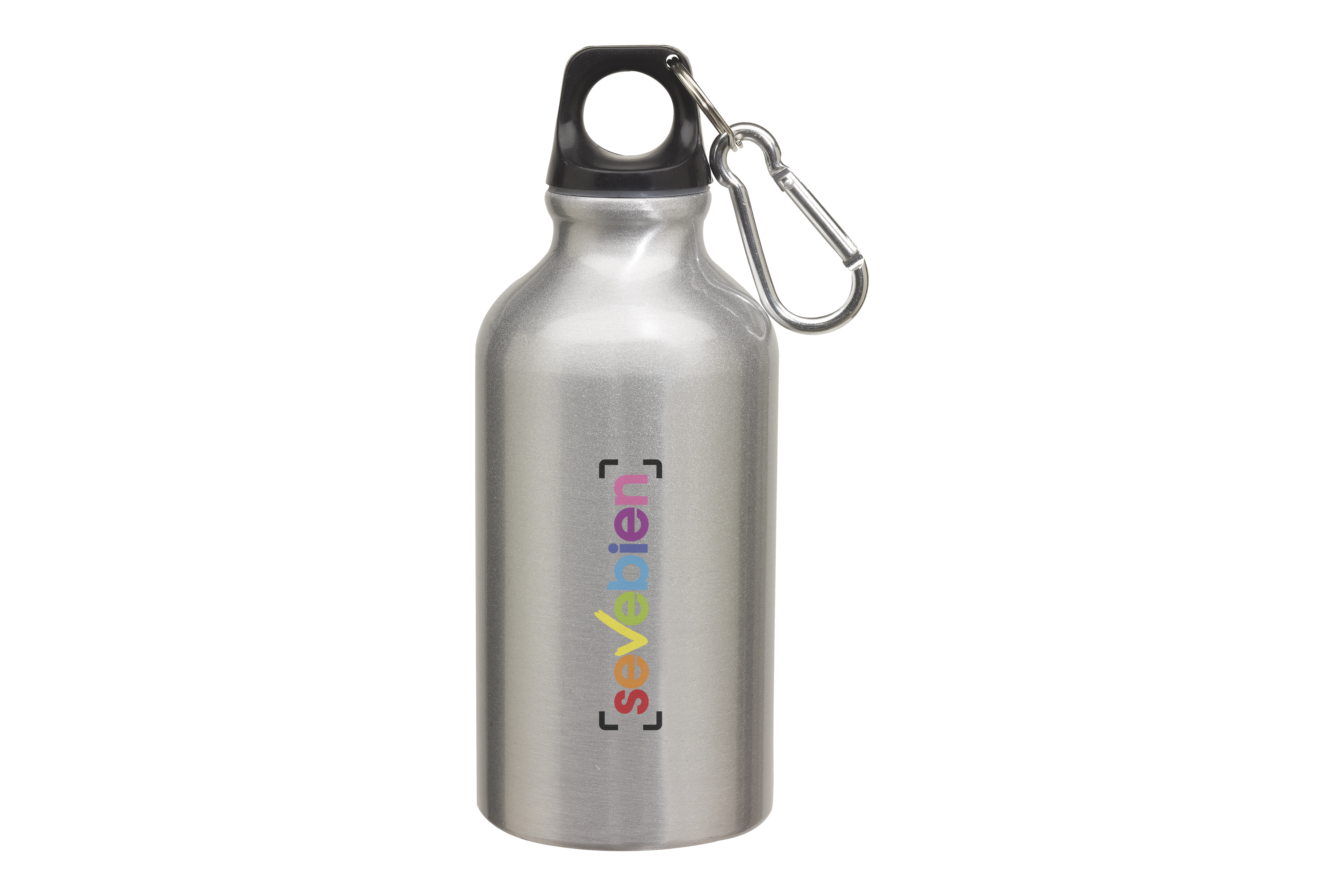 Ø 6,5 x 17,5 cm. Capacidad 400 ml. Aluminio. Botella de aluminio con cierre de plástico y carabina metálica.