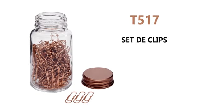 Ø 4,5 x 8,5 cm. Vidrio y metal. Set de clips metálicos en frasco de vidrio con tapa metálica.