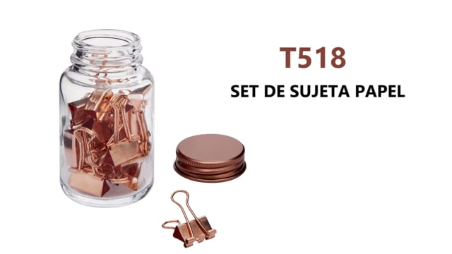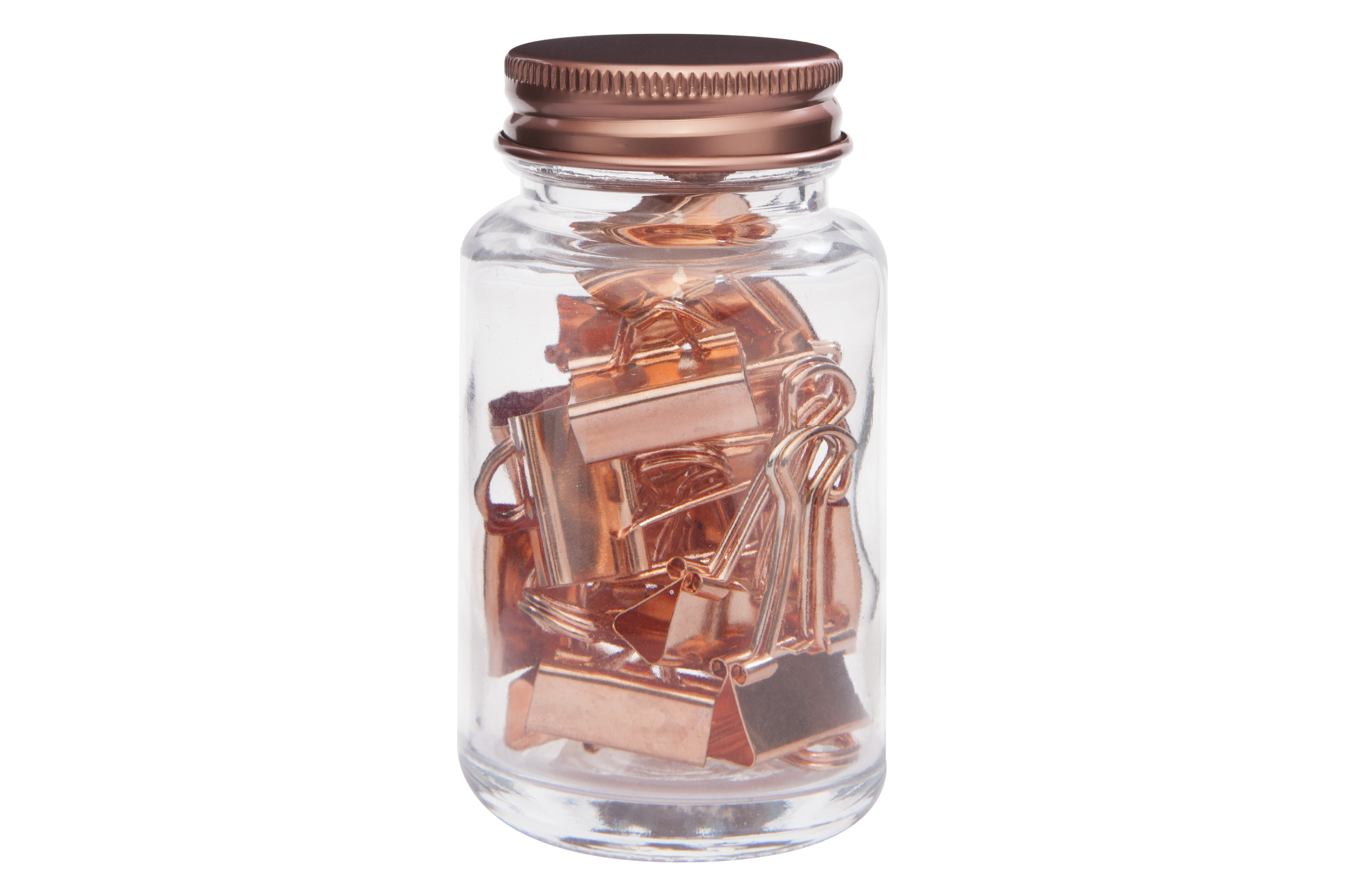 Ø 4,5 x 8,5 cm. Vidrio y metal. Set de sujeta papeles metálicos en frasco de vidrio con tapa metálica.