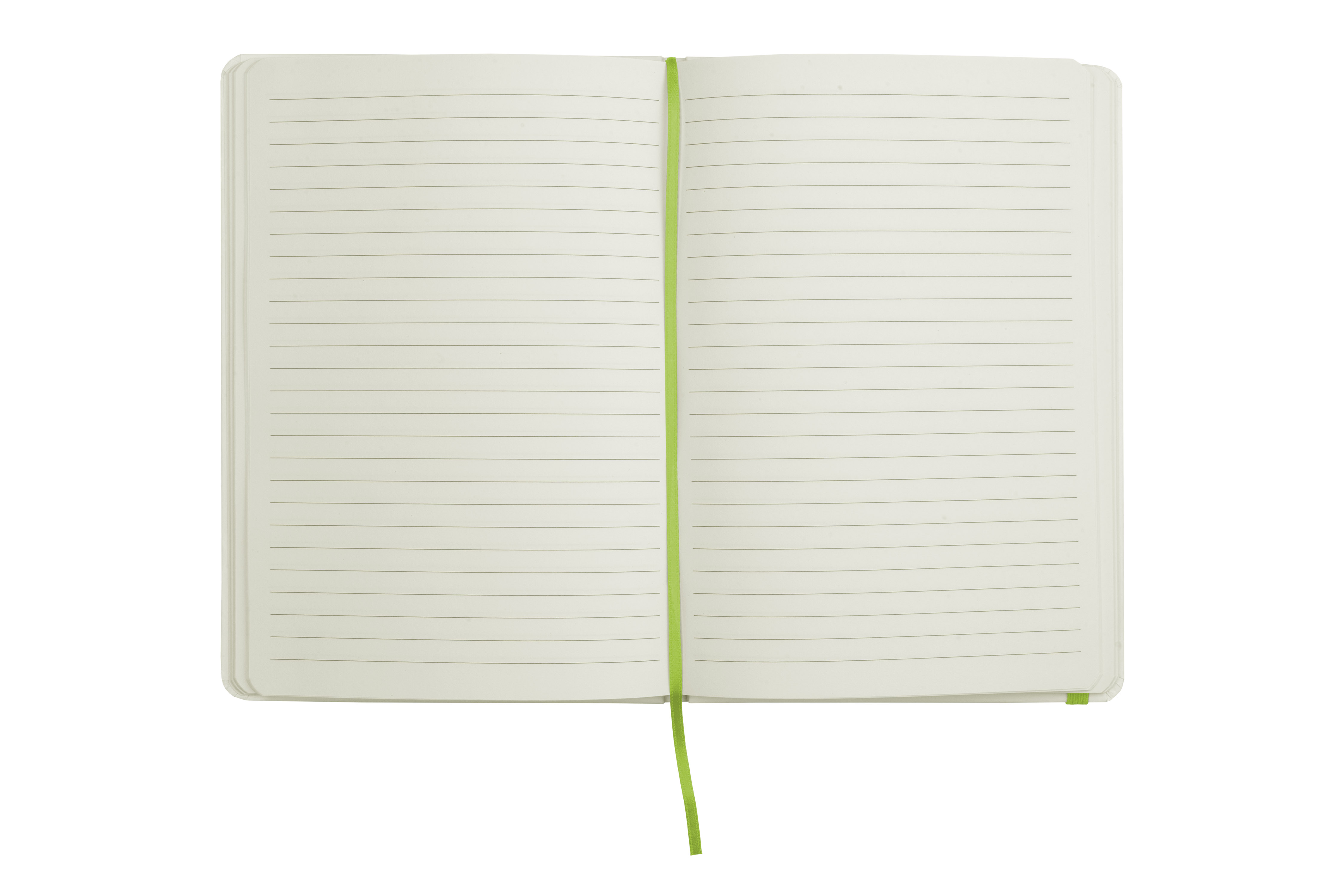 21 x 14,5 x 1 cm. Cartón. Libreta de tapa dura color blanco. Contiene 80 hojas rayadas, señalador y cierra con banda elástica del mismo color.