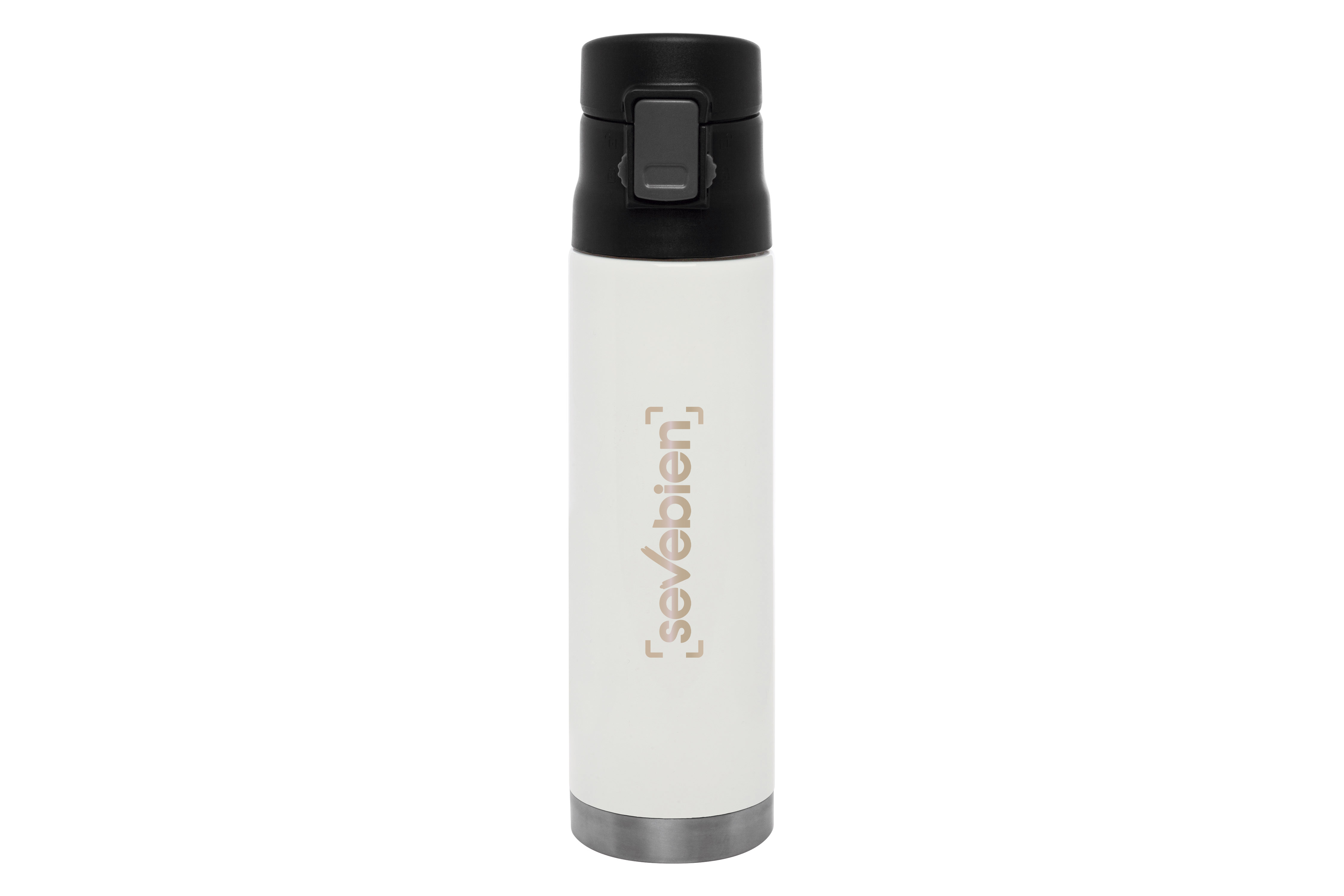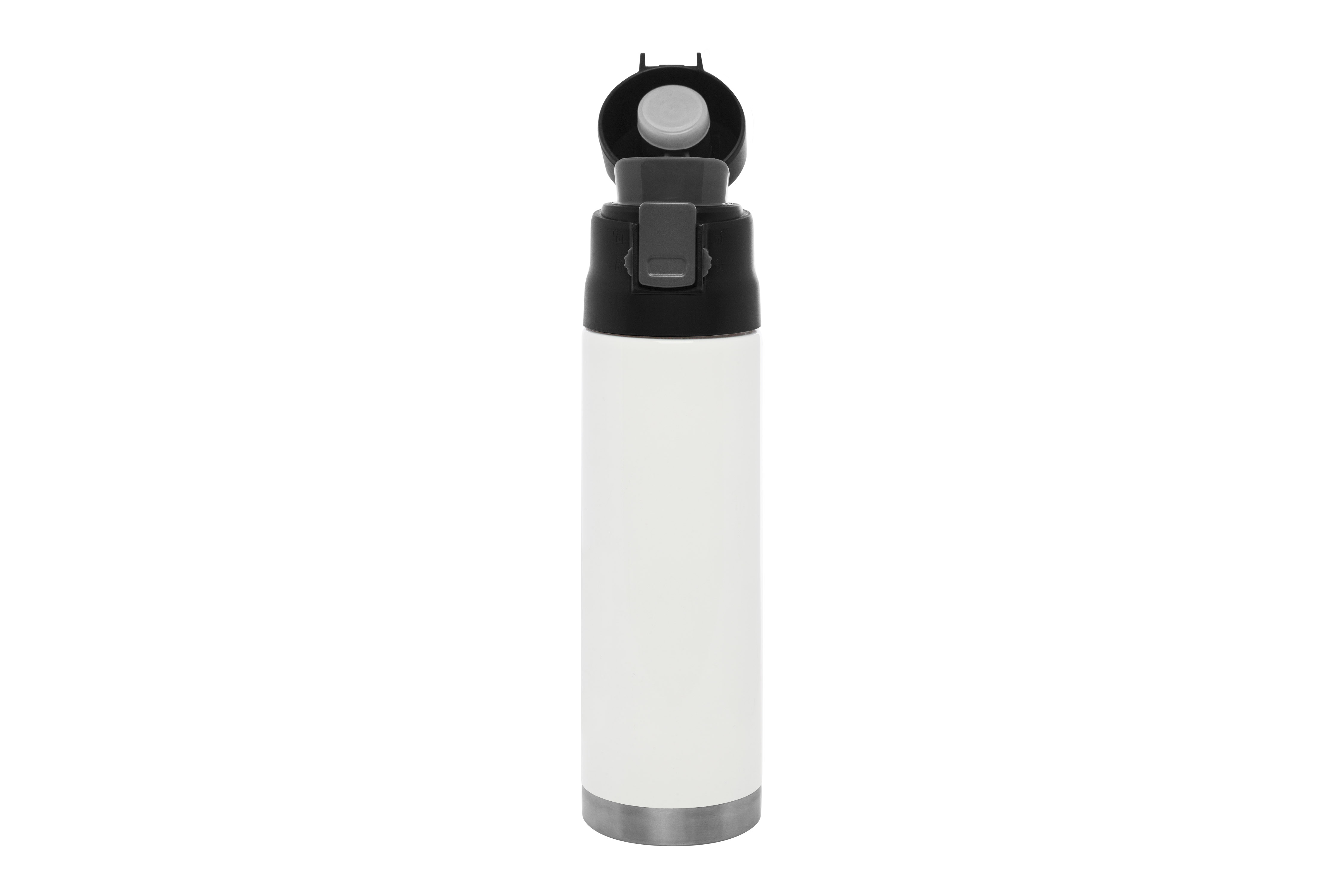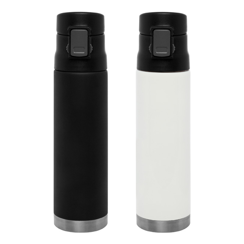 Ø 7 x 25,5 cm. Capacidad 500 ml. Acero inoxidable. Mug doble pared. Interior de acero 304 y exterior de acero 201. Tapa plástica con botón a presión de apertura. Traba de seguridad. Mantiene las bebidas frías y calientes por más tiempo. Presentación en caja de regalo.