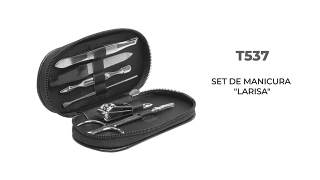 11 x 5 x 2 cm. (cerrado) 11 x 12,5 x 1,1 cm. (abierto). Set de manicura. Metal y simil cuero. Estuche organizador con cierre que contiene: tijera, alicate, 2 limpia cutículas, lima metálica y pinza de depilar.