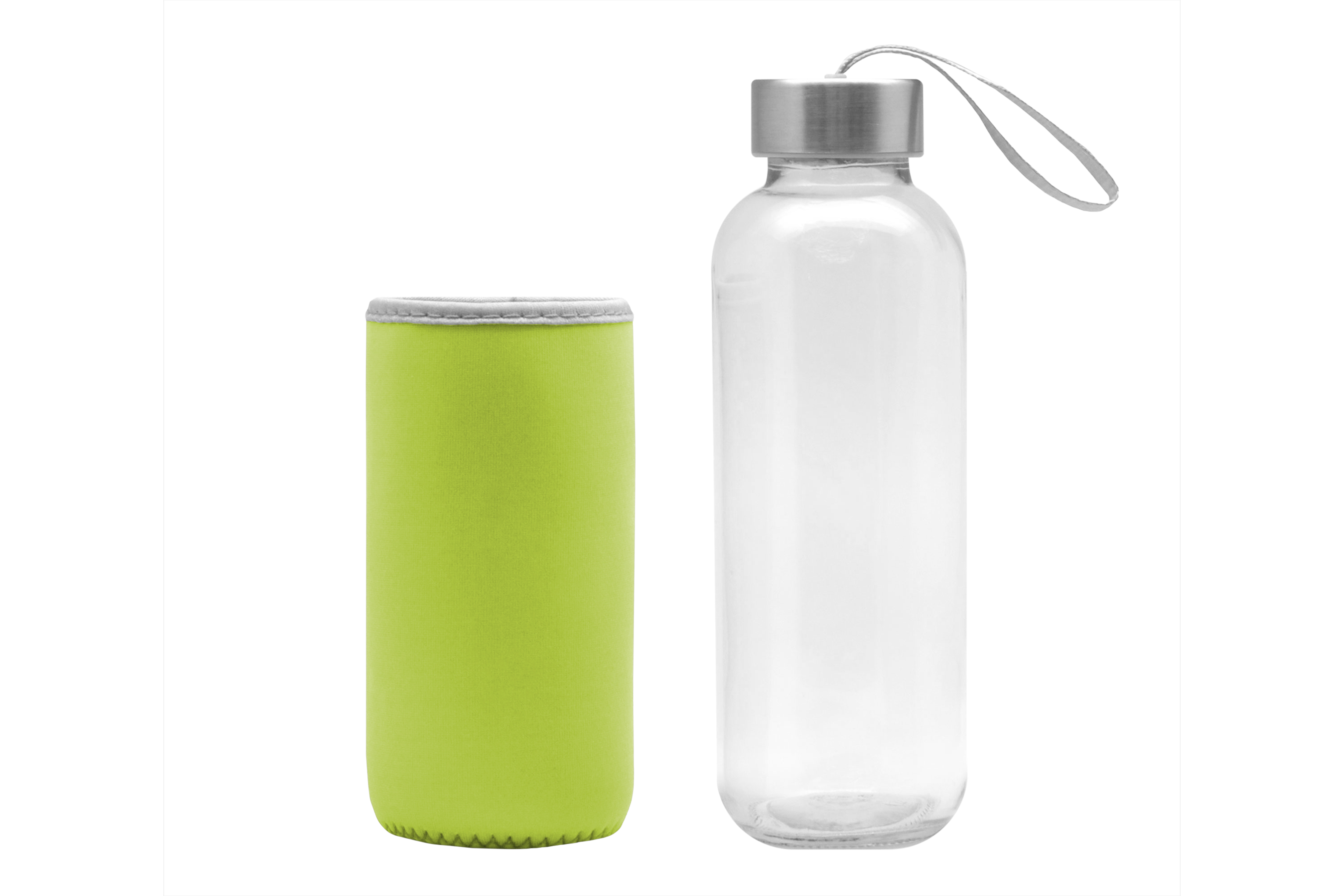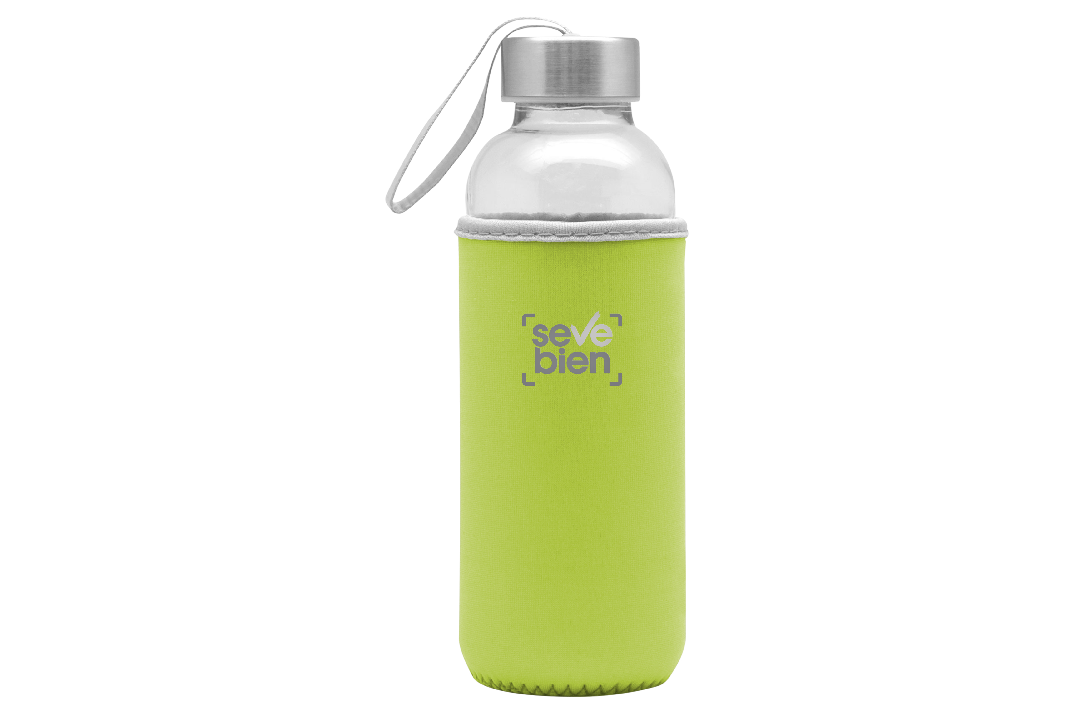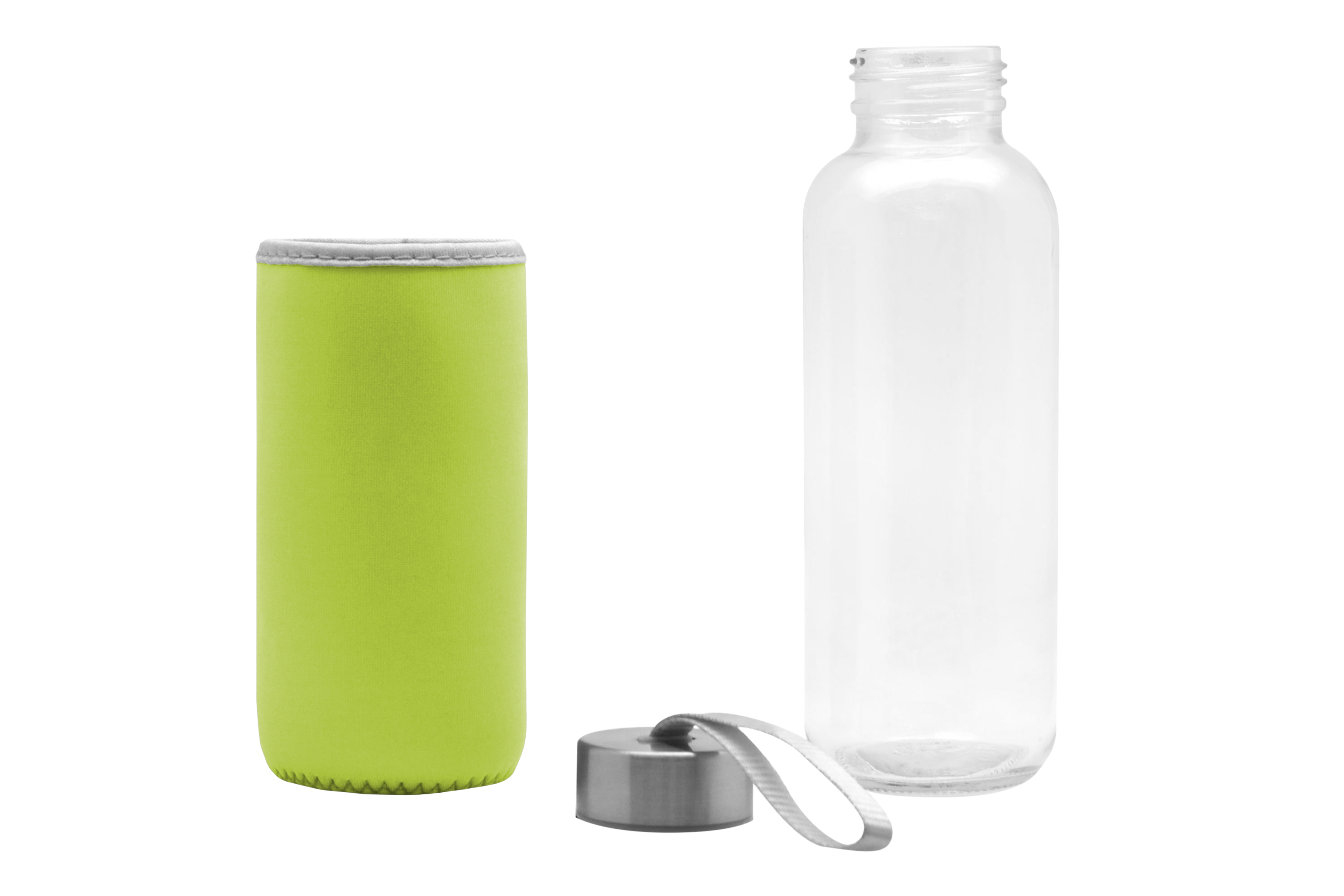 Ø 5,5 x 19,5 cm. Capacidad 440 ml. Vidrio. Cuerpo traslúcido. Funda de neopreno para proteger la botella y mantener la temperatura de las bebidas. Tapa de acero inoxidable con tira de tela. Botella apta para microondas y lavavajillas. Tapa y funda no pueden ser expuestos a estos electrodomésticos. Presentación en caja de regalo.