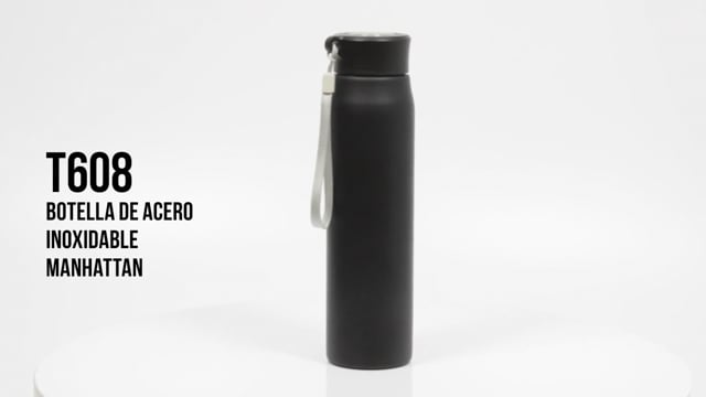 Ø 6,5 x 25 cm. Capacidad 800ml. Acero inoxidable. Botella de acero inoxidable 304. Tapa combinada en plástico y acero inoxidable 201 con tira de color gris de 12 cm de largo. Ideal para llevarla a todos lados. Presentación en caja de regalo.