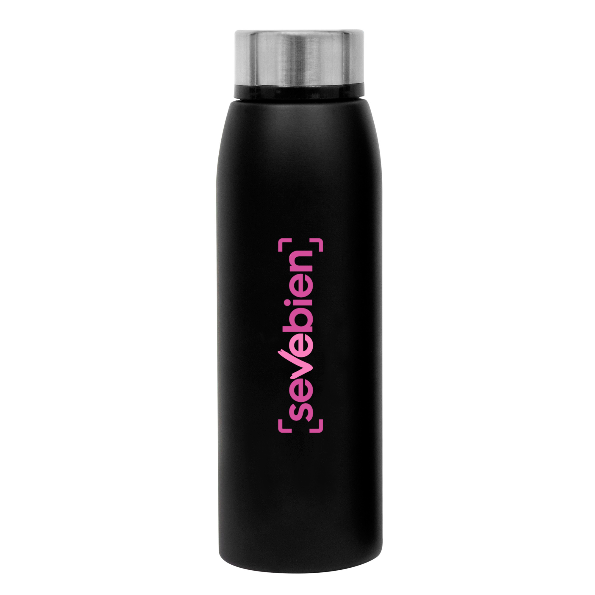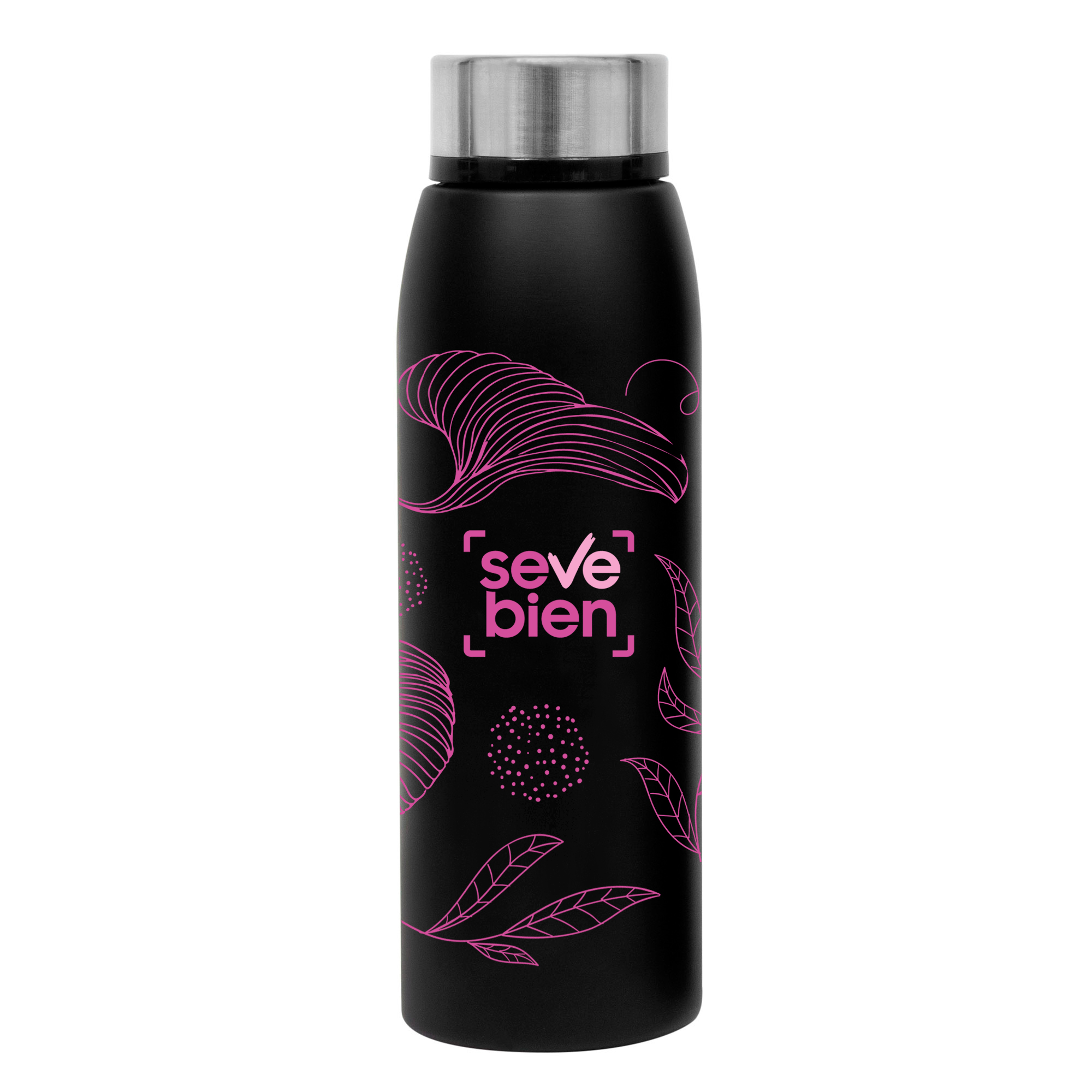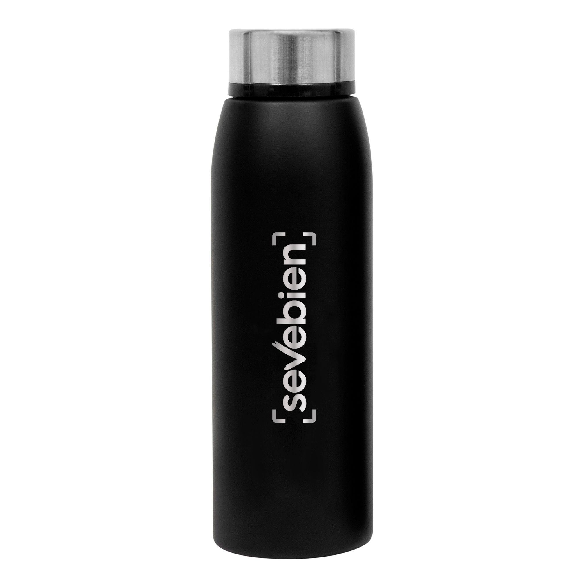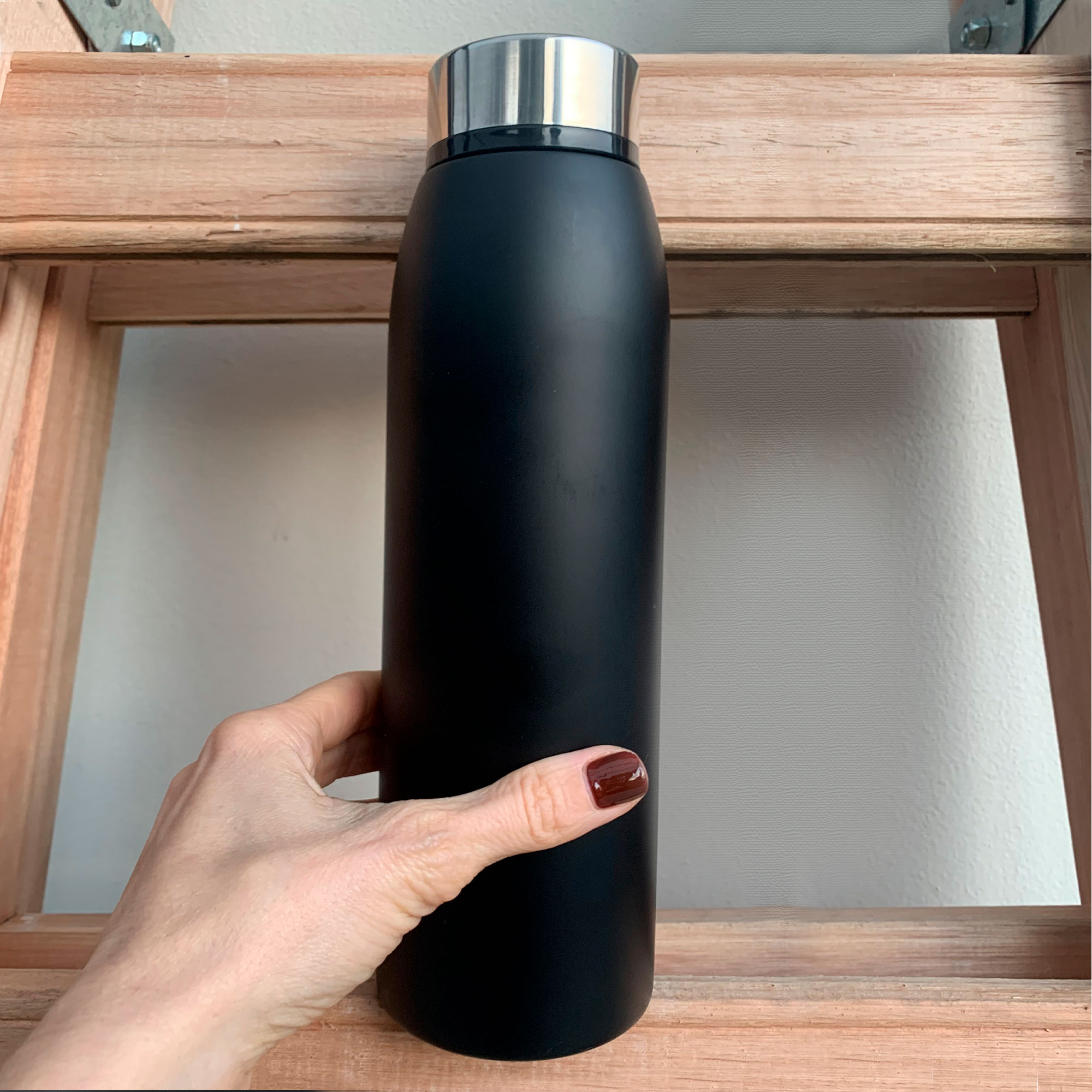Ø 7 x 23,5 cm. Capacidad 500 ml. Botella doble pared, sellada al vacío. Interior de acero 304 y exterior de acero 201. Cuerpo color negro y tapa a rosca de acero. Mantiene hasta 12 hs la temperatura de las bebidas calientes y 24 hs de las bebidas frías. Presentación en caja de regalo.