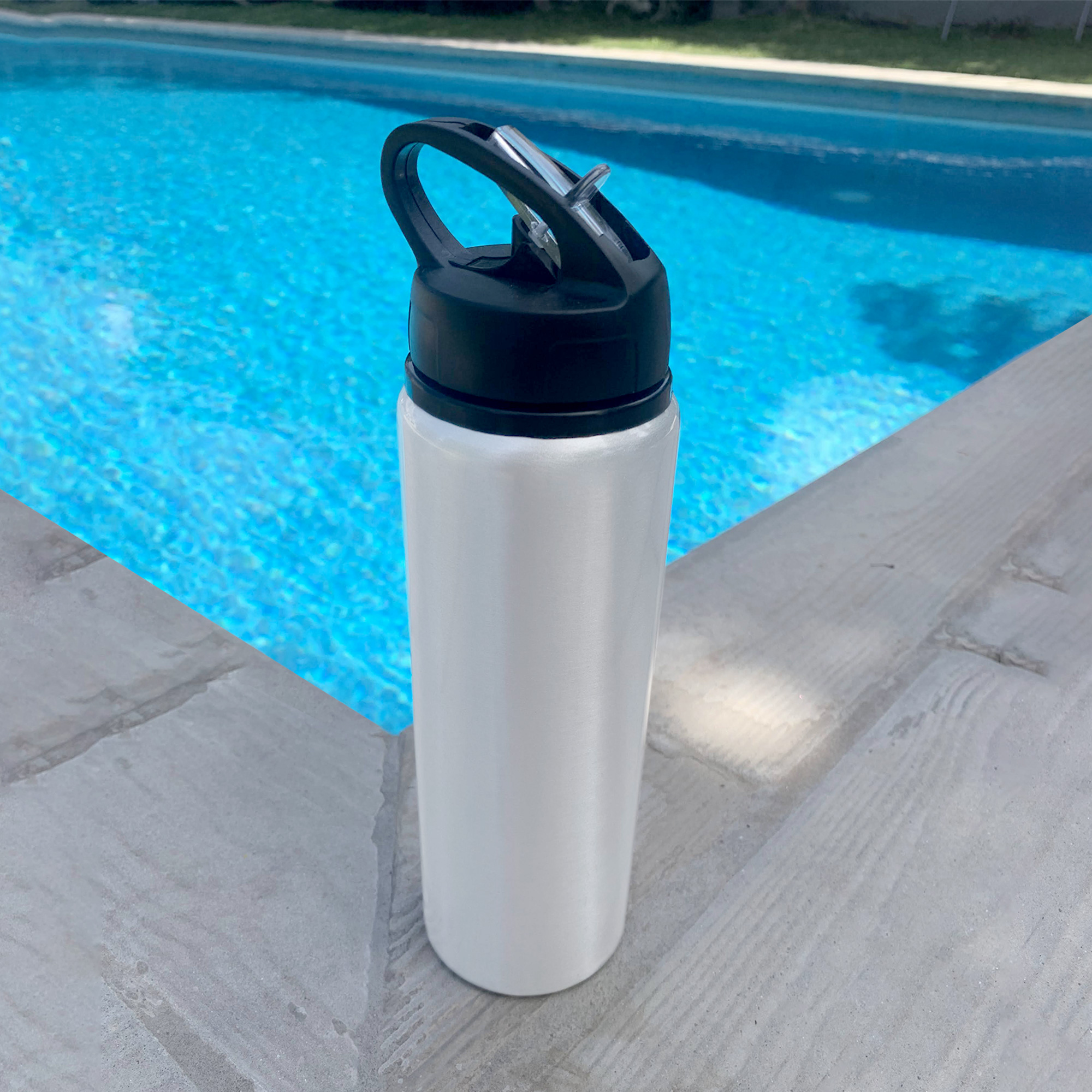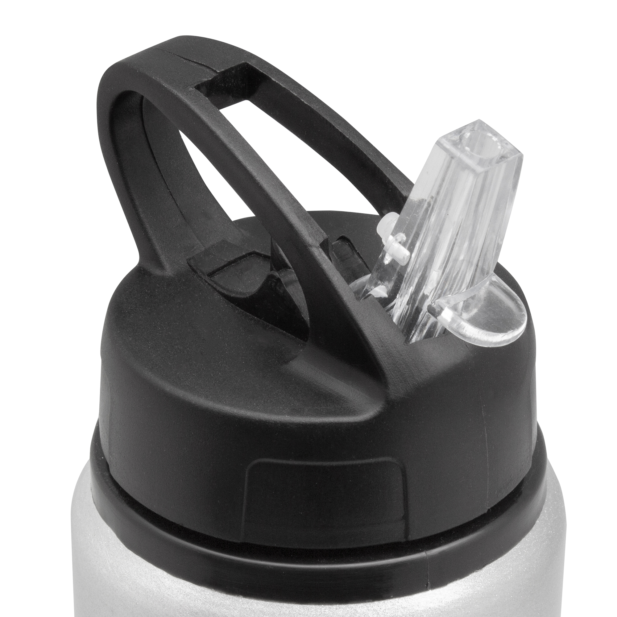 Botella de aluminio con manija de agarre en la tapa, sorbete plástico y boquilla rebatible. Tapa a rosca de plástico.