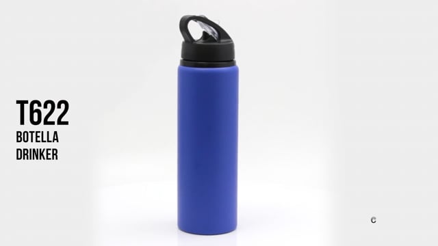 Botella de aluminio con manija de agarre en la tapa, sorbete plástico y boquilla rebatible. Tapa a rosca de plástico.