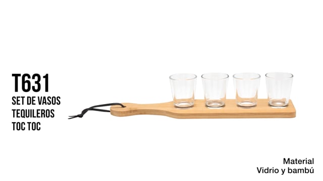 Set de 4 vasos tequileros de Ø 5 x 6 cm. en bandeja de bambú con tira simil cuero.