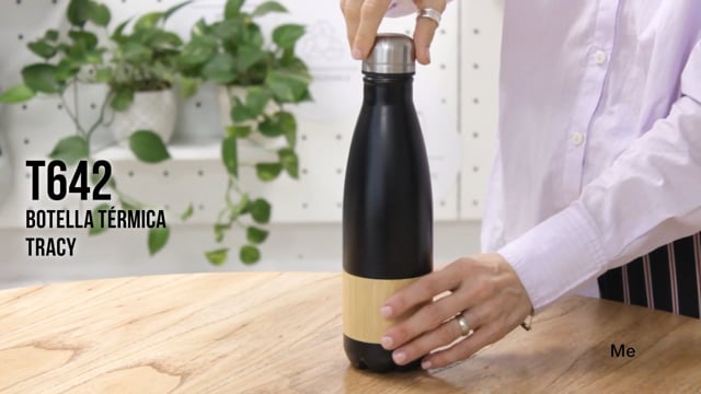 Ø7,4 x 26,8 cm. Capacidad 500 ml. Acero inoxidable. Botella doble pared, sellada al vacío. Interior en acero 304 y exterior en acero 201, con detalles de Bambú. Tapa de acero. Mantiene hasta 12 hs la temperatura de las bebidas calientes y 24 hs de las bebidas frías. Presentación en caja de regalo Kraft.